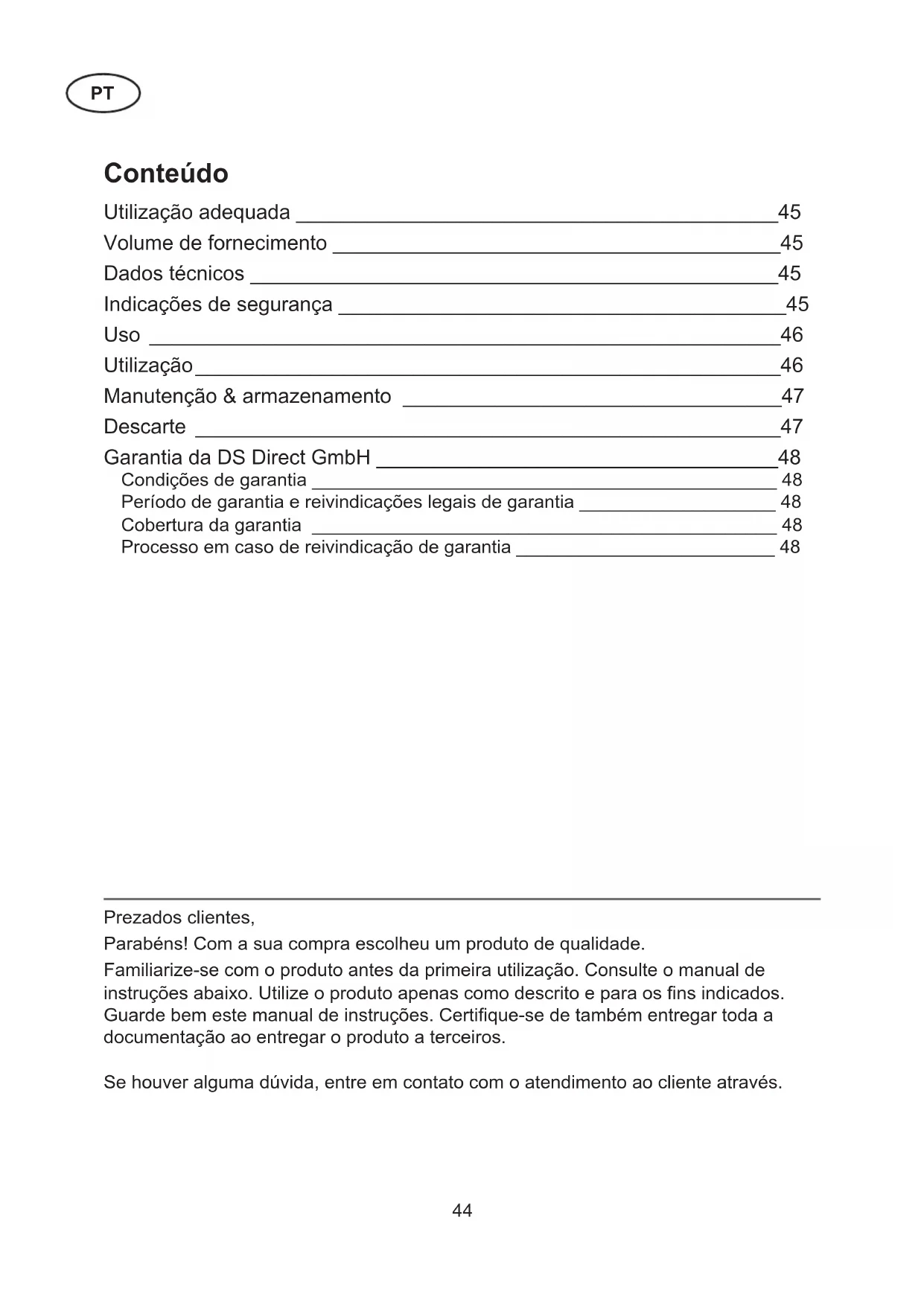 www.service-shopping.de Tel.: +49 38851 314650 *) *) com pagamento48 Garantia da DS Direct GmbH Este produto tem uma garantia de 3 anos a partir da data da compra. Em caso de de- feitos do produto, tem direitos legais em relação ao vendedor. Estes direitos legais não são afetados por nossa garantia mostrada abaixo. Condições de garantia O período de garantia começa a partir da data da compra. Guarde o talão de compra original para referência futura. Este documento é exigido como prova de compra. Se no prazo de três anos a partir da data da compra deste produto ocorrer um erro de material ou de fabricação, o produto será reparado ou substituído por nós, a nosso critério. Esta garantia assume que se, no prazo de três anos, o produto defeituoso e o recibo de com- pra (talão) sejam apresentados e que o defeito seja brevemente descrito por escrito e quando ele ocorreu. Se o defeito for abrangido pela nossa garantia, receber de volta o produto reparado ou um produto novo. Com a reparação ou a substituição do produto, não começa um novo período de garantia. Período de garantia e reivindicações legais de garantia O período de garantia não é estendido pela reivindicação de garantia. Isso vale também para as peças substituídas e reparadas. Quaisquer danos ou defeitos existentes na compra devem ser comunicados imediatamente após a descompactação. Após o perío- do de garantia, os reparos incidentais devem ser pagos. Cobertura da garantia O produto foi fabricado de acordo com rigorosas diretivas de qualidade e foi escrupu- losamente testado antes da entrega. A garantia cobre defeitos de material ou de fabri- cação. Esta garantia não abrange peças dos produtos que estão sujeitas a desgaste normal e que, portanto, pode ser considerado desgaste normal, nem danos em peças frágeis, interruptores, acumuladores, ou peças que sejam feitas de vidro. Esta garantia será anulada se o produto tiver sido danifi cado, se não tiver sido de- vidamente utilizado ou mantido. Para garantir uma utilização adequada do produto é necessário que todas as instruções contidas no manual de instruções sejam seguidos à risca. Usos e ações, desaconselhados no manual de instruções ou dos quais foi avisa- do, devem ser evitados. O produto destina-se apenas ao uso privado e não para o uso comercial. Em caso de manuseio abusivo e impróprio, uso de força e intervenções que não foram realizados pelo nosso representante autorizado anulará a garantia. Processo em caso de reivindicação de garantia Para assegurar um processamento rápido de sua causa, por favor, siga as seguintes instruções: