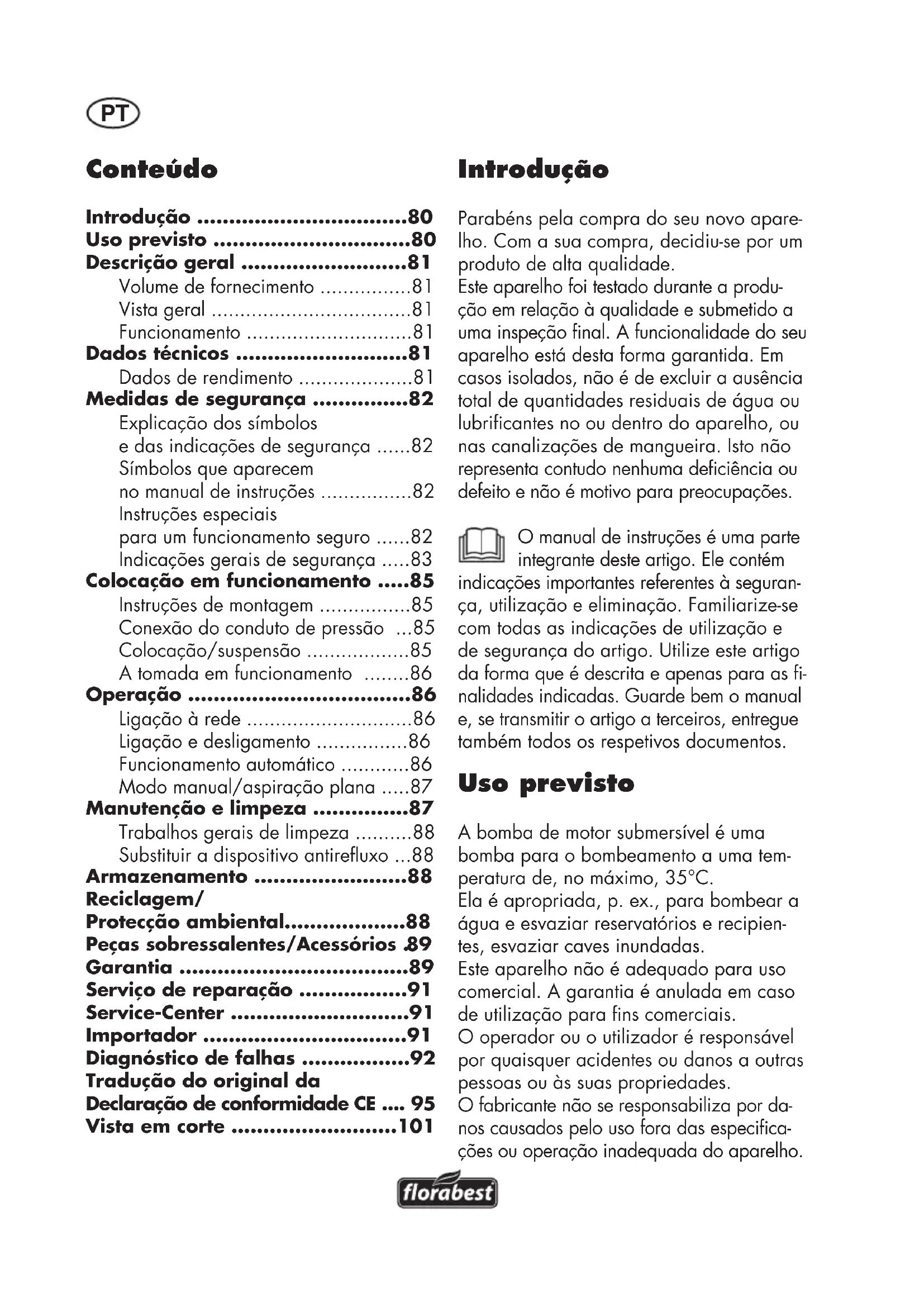 - Introdução Parabéns pela compra do seu novo apare- lho. Com a sua compra, decidiu-se por um produto de alta qualidade. Este aparelho foi testado durante a produ- ção em relação à qualidade e submetido a uma inspeção nal. A funcionalidade do seu aparelho está desta forma garantida. Em casos isolados, não é de excluir a ausência total de quantidades residuais de água ou lubricantes no ou dentro do aparelho, ou nas canalizações de mangueira. Isto não representa contudo nenhuma deciência ou defeito e não é motivo para preocupações. O manual de instruções é uma parte integrante deste artigo. Ele contém indicações importantes referentes à seguran- ça, utilização e eliminação. Familiarize-se com todas as indicações de utilização e de segurança do artigo. Utilize este artigo da forma que é descrita e apenas para as - nalidades indicadas. Guarde bem o manual e, se transmitir o artigo a terceiros, entregue também todos os respetivos documentos. Usoprevisto A bomba de motor submersível é uma bomba para o bombeamento a uma tem- peratura de, no máximo, 35°C. Ela é apropriada, p. ex., para bombear a água e esvaziar reservatórios e recipien- tes, esvaziar caves inundadas. Este aparelho não é adequado para uso comercial. A garantia é anulada em caso de utilização para ns comerciais. O operador ou o utilizador é responsável por quaisquer acidentes ou danos a outras pessoas ou às suas propriedades. O fabricante não se responsabiliza por da- nos causados pelo uso fora das especica- ções ou operação inadequada do aparelho. Conteúdo Introdução p. 80
