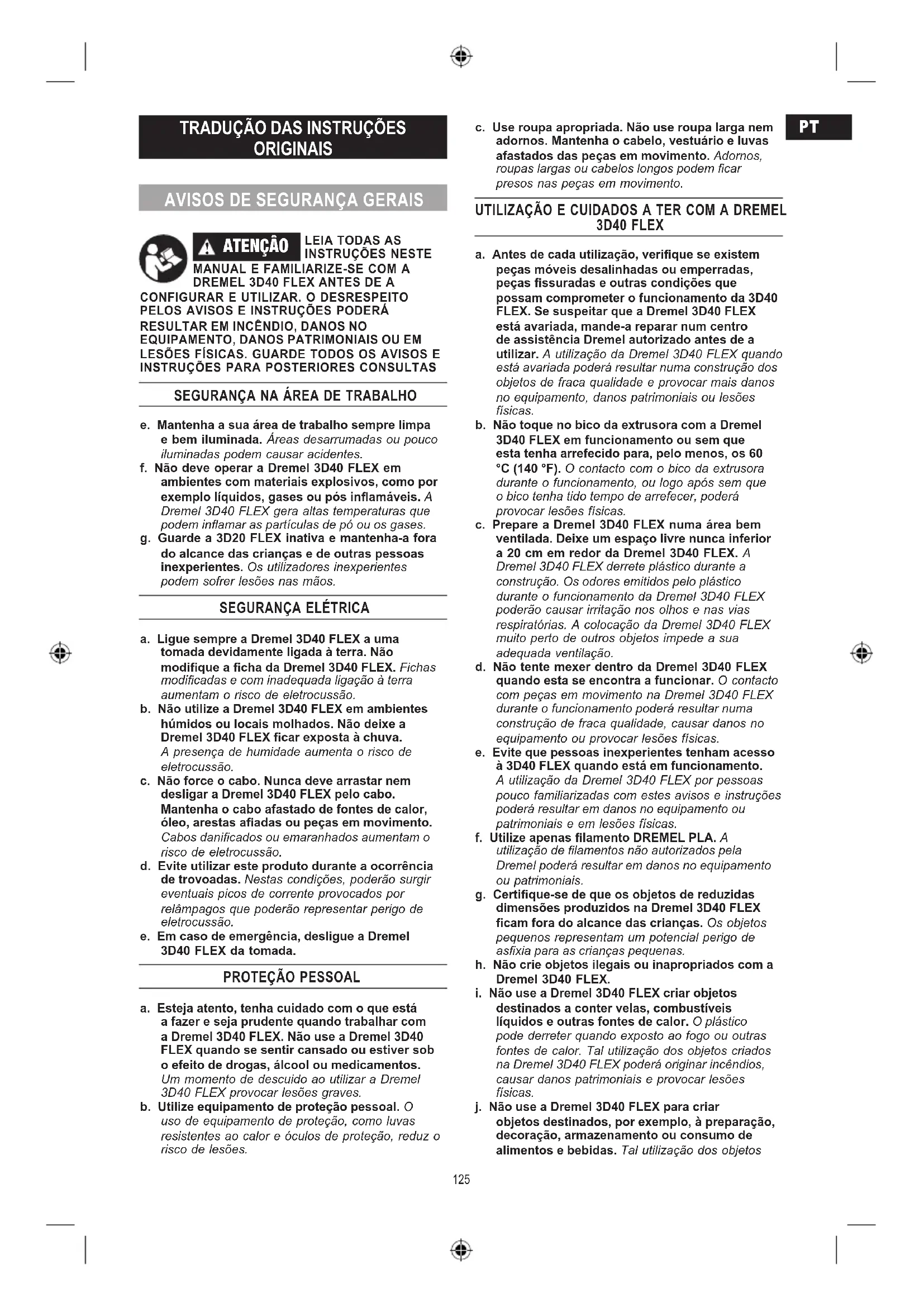 a. Esteja atento, tenha cuidado com o que está a fazer e seja prudente quando trabalhar com a Dremel 3D40 FLEX. Não use a Dremel 3D40 FLEX quando se sentir cansado ou estiver sob o efeito de drogas, álcool ou medicamentos. Um momento de descuido ao utilizar a Dremel 3D40 FLEX provocar lesões graves. b. Utilize equipamento de proteção pessoal. O uso de equipamento de proteção, como luvas resistentes ao calor e óculos de proteção, reduz o risco de lesões. c. Use roupa apropriada. Não use roupa larga nem adornos. Mantenha o cabelo, vestuário e luvas afastados das peças em movimento. Adornos, roupas largas ou cabelos longos podem car presos nas peças em movimento. UTILIZAÇÃO E CUIDADOS A TER COM A DREMEL 3D40 FLEX a. Antes de cada utilização, verique se existem peças móveis desalinhadas ou emperradas, peças ssuradas e outras condições que possam comprometer o funcionamento da 3D40 FLEX. Se suspeitar que a Dremel 3D40 FLEX está avariada, mande-a reparar num centro de assistência Dremel autorizado antes de a utilizar. A utilização da Dremel 3D40 FLEX quando está avariada poderá resultar numa construção dos objetos de fraca qualidade e provocar mais danos no equipamento, danos patrimoniais ou lesões físicas. b. Não toque no bico da extrusora com a Dremel 3D40 FLEX em funcionamento ou sem que esta tenha arrefecido para, pelo menos, os 60 °C (140 °F). O contacto com o bico da extrusora durante o funcionamento, ou logo após sem que o bico tenha tido tempo de arrefecer, poderá provocar lesões físicas. c. Prepare a Dremel 3D40 FLEX numa área bem ventilada. Deixe um espaço livre nunca inferior a 20 cm em redor da Dremel 3D40 FLEX. A Dremel 3D40 FLEX derrete plástico durante a construção. Os odores emitidos pelo plástico durante o funcionamento da Dremel 3D40 FLEX poderão causar irritação nos olhos e nas vias respiratórias. A colocação da Dremel 3D40 FLEX muito perto de outros objetos impede a sua adequada ventilação. d. Não tente mexer dentro da Dremel 3D40 FLEX quando esta se encontra a funcionar. O contacto com peças em movimento na Dremel 3D40 FLEX durante o funcionamento poderá resultar numa construção de fraca qualidade, causar danos no equipamento ou provocar lesões físicas. e. Evite que pessoas inexperientes tenham acesso à 3D40 FLEX quando está em funcionamento. A utilização da Dremel 3D40 FLEX por pessoas pouco familiarizadas com estes avisos e instruções poderá resultar em danos no equipamento ou patrimoniais e em lesões físicas. f. Utilize apenas lamento DREMEL PLA. A utilização de lamentos não autorizados pela Dremel poderá resultar em danos no equipamento ou patrimoniais. g. Certique-se de que os objetos de reduzidas dimensões produzidos na Dremel 3D40 FLEX cam fora do alcance das crianças. Os objetos pequenos representam um potencial perigo de asxia para as crianças pequenas. h. Não crie objetos ilegais ou inapropriados com a Dremel 3D40 FLEX.