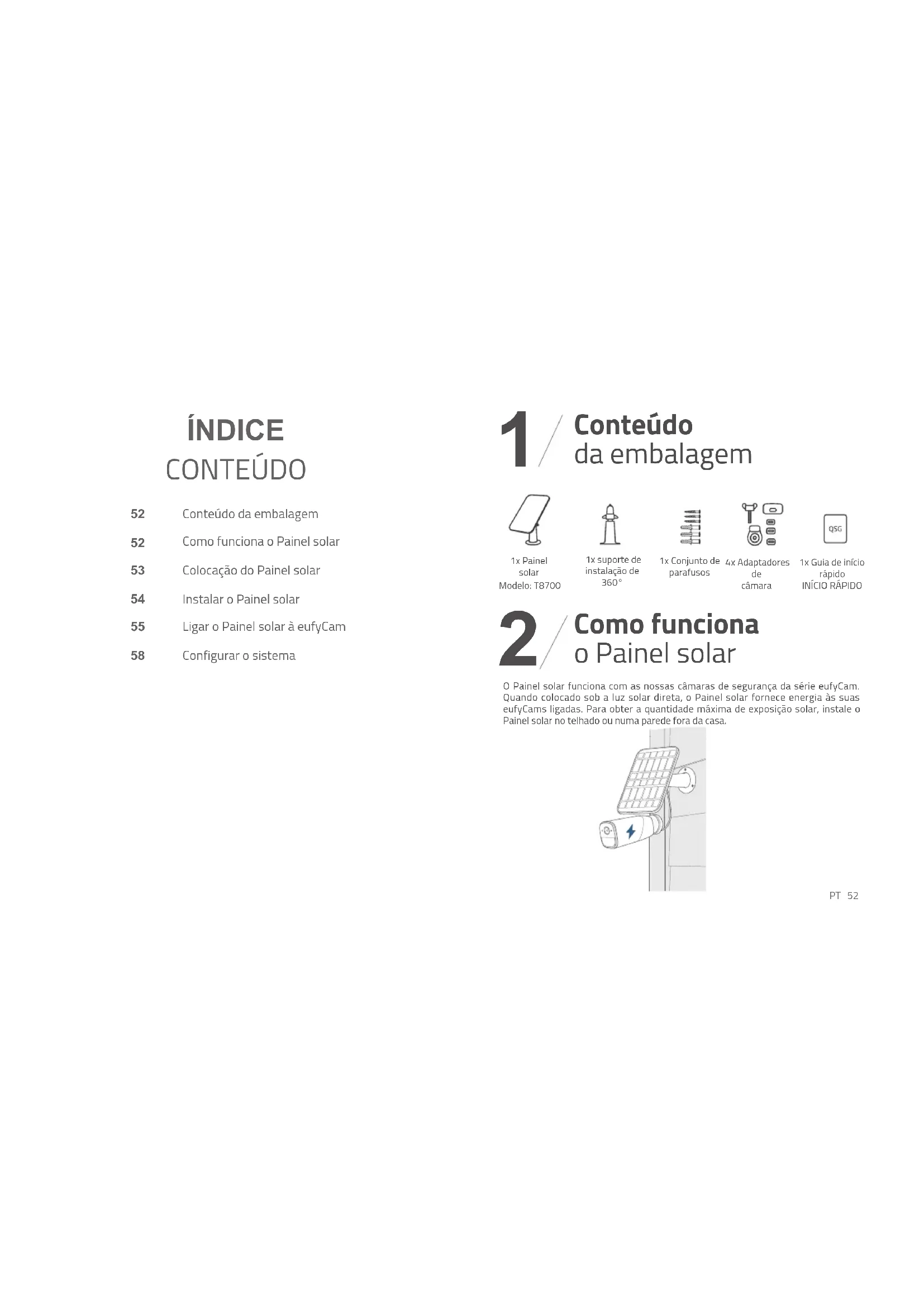 1x Painel solarModelo: T87001x suporte de instalação de 360° O Painel solar funciona com as nossas câmaras de segurança da série eufyCam. Quando colocado sob a luz solar direta, o Painel solar fornece energia às suas eufyCams ligadas. Para obter a quantidade máxima de exposição solar, instale o Painel solar no telhado ou numa parede fora da casa. 1x Conjunto de parafusos4x Adaptadores câmara1x Guia de início rápidoINÍCIO RÁPIDO53 PT PT 54 Durante a colocação do Painel solar, tenha atenção aos seguintes fatores. Estes fatores poderão afetar a eficiência do painel solar: