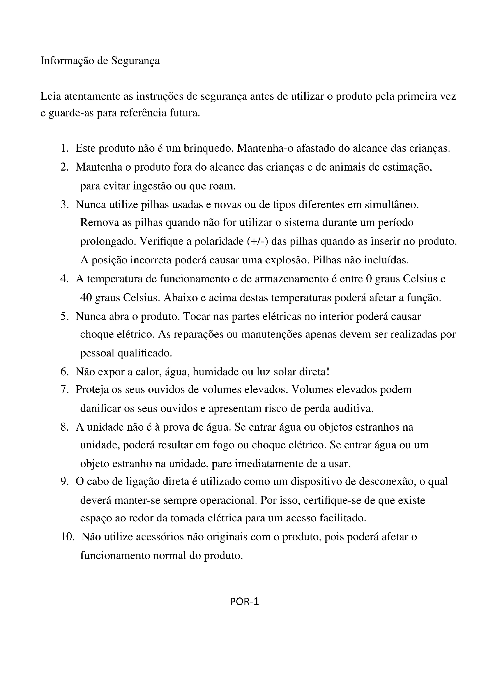 1. Este produto não é um brinquedo. Mantenha-o afastado do alcance das crianças.