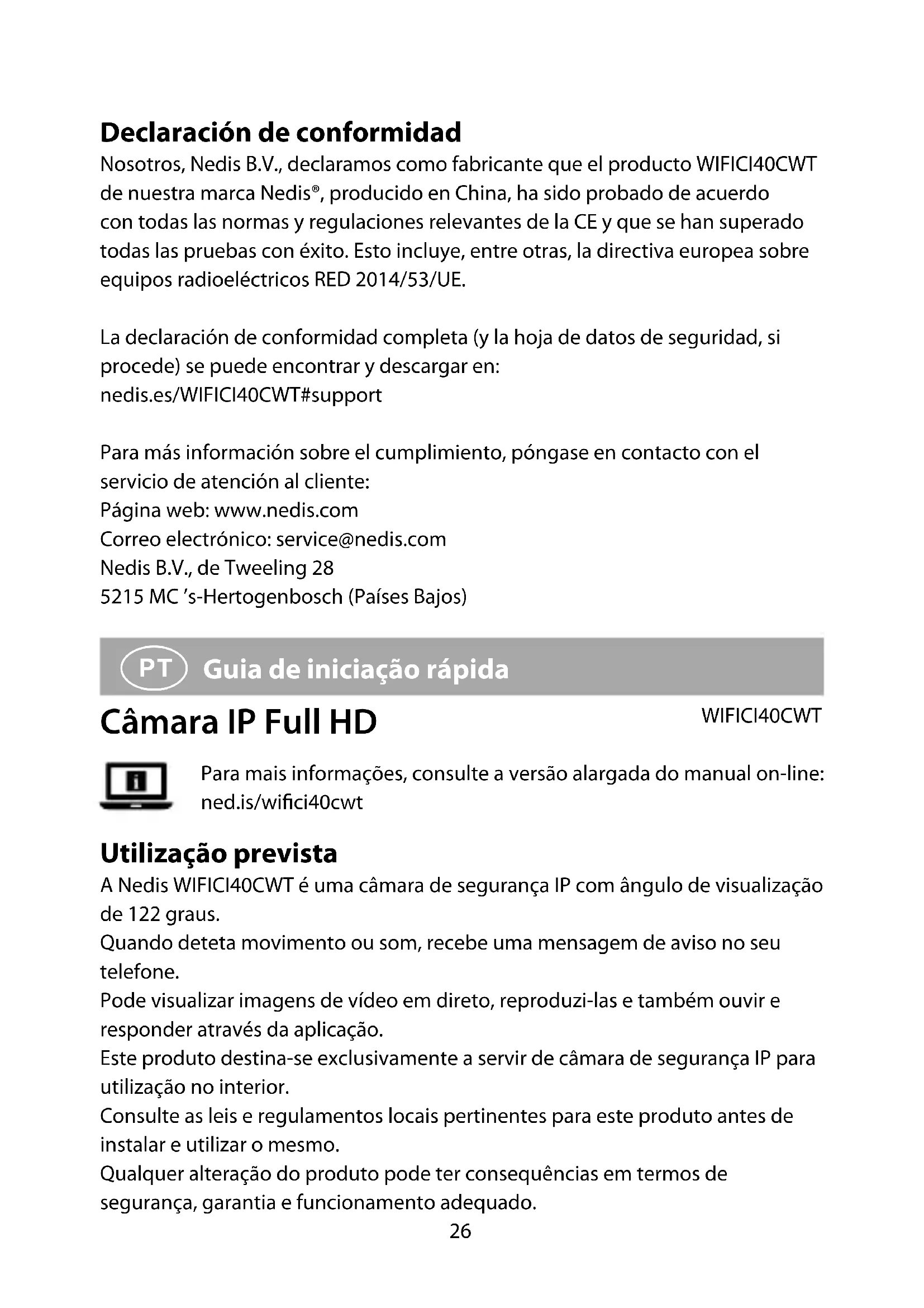 - Mantenha a câmara a, pelo menos, 1 metro de quaisquer dispositivos sem os, incluindo routers Wi-Fi e telefones, para evitar interferências sem os. Declaração de conformidade A Nedis B.V. declara, na qualidade de fabricante, que o produto WIFICI40CWT da nossa marca Nedis®, produzido na China, foi testado em conformidade com todas as normas e regulamentos CE relevantes e que todos os testes foram concluídos com sucesso. Os mesmos incluem, entre outros, o regulamento RED 2014/53/UE. A Declaração de conformidade (e a cha de dados de segurança, se aplicável) pode ser consultada e descarregada em: nedis.pt/WIFICI40CWT#support Para informações adicionais relativas à conformidade, contacte a assistência ao cliente: Site: www.nedis.com E-mail: service@nedis.com Nedis B.V., de Tweeling 28 5215 MC ’s-Hertogenbosch, Países Baixos30