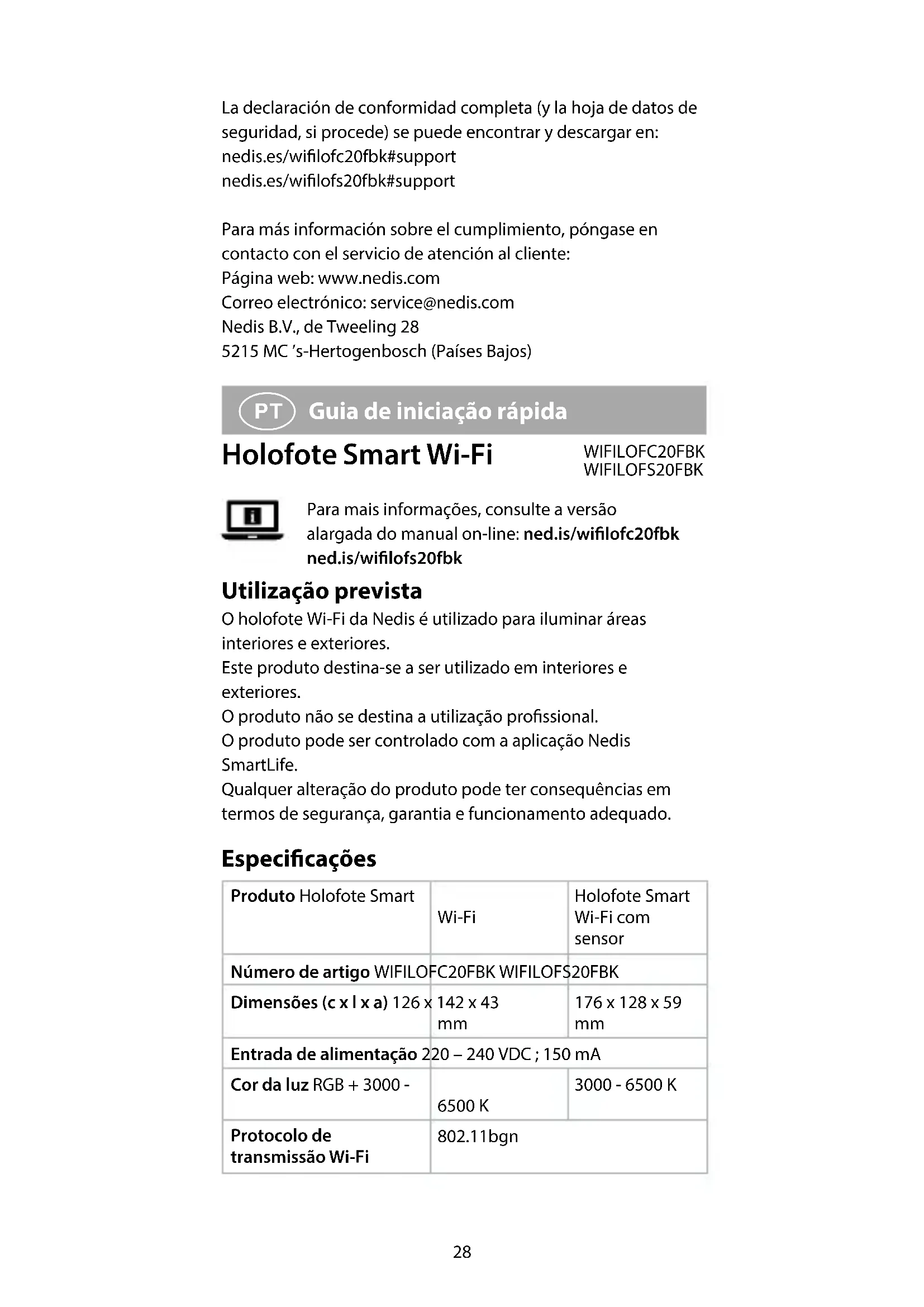 O produto entra em modo de espera depois de decorrido o período completo da luz de espera.32 Declaração de conformidade A Nedis B.V. declara, na qualidade de fabricante, que o produto WIFILOFC20FBK / WIFILOFS20FBK da nossa marca Nedis