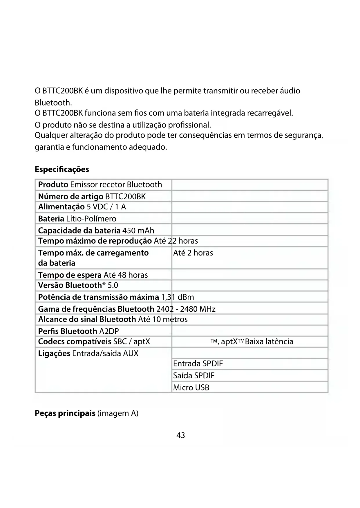 Guia de iniciação rápida Emissor recetor Bluetooth BTTC200BK Para mais informações, consulte a versão alargada do manual on-line: ned.is/bttc200bk Utilização prevista43 O BTTC200BK é um dispositivo que lhe permite transmitir ou receber áudio Bluetooth. O BTTC200BK funciona sem fios com uma bateria integrada recarregável. O produto não se destina a utilização profissional. Qualquer alteração do produto pode ter consequências em termos de segurança, garantia e funcionamento adequado. Especicações Produto Emissor recetor Bluetooth Número de artigo BTTC200BK Alimentação 5 VDC / 1 A Bateria Lítio-Polímero Capacidade da bateria 450 mAh Tempo máximo de reprodução Até 22 horas Tempo máx. de carregamento da bateria Até 2 horas Tempo de espera Até 48 horas Versão Bluetooth® 5.0 Potência de transmissão máxima 1,31 dBm Gama de frequências Bluetooth 2402 - 2480 MHz Alcance do sinal Bluetooth Até 10 metros Pers Bluetooth A2DP Codecs compatíveis SBC / aptX