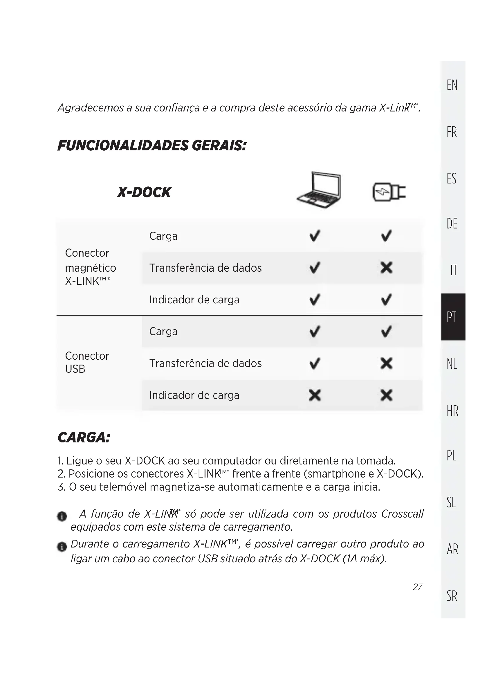 A função de X-LINK TM* só pode ser utilizada com os produtos Crosscall equipados com este sistema de carregamento. Durante o carregamento X-LINK TM* , é possível carregar outro produto ao ligar um cabo ao conector USB situado atrás do X-DOCK (1A máx). Agradecemos a sua confiança e a compra deste acessório da gama X-Link TM*