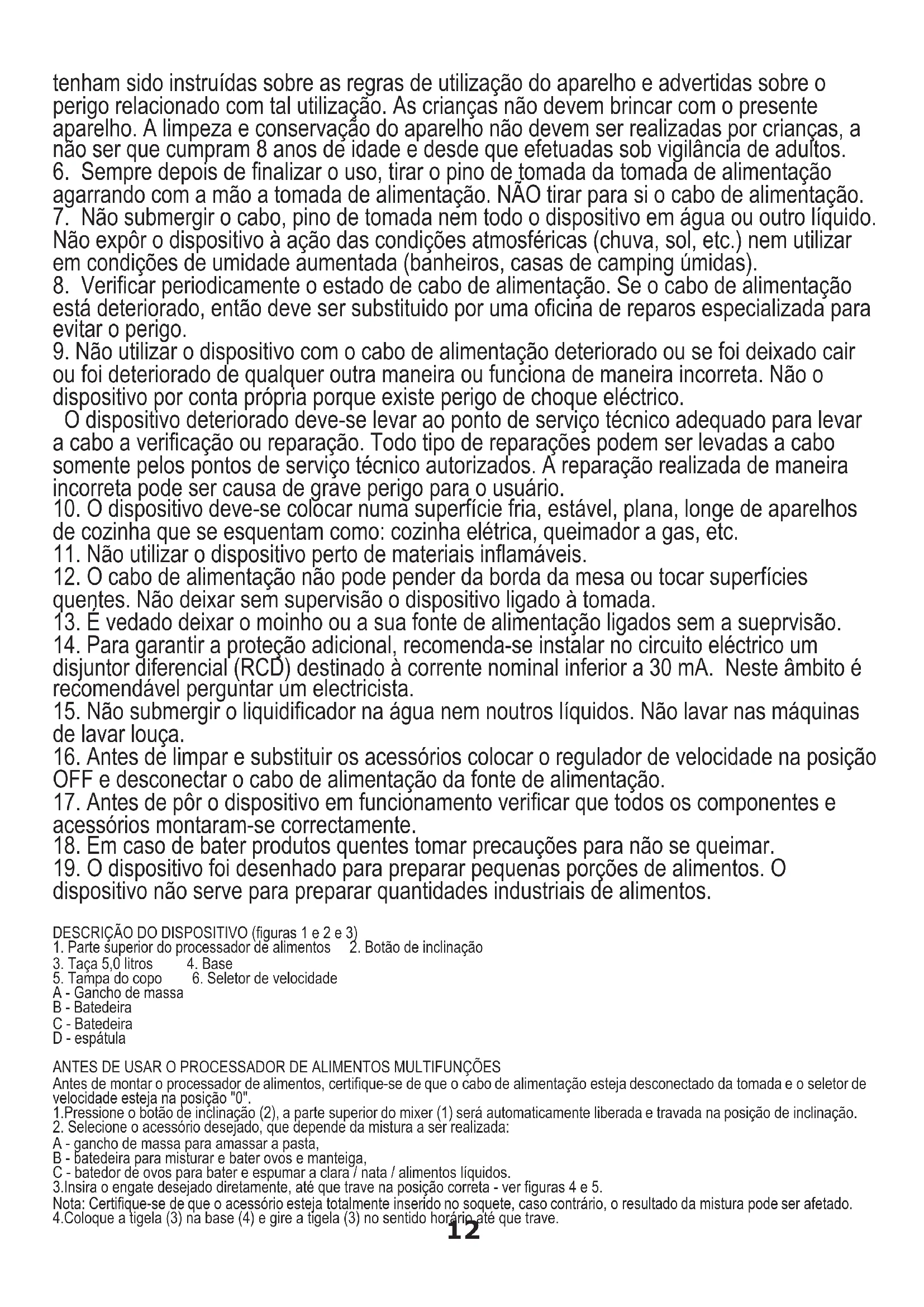 ou foi deteriorado de qualquer outra maneira ou funciona de maneira incorreta. Não o dispositivo por conta própria porque existe perigo de choque eléctrico. ANTES DE USAR O PROCESSADOR DE ALIMENTOS MULTIFUNÇÕES