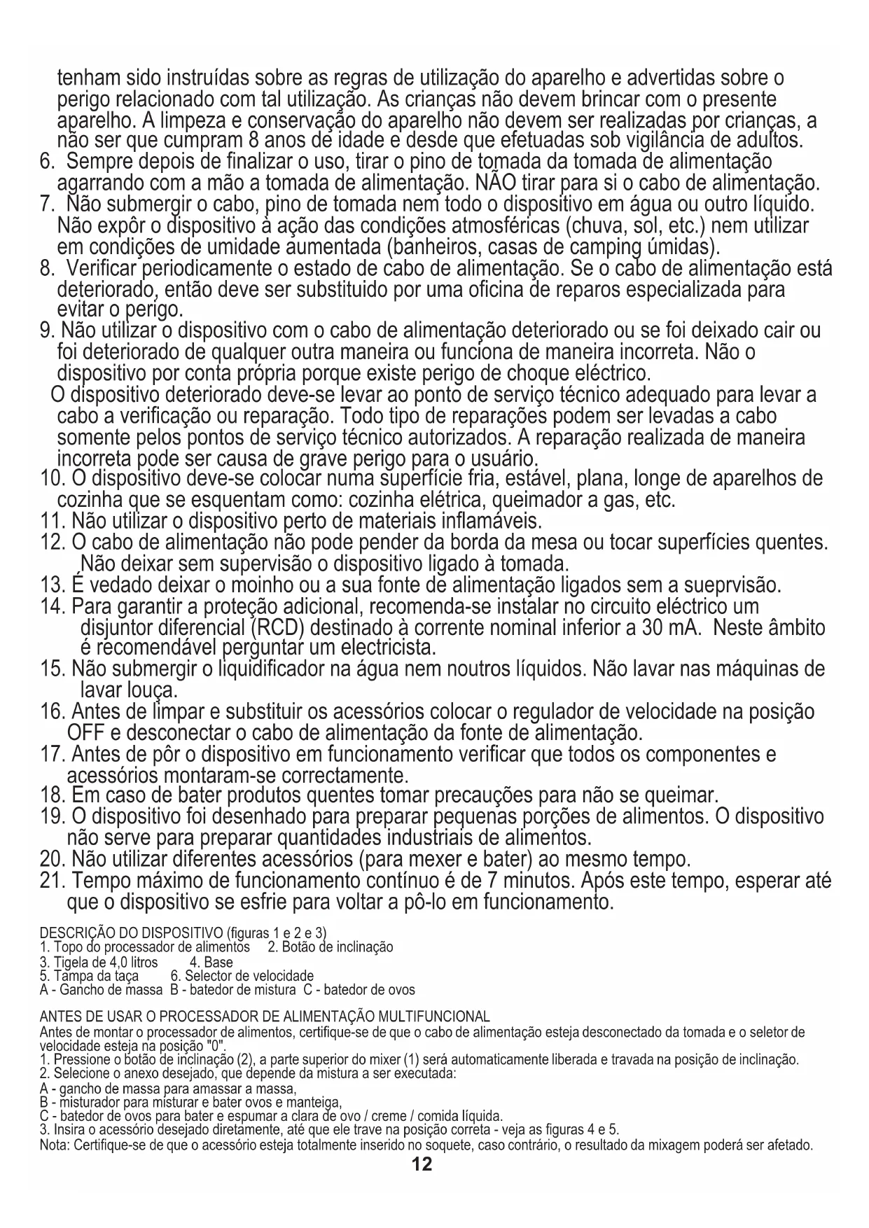 Anexo A: adequado para velocidades 1-3. Tempo de operação: na velocidade 1 e 2 é de 30 segundos, na velocidade 3 é de 3-5 minutos. 5. Para abaixar a parte superior do processador de alimentos (1), pressione o botão de inclinação (2) e empurre com uma mão a parte superior do processador de alimentos (1) para baixo. Um som de clique será ouvido quando a cabeça atingir a posição correta. Certifique- se de que a tampa da proa (5) esteja fixada no lugar (veja a figura 1). 5. Mantenha pressionado o botão de inclinação (2), a parte superior do mixer (1) será automaticamente levantada e travada na posição de inclinação. Acessório C: adequado para velocidade 5-6. Melodia de operação: 5-7 minutos. Para bater as claras, use um mínimo de 3 ovos e um máximo de 12 ovos. 3. O tempo máximo de operação em um ciclo não deve exceder 7 minutos e 40 minutos o tempo mínimo de descanso deve ser mantido entre 2 ciclos consecutivos. Tempo máximo de operação em um ciclo: 7 minutos.