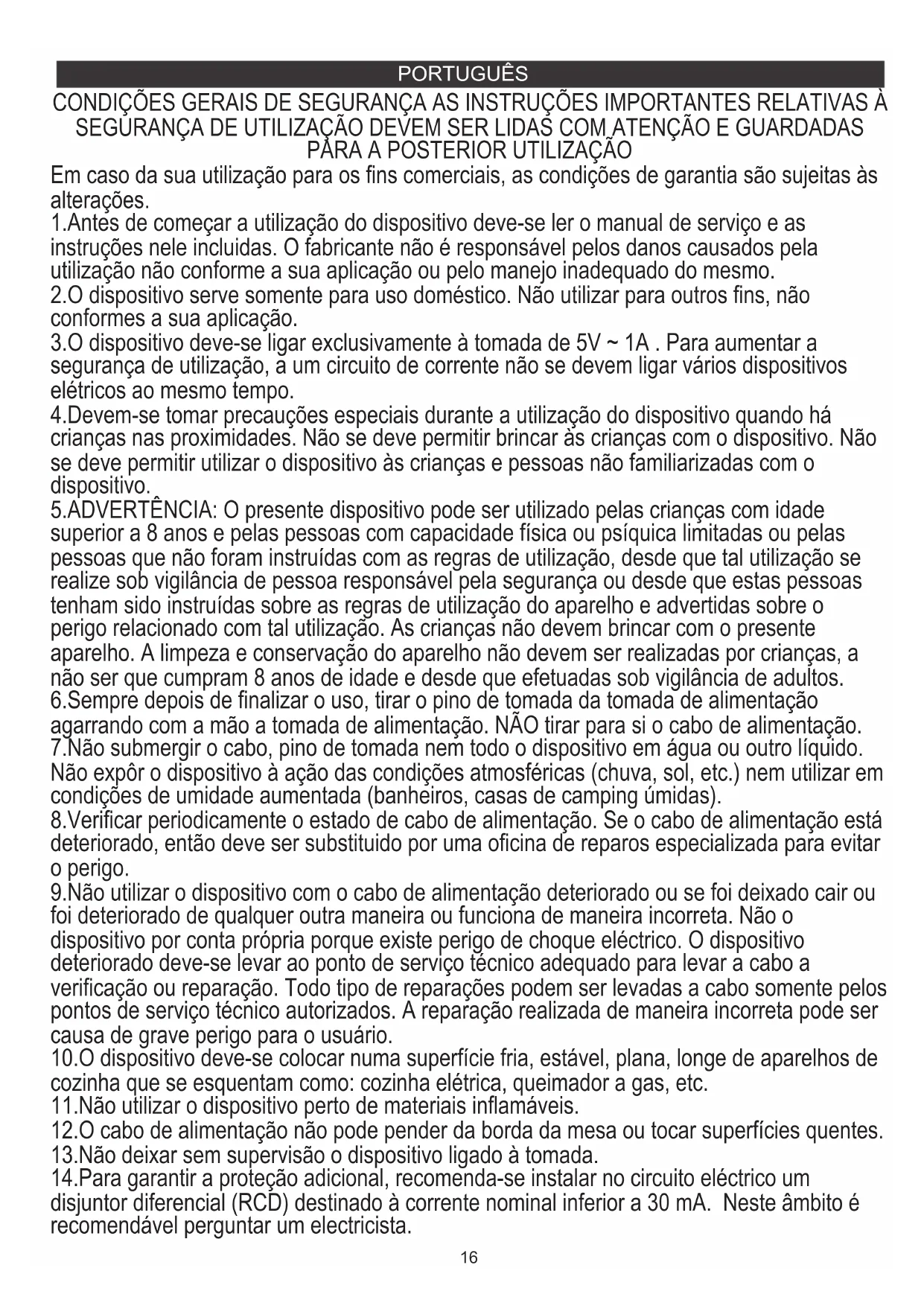 Em caso da sua utilização para os fins comerciais, as condições de garantia são sujeitas às alterações. 1.Antes de começar a utilização do dispositivo deve-se ler o manual de serviço e as instruções nele incluidas. O fabricante não é responsável pelos danos causados pela utilização não conforme a sua aplicação ou pelo manejo inadequado do mesmo. 2.O dispositivo serve somente para uso doméstico. Não utilizar para outros fins, não conformes a sua aplicação. 3.O dispositivo deve-se ligar exclusivamente à tomada de 5V ~ 1A . Para aumentar a segurança de utilização, a um circuito de corrente não se devem ligar vários dispositivos elétricos ao mesmo tempo. 4.Devem-se tomar precauções especiais durante a utilização do dispositivo quando há crianças nas proximidades. Não se deve permitir brincar às crianças com o dispositivo. Não se deve permitir utilizar o dispositivo às crianças e pessoas não familiarizadas com o dispositivo. 5.ADVERTÊNCIA: O presente dispositivo pode ser utilizado pelas crianças com idade superior a 8 anos e pelas pessoas com capacidade física ou psíquica limitadas ou pelas pessoas que não foram instruídas com as regras de utilização, desde que tal utilização se realize sob vigilância de pessoa responsável pela segurança ou desde que estas pessoas tenham sido instruídas sobre as regras de utilização do aparelho e advertidas sobre o perigo relacionado com tal utilização. As crianças não devem brincar com o presente aparelho. A limpeza e conservação do aparelho não devem ser realizadas por crianças, a não ser que cumpram 8 anos de idade e desde que efetuadas sob vigilância de adultos. 6.Sempre depois de finalizar o uso, tirar o pino de tomada da tomada de alimentação agarrando com a mão a tomada de alimentação. NÃO tirar para si o cabo de alimentação. 7.Não submergir o cabo, pino de tomada nem todo o dispositivo em água ou outro líquido. Não expôr o dispositivo à ação das condições atmosféricas (chuva, sol, etc.) nem utilizar em condições de umidade aumentada (banheiros, casas de camping úmidas). 8.Verificar periodicamente o estado de cabo de alimentação. Se o cabo de alimentação está deteriorado, então deve ser substituido por uma oficina de reparos especializada para evitar o perigo. 9.Não utilizar o dispositivo com o cabo de alimentação deteriorado ou se foi deixado cair ou foi deteriorado de qualquer outra maneira ou funciona de maneira incorreta. Não o dispositivo por conta própria porque existe perigo de choque eléctrico. O dispositivo deteriorado deve-se levar ao ponto de serviço técnico adequado para levar a cabo a verificação ou reparação. Todo tipo de reparações podem ser levadas a cabo somente pelos pontos de serviço técnico autorizados. A reparação realizada de maneira incorreta pode ser causa de grave perigo para o usuário. 10.O dispositivo deve-se colocar numa superfície fria, estável, plana, longe de aparelhos de cozinha que se esquentam como: cozinha elétrica, queimador a gas, etc. 11.Não utilizar o dispositivo perto de materiais inflamáveis. 12.O cabo de alimentação não pode pender da borda da mesa ou tocar superfícies quentes. 13.Não deixar sem supervisão o dispositivo ligado à tomada. 14.Para garantir a proteção adicional, recomenda-se instalar no circuito eléctrico um disjuntor diferencial (RCD) destinado à corrente nominal inferior a 30 mA. Neste âmbito é recomendável perguntar um electricista.17 Para remover e prender consulte as Fig. 1, 2, 3. Ao prender, alinhe a parte interna mostrada na fig. 3 subponto 2 com a ranhura do dispositivo no dispositivo mostrado na fig. 3 subponto 1. E então pressione firmemente em direção ao dispositivo até que ele se encaixe