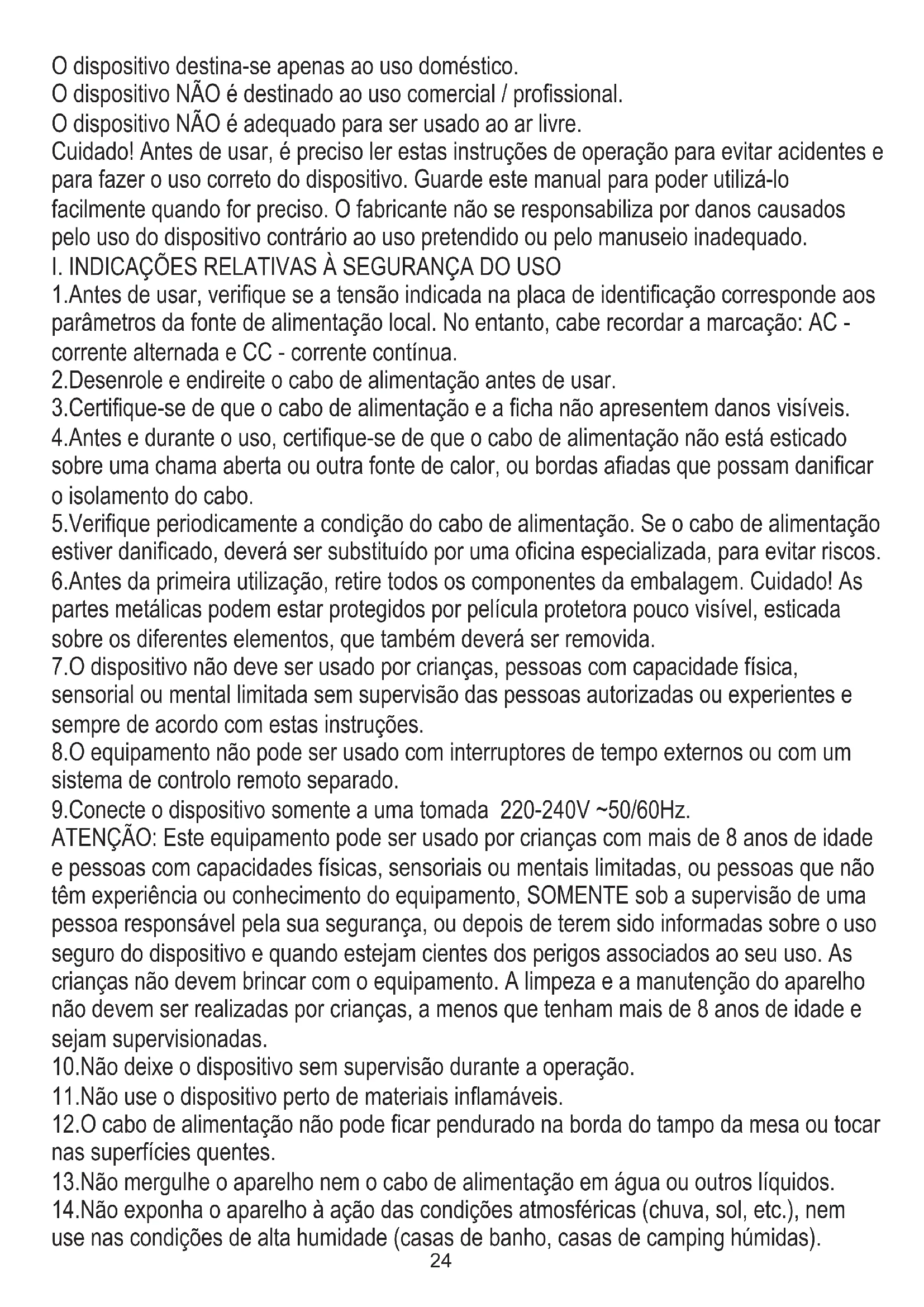 16.Ao puxar a ficha da tomada, nunca puxe o cabo de alimentação, só pela ficha. 17.O fabricante não se responsabiliza por danos resultantes do uso inadequado do dispositivo.
