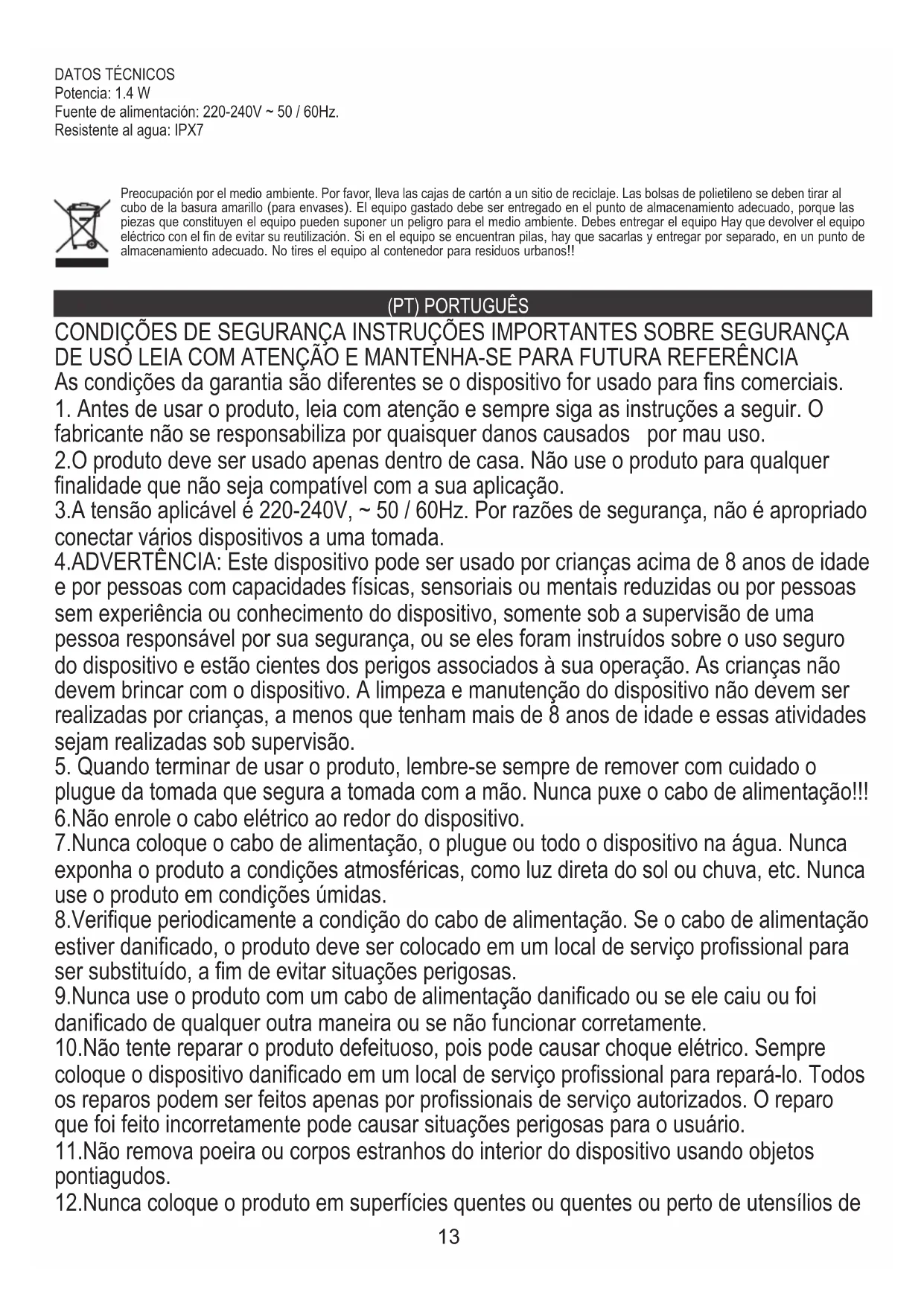 Potência: 1.4W Fonte de alimentação: 220-240V ~ 50 / 60Hz. Impermeável: IPX7 Protecção do meio ambiente. Rogamos, os embalagens de cartão destinem-se para papéis velhos. Os sacos de polietileno (PE) devem-se colocar em contenedores para material plástico. O dispositivo usado deve-se levar a um ponto de armazenamento adequado porque os componentes perigosos que ficam dentro do dispositivo podem ser perigosos para o meio ambiente. O dispositivo elétrico deve-se entregar de modo que se reduza a sua nova utilização e uso. Se no dispositivo há pilhas, devem-se tirar e levar a um ponto de armazenamento em separado. Não colocar o dispositivo em contenedores para resíduos municipais!! (LT) LIETUVIŲ 3.Tinkama įtampa yra 220–240 V, ~ 50 / 60Hz. Saugos sumetimais nėra tikslinga prie vieno maitinimo lizdo prijungti kelis įrenginius.