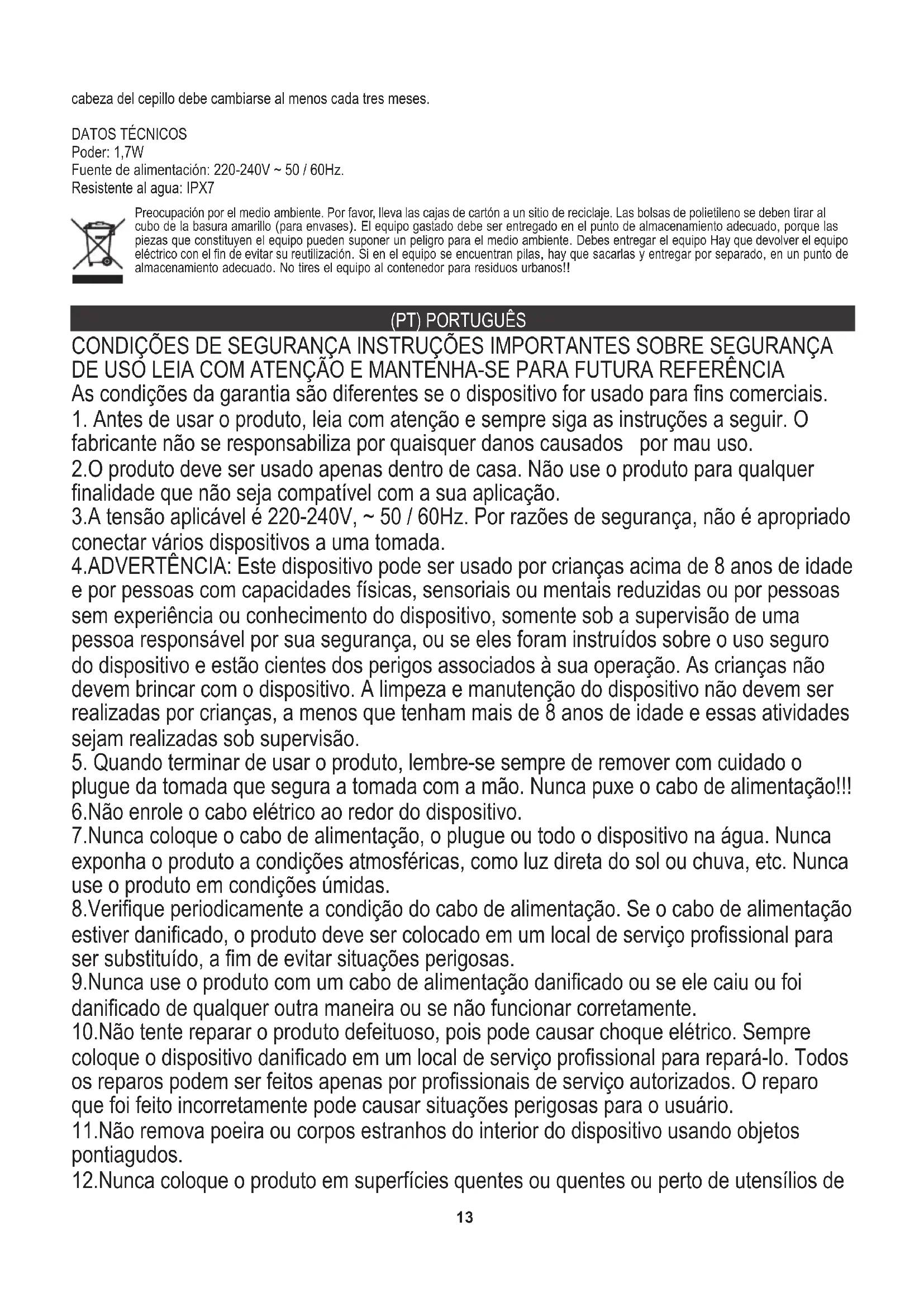 fabricante não se responsabiliza por quaisquer danos causados por mau uso. 2.O produto deve ser usado apenas dentro de casa. Não use o produto para qualquer finalidade que não seja compatível com a sua aplicação. 3.A tensão aplicável é 220-240V, ~ 50 / 60Hz. Por razões de segurança, não é apropriado conectar vários dispositivos a uma tomada. 4.ADVERTÊNCIA: Este dispositivo pode ser usado por crianças acima de 8 anos de idade e por pessoas com capacidades físicas, sensoriais ou mentais reduzidas ou por pessoas sem experiência ou conhecimento do dispositivo, somente sob a supervisão de uma pessoa responsável por sua segurança, ou se eles foram instruídos sobre o uso seguro do dispositivo e estão cientes dos perigos associados à sua operação. As crianças não devem brincar com o dispositivo. A limpeza e manutenção do dispositivo não devem ser realizadas por crianças, a menos que tenham mais de 8 anos de idade e essas atividades sejam realizadas sob supervisão.