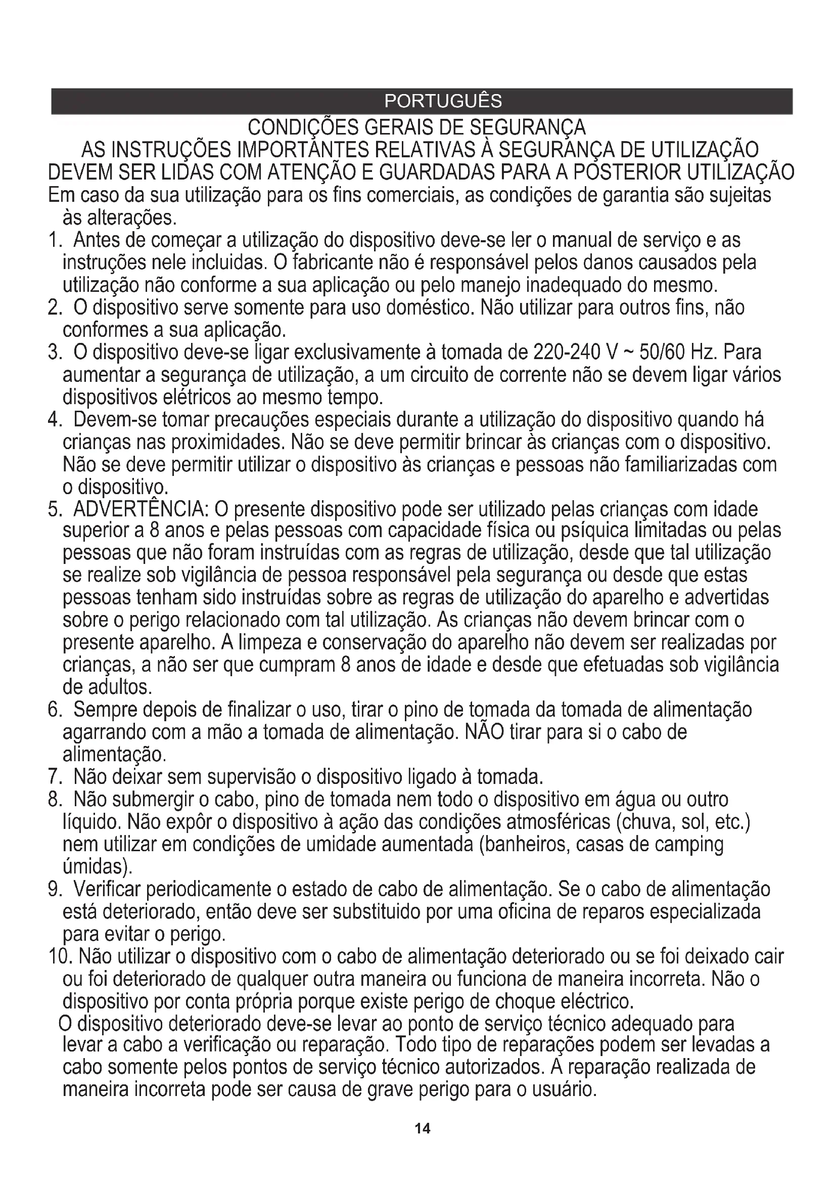 10. Não utilizar o dispositivo com o cabo de alimentação deteriorado ou se foi deixado cair