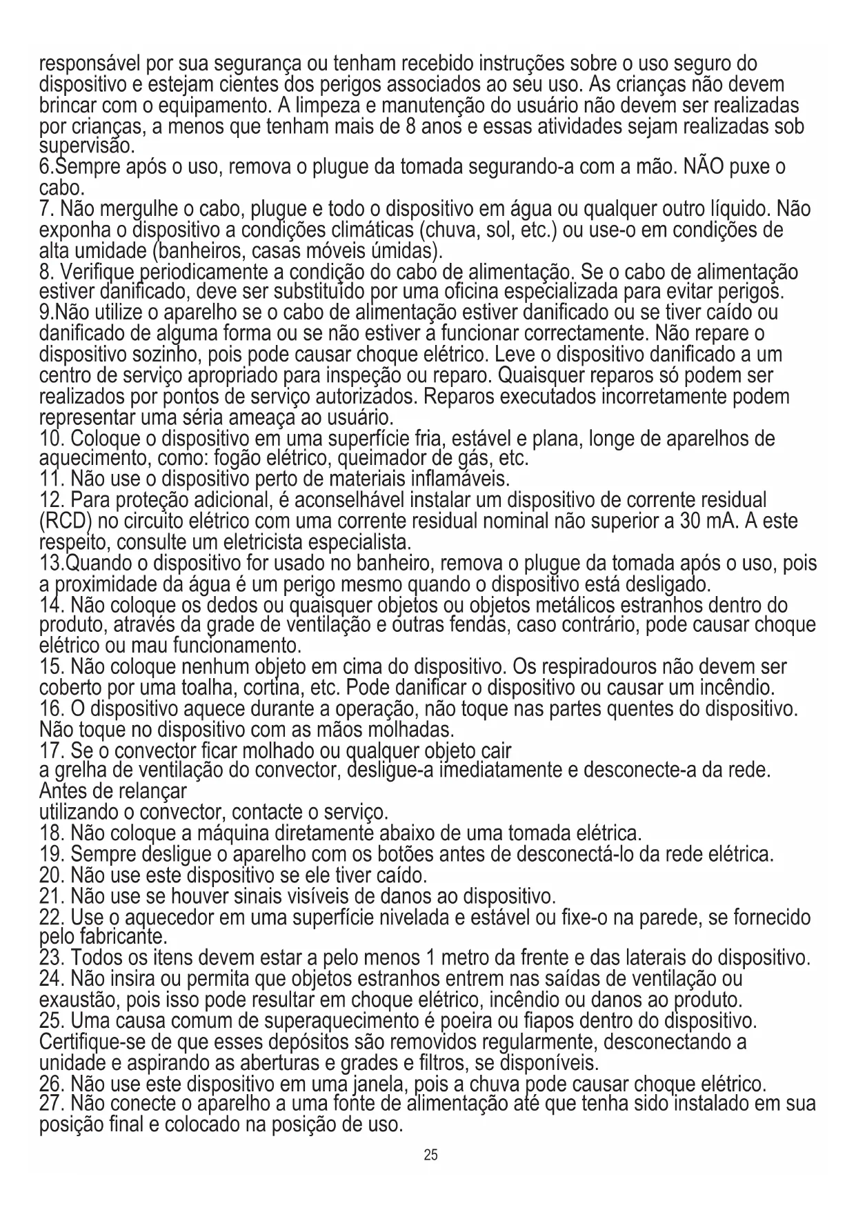 22. Use o aquecedor em uma superfície nivelada e estável ou fixe-o na parede, se fornecido