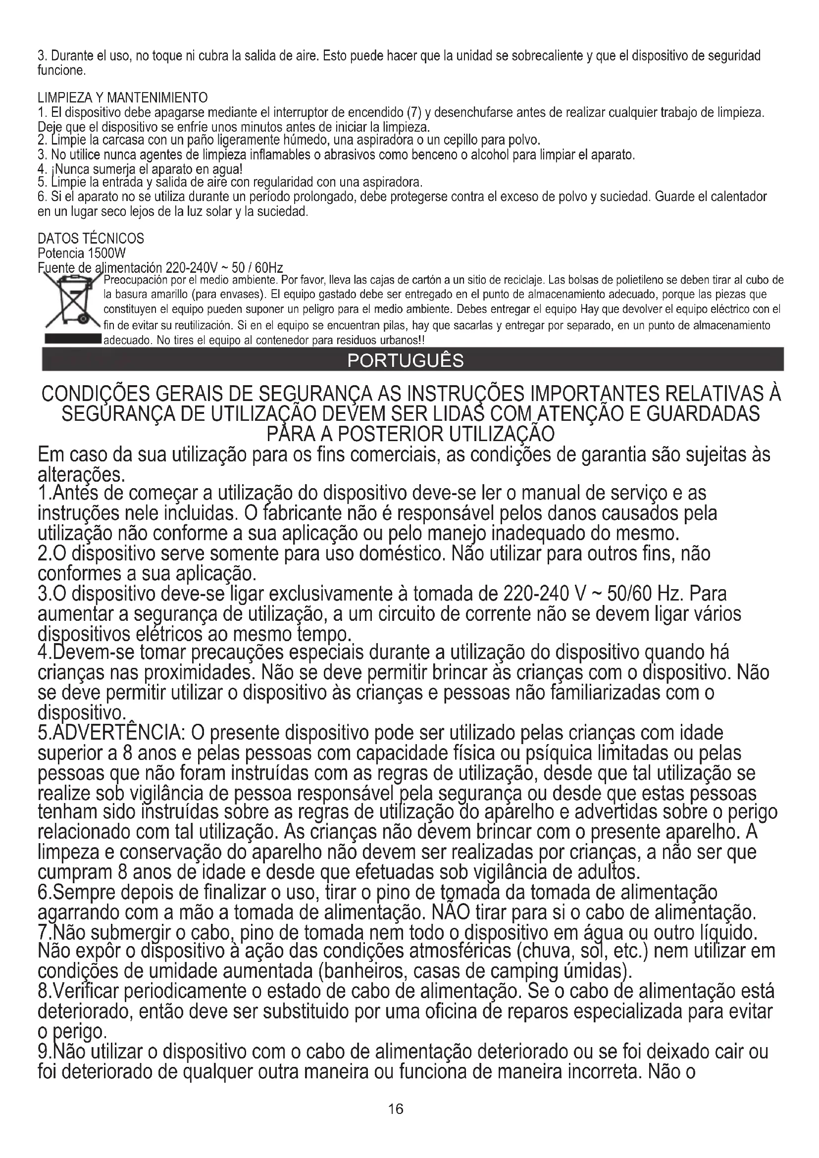 Em caso da sua utilização para os fins comerciais, as condições de garantia são sujeitas às alterações. 1.Antes de começar a utilização do dispositivo deve-se ler o manual de serviço e as instruções nele incluidas. O fabricante não é responsável pelos danos causados pela utilização não conforme a sua aplicação ou pelo manejo inadequado do mesmo. 2.O dispositivo serve somente para uso doméstico. Não utilizar para outros fins, não conformes a sua aplicação. 3.O dispositivo deve-se ligar exclusivamente à tomada de 220-240 V ~ 50/60 Hz. Para aumentar a segurança de utilização, a um circuito de corrente não se devem ligar vários dispositivos elétricos ao mesmo tempo. 4.Devem-se tomar precauções especiais durante a utilização do dispositivo quando há crianças nas proximidades. Não se deve permitir brincar às crianças com o dispositivo. Não se deve permitir utilizar o dispositivo às crianças e pessoas não familiarizadas com o dispositivo. 5.ADVERTÊNCIA: O presente dispositivo pode ser utilizado pelas crianças com idade superior a 8 anos e pelas pessoas com capacidade física ou psíquica limitadas ou pelas pessoas que não foram instruídas com as regras de utilização, desde que tal utilização se realize sob vigilância de pessoa responsável pela segurança ou desde que estas pessoas tenham sido instruídas sobre as regras de utilização do aparelho e advertidas sobre o perigo relacionado com tal utilização. As crianças não devem brincar com o presente aparelho. A limpeza e conservação do aparelho não devem ser realizadas por crianças, a não ser que cumpram 8 anos de idade e desde que efetuadas sob vigilância de adultos. 6.Sempre depois de finalizar o uso, tirar o pino de tomada da tomada de alimentação agarrando com a mão a tomada de alimentação. NÃO tirar para si o cabo de alimentação. 7.Não submergir o cabo, pino de tomada nem todo o dispositivo em água ou outro líquido. Não expôr o dispositivo à ação das condições atmosféricas (chuva, sol, etc.) nem utilizar em condições de umidade aumentada (banheiros, casas de camping úmidas). 8.Verificar periodicamente o estado de cabo de alimentação. Se o cabo de alimentação está deteriorado, então deve ser substituido por uma oficina de reparos especializada para evitar o perigo. 9.Não utilizar o dispositivo com o cabo de alimentação deteriorado ou se foi deixado cair ou foi deteriorado de qualquer outra maneira ou funciona de maneira incorreta. Não o 3. Durante el uso, no toque ni cubra la salida de aire. Esto puede hacer que la unidad se sobrecaliente y que el dispositivo de seguridad funcione.