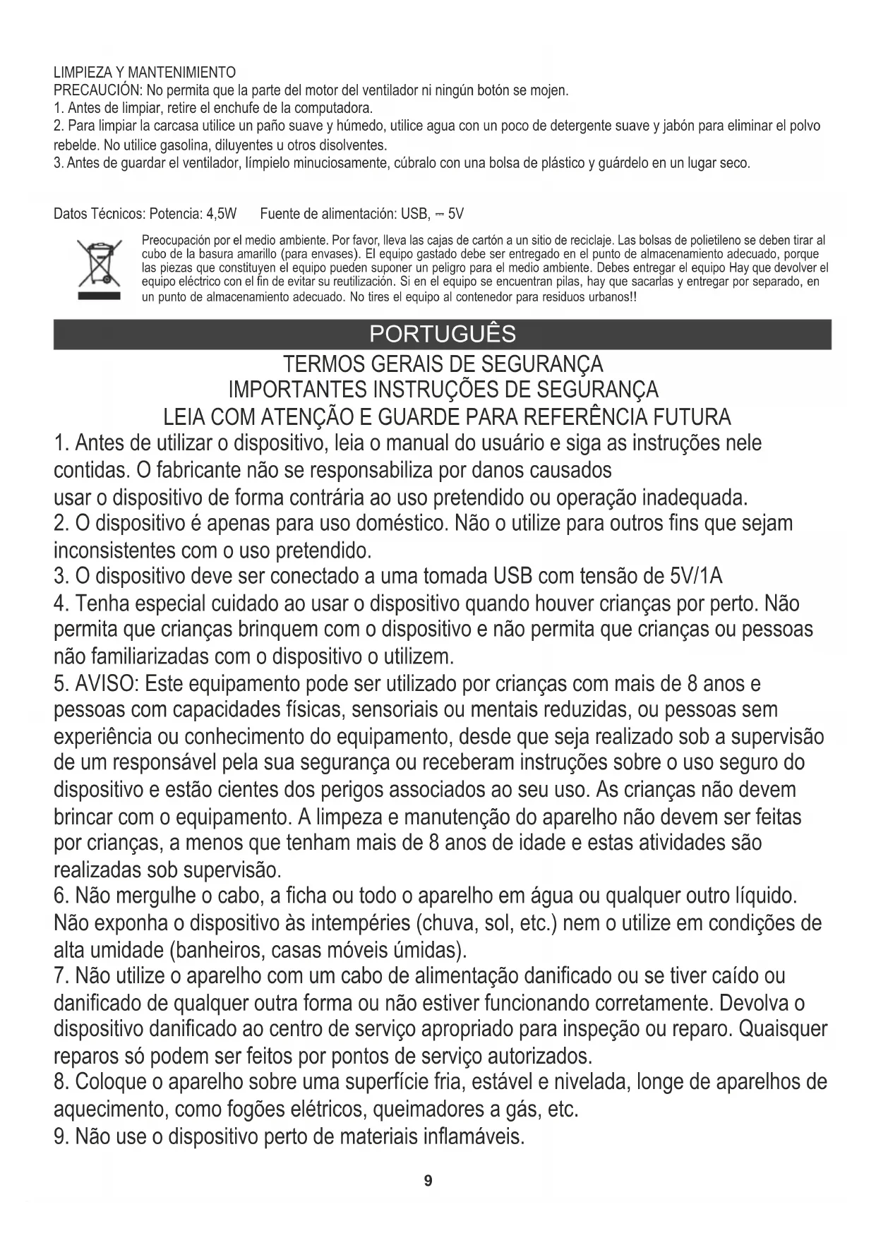 9. Não use o dispositivo perto de materiais inflamáveis.