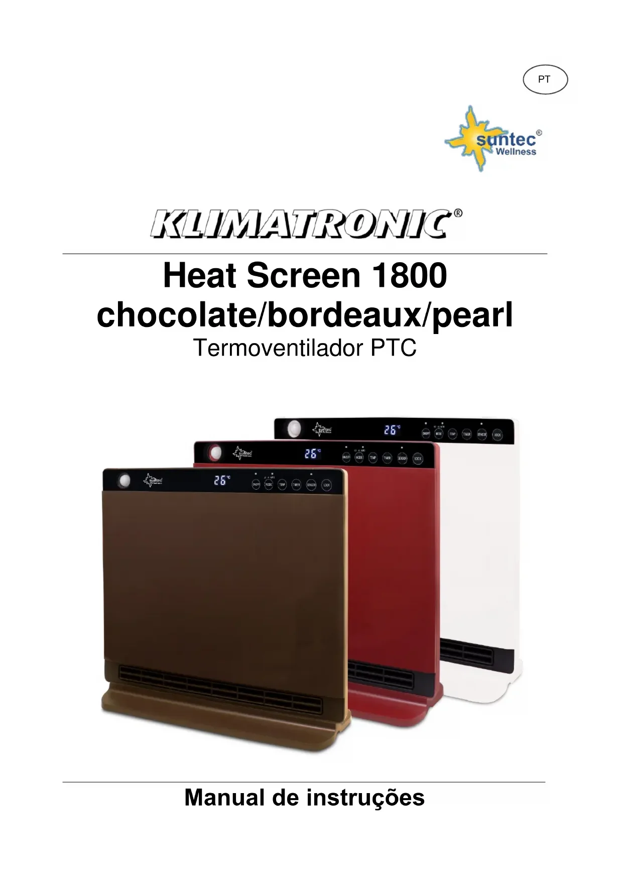 Heat Screen 1800 SUNTEC WELLNESS GMBH / HOLZSTRASSE 2 / 40 221 DÜSSELDORF / DUITSLANDPT Heat Screen 1800 chocolate/bordeaux/pearl Termoventilador PTC Manual de instruçõesObrigado pela aquisição deste aparelho da marca Suntec Wellness. Leia o manual de instruções atentamente antes de colocar o aparelho em funcionamento. Guarde este manual de instruções para referência futura. Indicações de segurança Este aparelho pode ser utilizado por crianças com idade igual ou superior a 8 anos e por pessoas com capacidades físicas, sensoriais ou mentais reduzidas ou com falta de experiência e/ou conhecimento, em caso de vigilância ou se tiverem sido instruídas relativamente ao uso seguro do aparelho e tiverem compreendido os perigos resultantes da utilização. As crianças não devem brincar com o aparelho. As crianças não devem efetuar a limpeza e manutenção sem vigilância. Manter o aparelho longe do alcance de crianças com idade inferior a 3 anos e sem vigilância permanente. As crianças com idade igual ou superior a 3 anos e inferior a 8 anos só devem ligar e desligar o aparelho se este estiver posicionado ou instalado na respetiva posição de utilização normal, se tiverem sido instruídas relativamente ao uso seguro do aparelho, em caso de vigilância e se tiverem compreendido os possíveis perigos. As crianças com idade igual ou superior a 3 anos e inferior a 8 anos não devem ligar o aparelho à tomada, regular, limpar ou realizar a manutenção do aparelho.