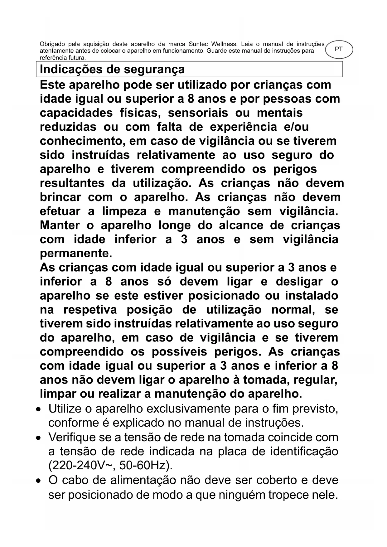CoolBreeze SUNTEC WELLNESS GMBH / HOLZSTRASSE 2 / 40 221 DÜSSELDORF / DUITSLAND Model CoolBreeze 9500 Tri-Vario TV+ Nominale spanning 220-240V~ Nominale frequentie 50-60 Hz Nominale vermogen 105 WObrigado pela aquisição deste aparelho da marca Suntec Wellness. Leia o manual de instruções atentamente antes de colocar o aparelho em funcionamento. Guarde este manual de instruções para referência futura. Indicações de segurança Este aparelho pode ser utilizado por crianças com idade igual ou superior a 8 anos e por pessoas com capacidades físicas, sensoriais ou mentais reduzidas ou com falta de experiência e/ou conhecimento, em caso de vigilância ou se tiverem sido instruídas relativamente ao uso seguro do aparelho e tiverem compreendido os perigos resultantes da utilização. As crianças não devem brincar com o aparelho. As crianças não devem efetuar a limpeza e manutenção sem vigilância. Manter o aparelho longe do alcance de crianças com idade inferior a 3 anos e sem vigilância permanente. As crianças com idade igual ou superior a 3 anos e inferior a 8 anos só devem ligar e desligar o aparelho se este estiver posicionado ou instalado na respetiva posição de utilização normal, se tiverem sido instruídas relativamente ao uso seguro do aparelho, em caso de vigilância e se tiverem compreendido os possíveis perigos. As crianças com idade igual ou superior a 3 anos e inferior a 8 anos não devem ligar o aparelho à tomada, regular, limpar ou realizar a manutenção do aparelho.