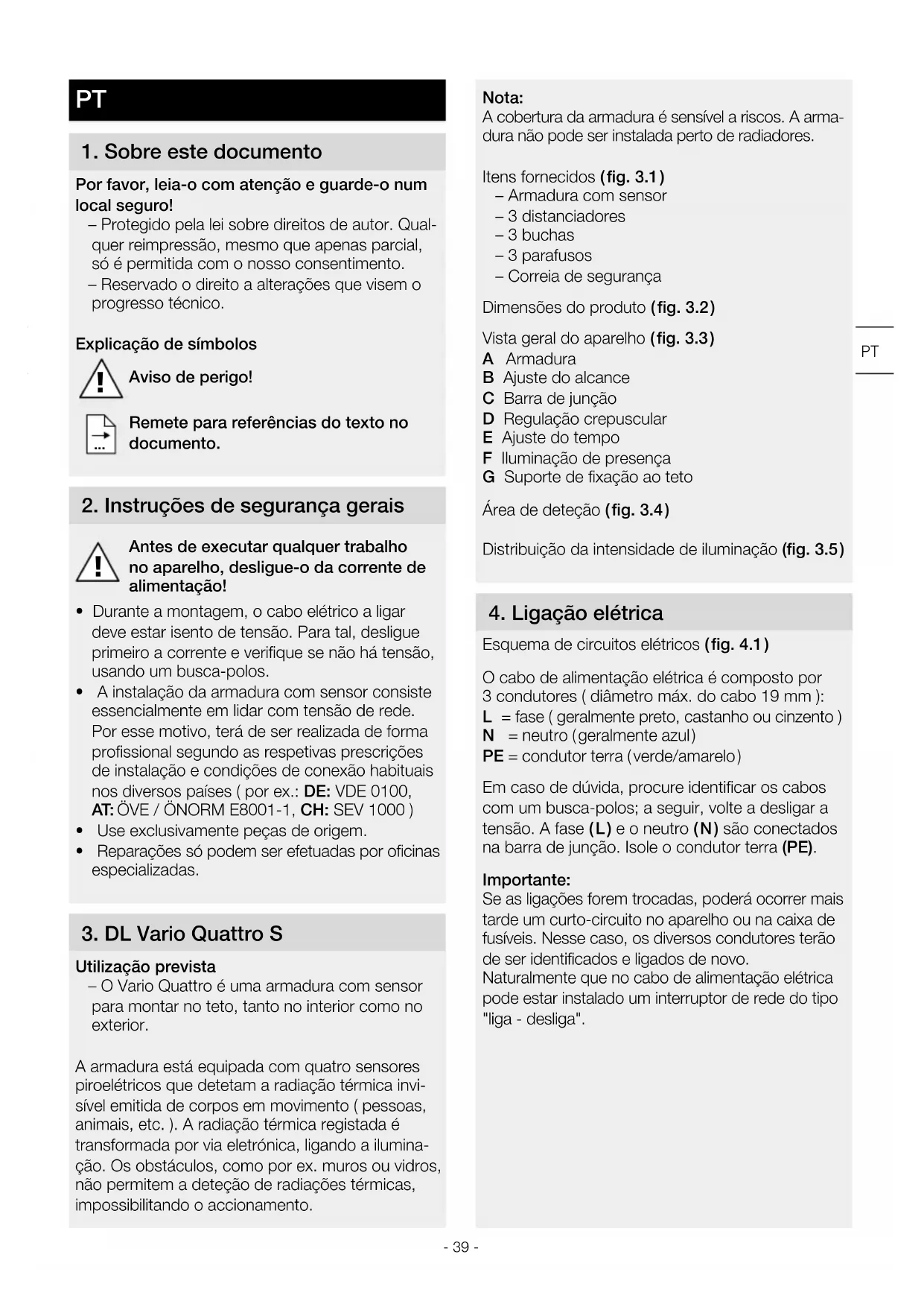 Utilização prevista – O Vario Quattro é uma armadura com sensor para montar no teto, tanto no interior como no exterior. A armadura está equipada com quatro sensores piroelétricos que detetam a radiação térmica invi- sível emitida de corpos em movimento ( pessoas, animais, etc. ). A radiação térmica registada é transformada por via eletrónica, ligando a ilumina- ção. Os obstáculos, como por ex. muros ou vidros, não permitem a deteção de radiações térmicas, impossibilitando o accionamento.