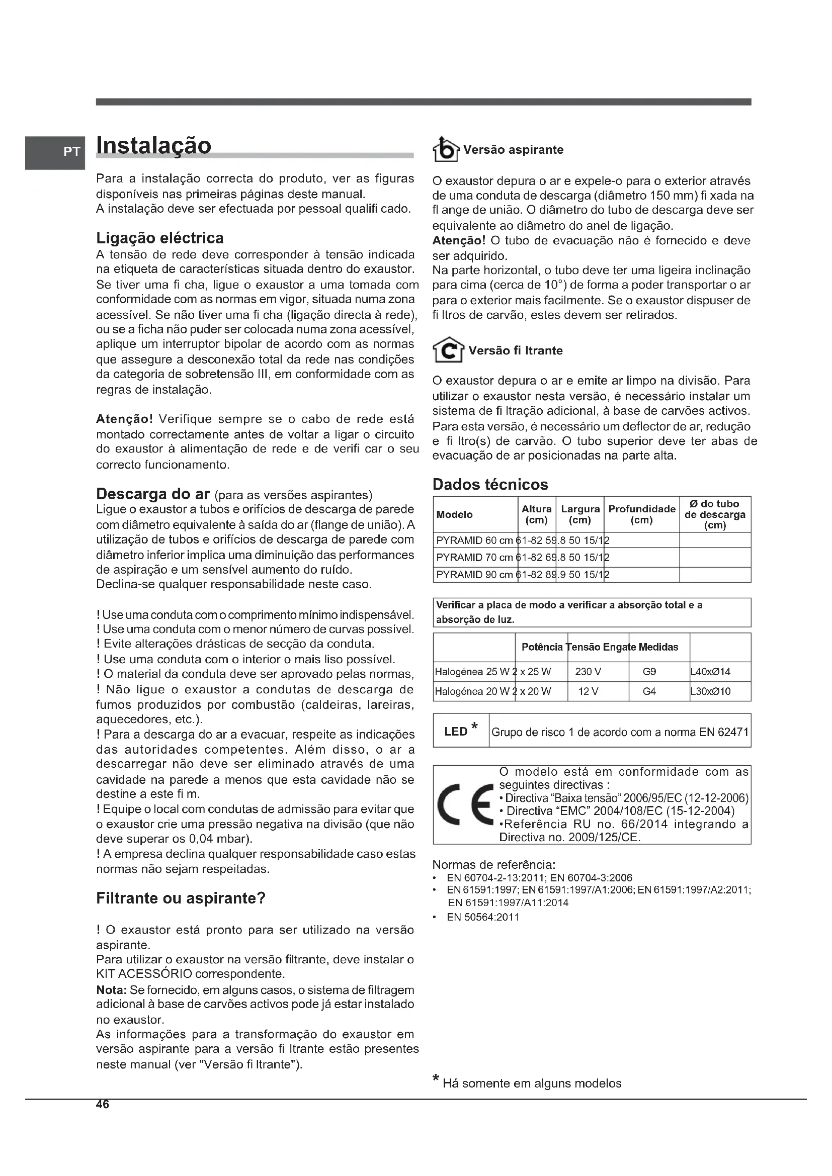 Instalação Para a instalação correcta do produto, ver as figuras disponíveis nas primeiras páginas deste manual. A instalação deve ser efectuada por pessoal qualifi cado. Ligação eléctrica A tensão de rede deve corresponder à tensão indicada na etiqueta de características situada dentro do exaustor. Se tiver uma fi cha, ligue o exaustor a uma tomada com conformidade com as normas em vigor, situada numa zona acessível. Se não tiver uma fi cha (ligação directa à rede), ou se a fi cha não puder ser colocada numa zona acessível, aplique um interruptor bipolar de acordo com as normas que assegure a desconexão total da rede nas condições da categoria de sobretensão III, em conformidade com as regras de instalação. Atenção! Verifique sempre se o cabo de rede está montado correctamente antes de voltar a ligar o circuito do exaustor à alimentação de rede e de verifi car o seu correcto funcionamento. Descarga do ar (para as versões aspirantes) Ligue o exaustor a tubos e orifícios de descarga de parede com diâmetro equivalente à saída do ar (fl ange de união). A utilização de tubos e orifícios de descarga de parede com diâmetro inferior implica uma diminuição das performances de aspiração e um sensível aumento do ruído. Declina-se qualquer responsabilidade neste caso. ! Use uma conduta com o comprimento mínimo indispensável. ! Use uma conduta com o menor número de curvas possível. ! Evite alterações drásticas de secção da conduta. ! Use uma conduta com o interior o mais liso possível. ! O material da conduta deve ser aprovado pelas normas, ! Não ligue o exaustor a condutas de descarga de fumos produzidos por combustão (caldeiras, lareiras, aquecedores, etc.). ! Para a descarga do ar a evacuar, respeite as indicações das autoridades competentes. Além disso, o ar a descarregar não deve ser eliminado através de uma cavidade na parede a menos que esta cavidade não se destine a este fi m. ! Equipe o local com condutas de admissão para evitar que o exaustor crie uma pressão negativa na divisão (que não deve superar os 0,04 mbar). ! A empresa declina qualquer responsabilidade caso estas normas não sejam respeitadas. Filtrante ou aspirante? ! O exaustor está pronto para ser utilizado na versão aspirante. Para utilizar o exaustor na versão fi ltrante, deve instalar o KIT ACESSÓRIO correspondente. Nota: Se fornecido, em alguns casos, o sistema de fi ltragem adicional à base de carvões activos pode já estar instalado no exaustor. As informações para a transformação do exaustor em versão aspirante para a versão fi ltrante estão presentes neste manual (ver "Versão fi ltrante"). Versão aspirante O exaustor depura o ar e expele-o para o exterior através de uma conduta de descarga (diâmetro 150 mm) fi xada na fl ange de união. O diâmetro do tubo de descarga deve ser equivalente ao diâmetro do anel de ligação. Atenção! O tubo de evacuação não é fornecido e deve ser adquirido. Na parte horizontal, o tubo deve ter uma ligeira inclinação para cima (cerca de 10°) de forma a poder transportar o ar para o exterior mais facilmente. Se o exaustor dispuser de fi ltros de carvão, estes devem ser retirados. Versão fi ltrante O exaustor depura o ar e emite ar limpo na divisão. Para utilizar o exaustor nesta versão, é necessário instalar um sistema de fi ltração adicional, à base de carvões activos. Para esta versão, é necessário um defl ector de ar, redução e fi ltro(s) de carvão. O tubo superior deve ter abas de evacuação de ar posicionadas na parte alta. Dados técnicos ModeloAltura (cm) Largura (cm) Profundidade (cm) Ø do tubo de descarga (cm) PYRAMID 60 cm 61-82 59.8 50 15/12PYRAMID 70 cm 61-82 69.8 50 15/12PYRAMID 90 cm 61-82 89.9 50 15/12 Verifi car a placa de modo a verifi car a absorção total e a absorção de luz.Potência Tensão Engate MedidasHalogénea 25 W 2 x 25 W 230 V G9 L40xØ14Halogénea 20 W 2 x 20 W 12 V G4 L30xØ10LED *Grupo de risco 1 de acordo com a norma EN 62471 O modelo está em conformidade com as seguintes directivas :