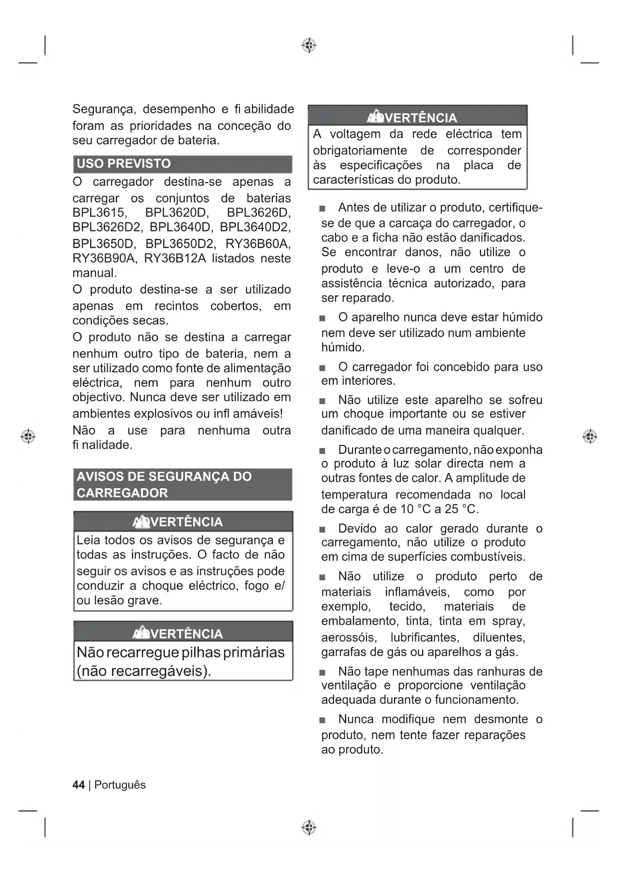 CARREGADOR ADVERTÊNCIA Leia todos os avisos de segurança e todas as instruções. O facto de não seguir os avisos e as instruções pode conduzir a choque eléctrico, fogo e/ ou lesão grave. ADVERTÊNCIA Não recarregue pilhas primárias (não recarregáveis). ADVERTÊNCIA A voltagem da rede eléctrica tem obrigatoriamente de corresponder às especificações na placa de características do produto. ■ Antes de utilizar o produto, certifique- se de que a carcaça do carregador, o cabo e a ficha não estão danificados. Se encontrar danos, não utilize o produto e leve-o a um centro de assistência técnica autorizado, para ser reparado. ■ O aparelho nunca deve estar húmido nem deve ser utilizado num ambiente húmido. ■ O carregador foi concebido para uso em interiores. ■ Não utilize este aparelho se sofreu um choque importante ou se estiver danificado de uma maneira qualquer. ■ Durante o carregamento, não exponha o produto à luz solar directa nem a outras fontes de calor. A amplitude de temperatura recomendada no local de carga é de 10 °C a 25 °C. ■ Devido ao calor gerado durante o carregamento, não utilize o produto em cima de superfícies combustíveis. ■ Não utilize o produto perto de materiais inflamáveis, como por exemplo, tecido, materiais de embalamento, tinta, tinta em spray, aerossóis, lubrificantes, diluentes, garrafas de gás ou aparelhos a gás. ■ Não tape nenhumas das ranhuras de ventilação e proporcione ventilação adequada durante o funcionamento. ■ Nunca modifique nem desmonte o produto, nem tente fazer reparações ao produto.45 Português |