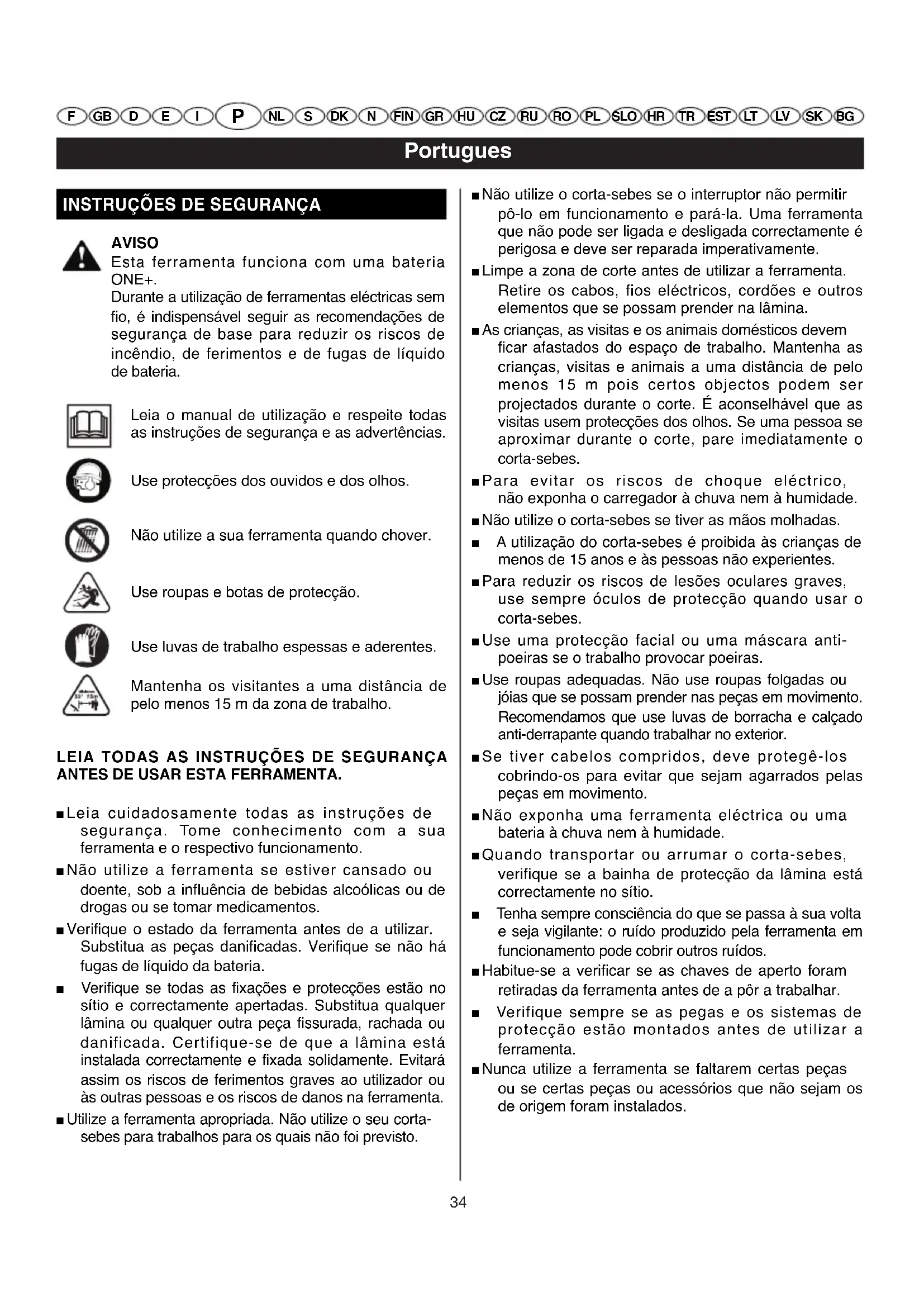 AVISO Esta ferramenta funciona com uma bateria ONE+. Durante a utilização de ferramentas eléctricas sem fio, é indispensável seguir as recomendações de segurança de base para reduzir os riscos de incêndio, de ferimentos e de fugas de líquido de bateria. LEIA TODAS AS INSTRUÇÕES DE SEGURANÇA ANTES DE USAR ESTA FERRAMENTA. ■ Leia cuidadosamente todas as instruções de segurança. Tome conhecimento com a sua ferramenta e o respectivo funcionamento. ■ Não utilize a ferramenta se estiver cansado ou doente, sob a influência de bebidas alcoólicas ou de drogas ou se tomar medicamentos. ■ Verifique o estado da ferramenta antes de a utilizar. Substitua as peças danificadas. Verifique se não há fugas de líquido da bateria. ■ Verifique se todas as fixações e protecções estão no sítio e correctamente apertadas. Substitua qualquer lâmina ou qualquer outra peça fissurada, rachada ou danificada. Certifique-se de que a lâmina está instalada correctamente e fixada solidamente. Evitará assim os riscos de ferimentos graves ao utilizador ou às outras pessoas e os riscos de danos na ferramenta. ■ Utilize a ferramenta apropriada. Não utilize o seu corta- sebes para trabalhos para os quais não foi previsto. ■ Não utilize o corta-sebes se o interruptor não permitir pô-lo em funcionamento e pará-la. Uma ferramenta que não pode ser ligada e desligada correctamente é perigosa e deve ser reparada imperativamente. ■ Limpe a zona de corte antes de utilizar a ferramenta. Retire os cabos, fios eléctricos, cordões e outros elementos que se possam prender na lâmina. ■ As crianças, as visitas e os animais domésticos devem ficar afastados do espaço de trabalho. Mantenha as crianças, visitas e animais a uma distância de pelo menos 15 m pois certos objectos podem ser projectados durante o corte. É aconselhável que as visitas usem protecções dos olhos. Se uma pessoa se aproximar durante o corte, pare imediatamente o corta-sebes. ■ Para evitar os riscos de choque eléctrico, não exponha o carregador à chuva nem à humidade. ■ Não utilize o corta-sebes se tiver as mãos molhadas. ■ Autilização do corta-sebes é proibida às crianças de menos de 15 anos e às pessoas não experientes. ■ Para reduzir os riscos de lesões oculares graves, use sempre óculos de protecção quando usar o corta-sebes. ■ Use uma protecção facial ou uma máscara anti- poeiras se o trabalho provocar poeiras. ■ Use roupas adequadas. Não use roupas folgadas ou jóias que se possam prender nas peças em movimento. Recomendamos que use luvas de borracha e calçado anti-derrapante quando trabalhar no exterior. ■ Se tiver cabelos compridos, deve protegê-los cobrindo-os para evitar que sejam agarrados pelas peças em movimento. ■ Não exponha uma ferramenta eléctrica ou uma bateria à chuva nem à humidade. ■ Quando transportar ou arrumar o corta-sebes, verifique se a bainha de protecção da lâmina está correctamente no sítio. ■ Tenha sempre consciência do que se passa à sua volta e seja vigilante: o ruído produzido pela ferramenta em funcionamento pode cobrir outros ruídos. ■ Habitue-se a verificar se as chaves de aperto foram retiradas da ferramenta antes de a pôr a trabalhar. ■ Verifique sempre se as pegas e os sistemas de protecção estão montados antes de utilizar a ferramenta. ■ Nunca utilize a ferramenta se faltarem certas peças ou se certas peças ou acessórios que não sejam os de origem foram instalados. Leia o manual de utilização e respeite todas as instruções de segurança e as advertências. Use protecções dos ouvidos e dos olhos. Não utilize a sua ferramenta quando chover. Use roupas e botas de protecção. Use luvas de trabalho espessas e aderentes. Mantenha os visitantes a uma distância de pelo menos 15 m da zona de trabalho. OHT-1845_25 lgs 12/09/06 13:53 Page 3435 Portugues