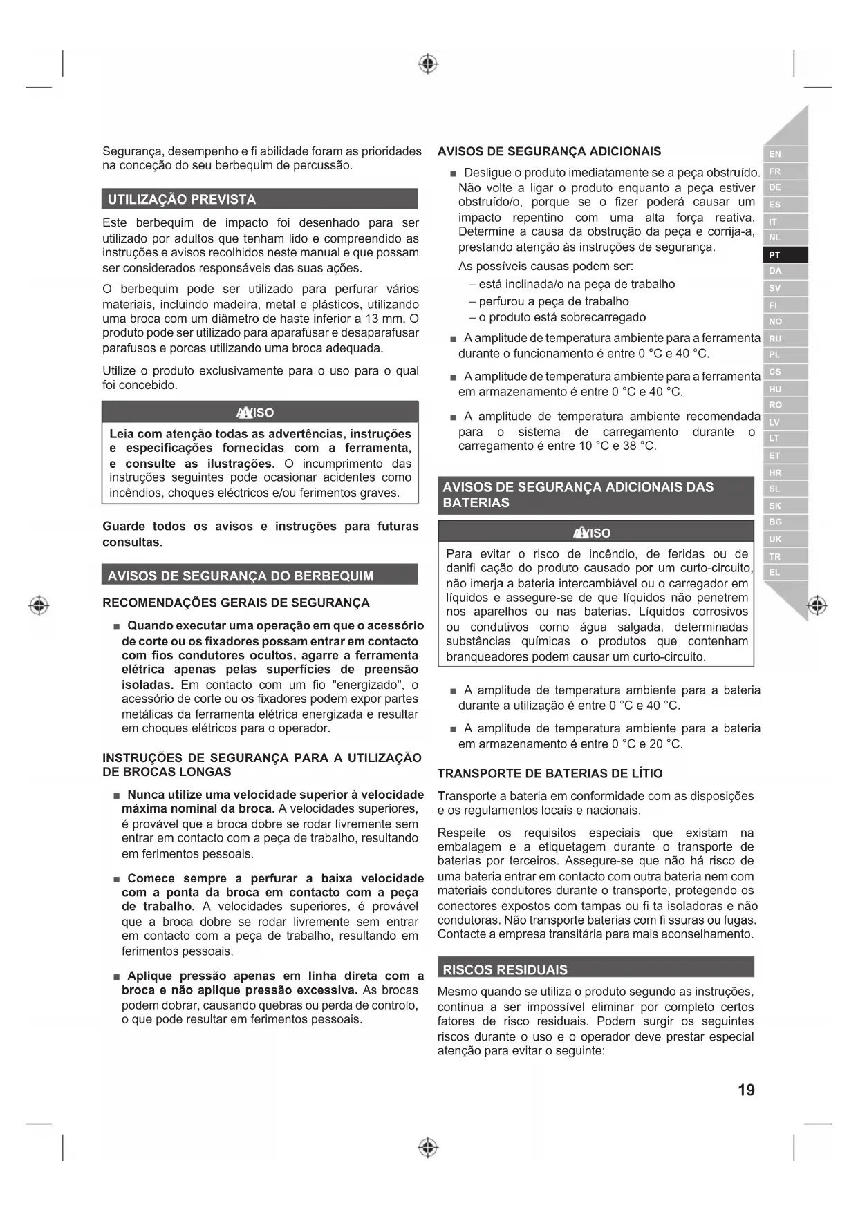 Transporte a bateria em conformidade com as disposições e os regulamentos locais e nacionais. Respeite os requisitos especiais que existam na embalagem e a etiquetagem durante o transporte de baterias por terceiros. Assegure-se que não há risco de uma bateria entrar em contacto com outra bateria nem com materiais condutores durante o transporte, protegendo os conectores expostos com tampas ou fi ta isoladoras e não condutoras. Não transporte baterias com fi ssuras ou fugas. Contacte a empresa transitária para mais aconselhamento. RISCOS RESIDUAIS Mesmo quando se utiliza o produto segundo as instruções, continua a ser impossível eliminar por completo certos fatores de risco residuais. Podem surgir os seguintes riscos durante o uso e o operador deve prestar especial atenção para evitar o seguinte:20 | Português ■ Danos à audição causados pelo ruído – Utilize protecção para os ouvidos do tipo adequado e limite a exposição. ■ Ferimentos nos olhos – É preciso levar proteções ou óculos de proteção para os olhos quando se utiliza o produto. ■ Lesões por vibração – Limite a exposição. Siga as instruções dadas em Redução de Riscos. ■ Choque eléctrico causado pelo contacto com fios metálicos não visíveis – Fixe o produto apenas em superfícies isoladoras. ■ Prejuízo causado pela poeira – O pó criado pelo uso do produto pode provocar problemas respiratórios Use uma máscara respiratória adequada para o controlo de poeiras, com filtros adequados para protecção contra as partículas do material que estiver a ser trabalhado.