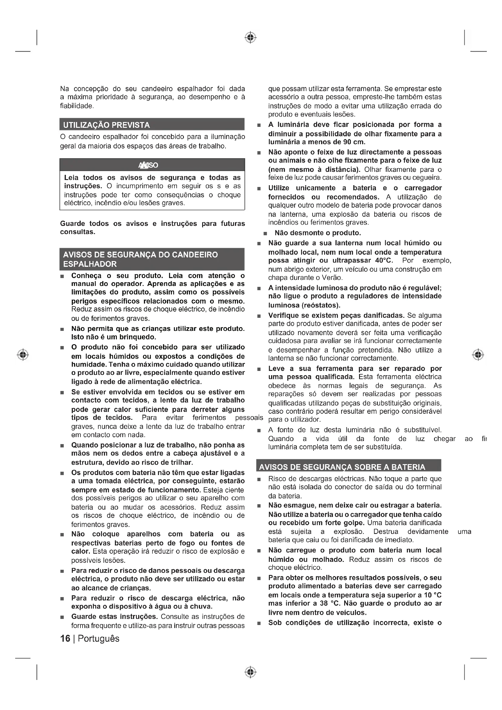 ESPALHADOR Ŷ Conheça o seu produto. Leia com atenção o manual do operador. Aprenda as aplicações e as limitações do produto, assim como os possíveis perigos específicos relacionados com o mesmo. Reduz assim os riscos de choque eléctrico, de incêndio ou de ferimentos graves. Ŷ Não permita que as crianças utilizar este produto. Isto não é um brinquedo. Ŷ O produto não foi concebido para ser utilizado em locais húmidos ou expostos a condições de humidade. Tenha o máximo cuidado quando utilizar o produto ao ar livre, especialmente quando estiver ligado à rede de alimentação eléctrica. Ŷ Se estiver envolvida em tecidos ou se estiver em contacto com tecidos, a lente da luz de trabalho pode gerar calor suficiente para derreter alguns tipos de tecidos. 3DUD HYLWDU IHULPHQWRV SHVVRDLV graves, nunca deixe a lente da luz de trabalho entrar em contacto com nada. Ŷ Quando posicionar a luz de trabalho, não ponha as mãos nem os dedos entre a cabeça ajustável e a estrutura, devido ao risco de trilhar. Ŷ Os produtos com bateria não têm que estar ligadas a uma tomada eléctrica, por conseguinte, estarão sempre em estado de funcionamento.(VWHMDFLHQWH dos possíveis perigos ao utilizar o seu aparelho com bateria ou ao mudar os acessórios. Reduz assim os riscos de choque eléctrico, de incêndio ou de ferimentos graves. Ŷ Não coloque aparelhos com bateria ou as respectivas baterias perto de fogo ou fontes de calor. Esta operação irá reduzir o risco de explosão e possíveis lesões. Ŷ Para reduzir o risco de danos pessoais ou descarga eléctrica, o produto não deve ser utilizado ou estar ao alcance de crianças. Ŷ Para reduzir o risco de descarga eléctrica, não exponha o dispositivo à água ou à chuva. Ŷ Guarde estas instruções.&RQVXOWHDVLQVWUXo}HVGH forma frequente e utilize-as para instruir outras pessoas que possam utilizar esta ferramenta. Se emprestar este acessório a outra pessoa, empreste-lhe também estas instruções de modo a evitar uma utilização errada do produto e eventuais lesões. Ŷ A luminária deve ficar posicionada por forma a diminuir a possibilidade de olhar fixamente para a luminária a menos de 90 cm. Ŷ Não aponte o feixe de luz directamente a pessoas ou animais e não olhe fixamente para o feixe de luz (nem mesmo à distância). Olhar fixamente para o feixe de luz pode causar ferimentos graves ou cegueira. Ŷ Utilize unicamente a bateria e o carregador fornecidos ou recomendados. A utilização de qualquer outro modelo de bateria pode provocar danos na lanterna, uma explosão da bateria ou riscos de incêndios ou ferimentos graves. Ŷ Não desmonte o produto. Ŷ Não guarde a sua lanterna num local húmido ou molhado local, nem num local onde a temperatura possa atingir ou ultrapassar 40°C. 3RU H[HPSOR num abrigo exterior, um veículo ou uma construção em chapa durante o Verão. Ŷ A intensidade luminosa do produto não é regulável; não ligue o produto a reguladores de intensidade luminosa (reóstatos). Ŷ Verifique se existem peças danificadas. Se alguma parte do produto estiver danificada, antes de poder ser utilizado novamente deverá ser feita uma verificação cuidadosa para avaliar se irá funcionar correctamente e desempenhar a função pretendida. Não utilize a lanterna se não funcionar correctamente. Ŷ Leve a sua ferramenta para ser reparado por uma pessoa qualificada. Esta ferramenta eléctrica obedece às normas legais de segurança. As reparações só devem ser realizadas por pessoas qualificadas utilizando peças de substituição originais, caso contrário poderá resultar em perigo considerável para o utilizador. Ŷ A fonte de luz desta luminária não é substituível. 4XDQGR D YLGD ~WLO GD IRQWH GH OX] FKHJDU DR ILP D luminária completa tem de ser substituída. AVISOS DE SEGURANÇA SOBRE A BATERIA Ŷ Risco de descargas eléctricas. Não toque a parte que não está isolada do conector de saída ou do terminal da bateria. Ŷ Não esmague, nem deixe cair ou estragar a bateria. Não utilize a bateria ou o carregador que tenha caído ou recebido um forte golpe. Uma bateria danificada HVWi VXMHLWD D H[SORVmR 'HVWUXD GHYLGDPHQWH XPD bateria que caiu ou foi danificada de imediato. Ŷ Não carregue o produto com bateria num local húmido ou molhado. Reduz assim os riscos de choque eléctrico. Ŷ Para obter os melhores resultados possíveis, o seu produto alimentado a baterias deve ser carregado em locais onde a temperatura seja superior a 10 °C mas inferior a 38 °C. Não guarde o produto ao ar livre nem dentro de veículos. Ŷ Sob condições de utilização incorrecta, existe o17 3RUWXJXrV_