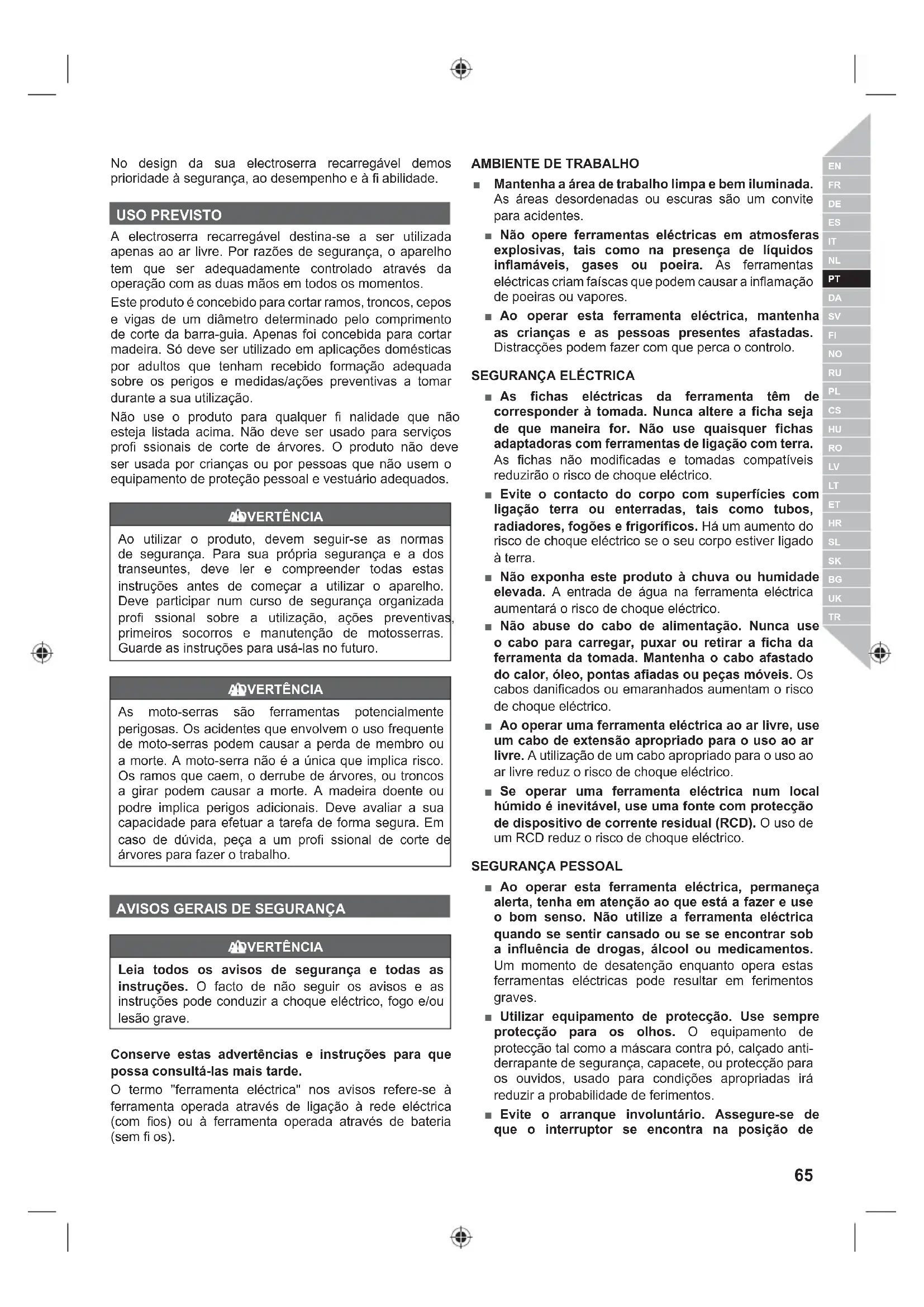 No design da sua electroserra recarregável demos prioridade à segurança, ao desempenho e à fi abilidade. USO PREVISTO A electroserra recarregável destina-se a ser utilizada apenas ao ar livre. Por razões de segurança, o aparelho tem que ser adequadamente controlado através da operação com as duas mãos em todos os momentos. Este produto é concebido para cortar ramos, troncos, cepos e vigas de um diâmetro determinado pelo comprimento de corte da barra-guia. Apenas foi concebida para cortar madeira. Só deve ser utilizado em aplicações domésticas por adultos que tenham recebido formação adequada sobre os perigos e medidas/ações preventivas a tomar durante a sua utilização. Não use o produto para qualquer fi nalidade que não esteja listada acima. Não deve ser usado para serviços profi ssionais de corte de árvores. O produto não deve ser usada por crianças ou por pessoas que não usem o equipamento de proteção pessoal e vestuário adequados. ADVERTÊNCIA Ao utilizar o produto, devem seguir-se as normas de segurança. Para sua própria segurança e a dos transeuntes, deve ler e compreender todas estas instruções antes de começar a utilizar o aparelho. Deve participar num curso de segurança organizada profi ssional sobre a utilização, ações preventivas, primeiros socorros e manutenção de motosserras. Guarde as instruções para usá-las no futuro. ADVERTÊNCIA As moto-serras são ferramentas potencialmente perigosas. Os acidentes que envolvem o uso frequente de moto-serras podem causar a perda de membro ou a morte. A moto-serra não é a única que implica risco. Os ramos que caem, o derrube de árvores, ou troncos a girar podem causar a morte. A madeira doente ou podre implica perigos adicionais. Deve avaliar a sua capacidade para efetuar a tarefa de forma segura. Em caso de dúvida, peça a um profi ssional de corte de árvores para fazer o trabalho.