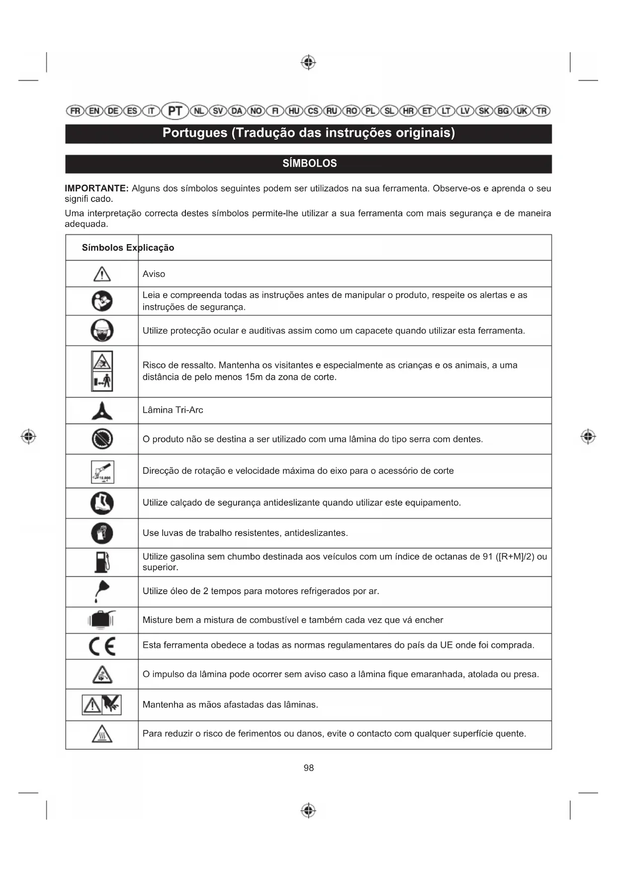 Nível de potência sonora garantido Marca de conformidade EurAsian Puxar Guia de libertação rápida Deslize o bloqueio do acelerador e o gatilho do acelerador para arrancar o motor. Puxe a corda de arranque até que o motor funcione. Para dar arranque à mão com o motor frio. Para dar arranque à mão com o motor quente. Para dar arranque eléctrico com o motor frio. Para dar arranque eléctrico com o motor quente. Marca de conformidade ucraniana100 Portugues (Tradução das instruções originais) As seguintes palavras de sinal e significados destinam-se a explicar os níveis de risco associados a este produto: Símbolos Sinal Significado PERIGO Indica uma situação perigosa iminente, que, se não evitada, poderá resultar em morte ou ferimentos graves. ADVERTÊNCIA Indica uma situação potencialmente perigosa, que, se não evitada, poderá conduzir à morte ou graves lesões. ADVERTÊNCIA Indica uma situação potencialmente perigosa, que, se não evitada, poderá resultar em pequenas ou moderadas lesões. ADVERTÊNCIA (Sem símbolo de alerta de segurança) Indica uma situação que pode resultar em danos de propriedade.101 Portugues (Tradução das instruções originais) No design da sua roçadora/recortadora de relva demos prioridade à segurança, ao desempenho e à fi abilidade. USO PREVISTO A roçadora/recortadora de relva destina-se a ser utilizada por adultos que tenham lido e compreendido as instruções e os avisos neste Manual e que possam ser considerados responsáveis pelas suas acções. O produto apenas se destina a ser usado ao ar livre numa área bem ventilada. Por motivos de segurança, o produto tem obrigatoriamente de ser controlado adequadamente, utilizando ambas as mãos durante a operação. O produto com a cabeça de recortadora de relva aplicada (e respectiva guarda) destina-se a cortar erva alta, ervas daninhas com polpa e vegetação do tipo semelhante, directamente no chão ou próximo do chão. Quando está aplicada a lâmina Tri-Arc™ (e a guarda correcta), o produto pode cortar também arbustos. O produto não foi concebido para lhe ser aplicada uma lâmina de serra. O aparelho de corte deve estar quase paralelo à superfície do chão. O produto não deve ser usado para cortar ou aparar sebes, arbustos ou outra vegetação em que o aparelho de corte não fi que paralelo à superfície do chão. Não a use para nenhuma outra fi nalidade. ADVERTÊNCIA Para reduzir o risco de ferimento, o utilizador deve ler e compreender o manual do utilizador. ADVERTÊNCIA Não tente operar o produto enquanto não tiver lido e compreendido completamente todas as instruções e regras de segurança contidas neste Manual. Se não as cumprir correctamente, pode provocar acidentes envolvendo descargas eléctricas, incêndios e/ou danos corporais graves. Conserve este manual de utilização e consulte-o regularmente para trabalhar com toda a segurança e informar os outros utilizadores eventuais. ADVERTÊNCIA O produto não deve ser utilizado por crianças nem por pessoas com capacidades físicas, mentais ou sensoriais reduzidas. As crianças devem ser mantidas sob vigilância adequada para se garantir que não brincam com o produto.