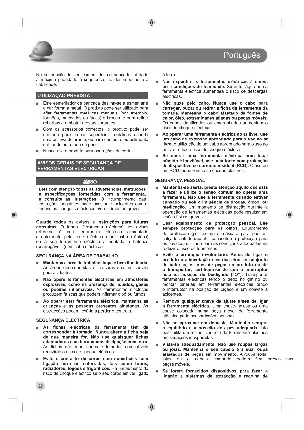 Ŷ Este esmerilador de bancada destina-se a esmerilar e a dar forma a metal. O produto pode ser utilizado para afiar ferramentas metálicas manuais (por exemplo, formões, machados ou facas) e brocas, e para retirar rebarbas e embotar arestas cortantes. Ŷ Com os acessórios correctos, o produto pode ser utilizado para limpar superfícies metálicas usando uma escova de arame, ou para dar lustro ou polimento utilizando uma roda de pano. Ŷ Nunca use o produto para operações de corte.