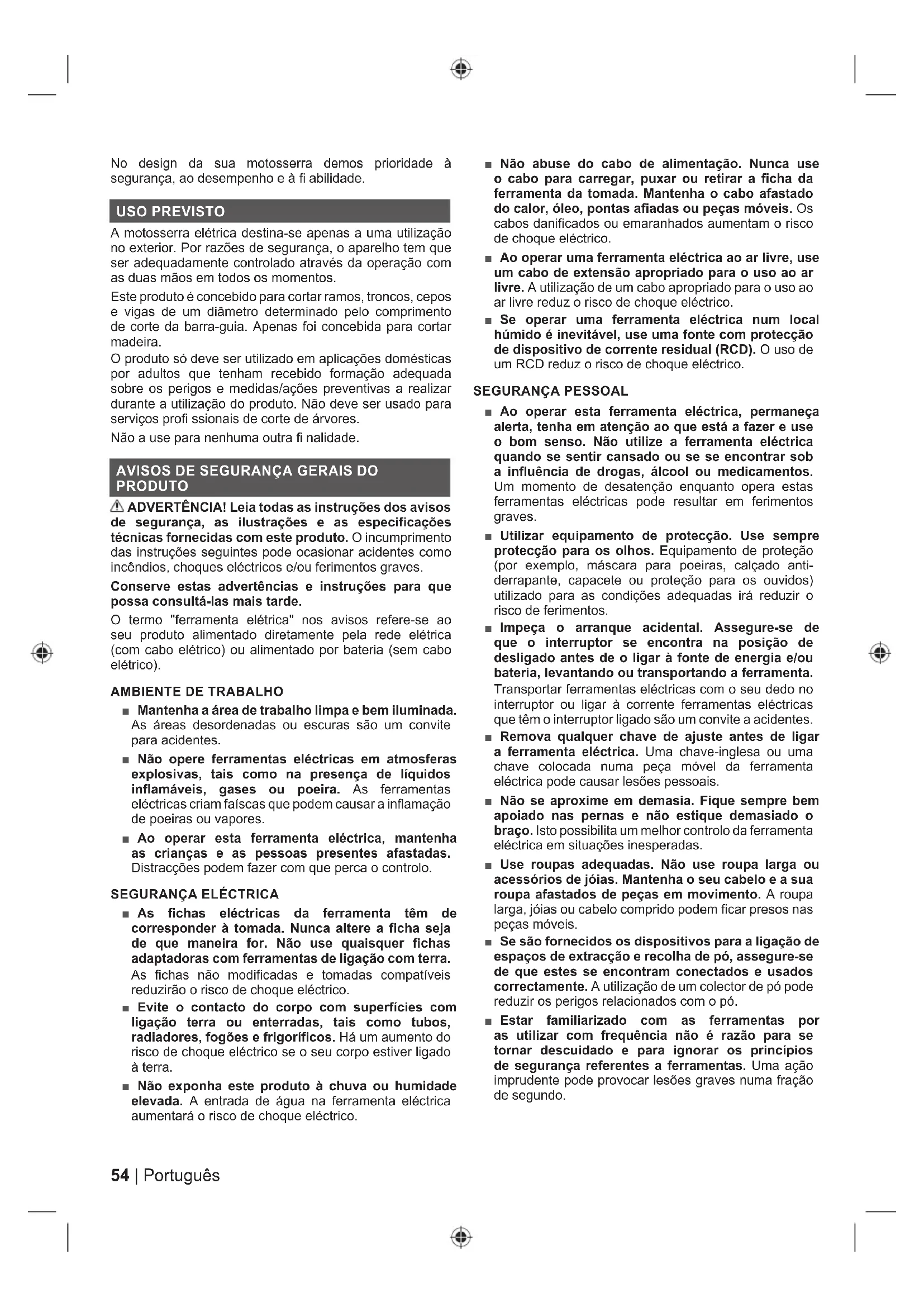 ■ Deve participar num curso de segurança organizada profissional sobre a utilização, ações preventivas, primeiros socorros e manutenção de motosserras. Guarde as instruções para usá-las no futuro. ■ As moto-serras são ferramentas potencialmente perigosas. Os acidentes que envolvem o uso frequente de moto-serras podem causar a perda de membro ou a morte. Os ramos que caem, o derrube de árvores, ou troncos a girar podem causar a morte. A madeira doente ou podre implica perigos adicionais. Deve avaliar a sua capacidade para efetuar a tarefa de forma segura. Em caso de dúvida, peça a um profissional de corte de árvores para fazer o trabalho. ■ Um pico de corrente implica flutuações da tensão e pode afetar outros produtos elétricos na mesma linha elétrica. Ligue o produto a uma fonte de alimentação com uma impedância igual ou inferior a 0,33 para minimizar as flutuações de tensão. Para mais esclarecimentos, contacte o seu fornecedor de energia elétrica. ■ Não corte as videiras e/ou mato pequeno (menos de 75 mm de diâmetro). ■ Antes de cada uso, examine o cabo para ver se está danificado. Se o cabo de alimentação apresentar danos, tem de ser substituído por uma pessoa qualificada num centro de assistência autorizado para evitar perigos. ■ O fornecimento eléctrico deveria efectuar-se através de um dispositivo de corrente residual (RDC) com uma corrente activa não superior a 30 mA. ■ Assegure-se de que o cabo de alimentação está situado de tal maneira que não pode ser danificado ou cortado e que não se pisará, estorvará nem estará submetido a danos ou incómodos. ■ É recomendável cortar os troncos num cavalete de serrador ou num suporte ao operar o aparelho pela primeira vez. ■ O tamanho da área de trabalho depende do trabalho a ser realizado, bem como do tamanho da árvore ou da peça alvo da intervenção. Por exemplo, abater uma árvore requer uma maior área de trabalho do que para fazer outros cortes, como por exemplo, cortes de divisão de troncos, etc. O operador precisa estar atento e em controlo de tudo o que está a acontecer nesta área de trabalho. ■ Não corte com o seu corpo em linha com a barra de guia e corrente. Em caso de ressalto, ajuda a evitar que a correia entre em contacto com a sua cabeça ou qualquer parte do corpo. ■ Não utilize um movimento de serrar para trás e para a frente. Deixe que a correia faça todo o trabalho. Mantenha a correia afiada e tente não empurrar a correia pelo fio de corte. ■ Não exerça pressão na serra no fim do corte. Prepare- se para aguentar com o peso da serra quando esta se liberta da madeira. O incumprimento desta indicação pode causar possíveis lesões pessoais graves. ■ Não pare a serra a meio de uma operação de corte. Mantenha a serra a funcionar até que tenha sido removida do corte. ■ Para reduzir o risco de ferimentos associados ao contacto com peças móveis, pare sempre o motor, aplique o travão da corrente e retire a ficha da tomada de parede. Certifique-se de que todas as peças em movimento pararam completamente: ● antes de limpar ou despejar uma obstrução ● antes de deixar o produto desacompanhado ● antes de colocar ou tirar acessórios. ● antes de verificar, fazer a manutenção ou funcionar com o produto ■ O uso prolongado de uma ferramenta pode causar o agravar lesões. Ao usar qualquer ferramenta durante períodos prolongados, assegure-se que faz intervalos regulares. ■ Se o aparelho cair, sofrer um impacto forte ou começar a vibrar de maneira anormal, pare-o imediatamente e verifique se está danificado ou identifique o motivo da vibração. Qualquer dano deve ser devidamente reparado ou substituído por um centro de assistência autorizado. ■ Utilize o produto apenas em temperaturas entre 0 °C e 40 °C.57 Português |