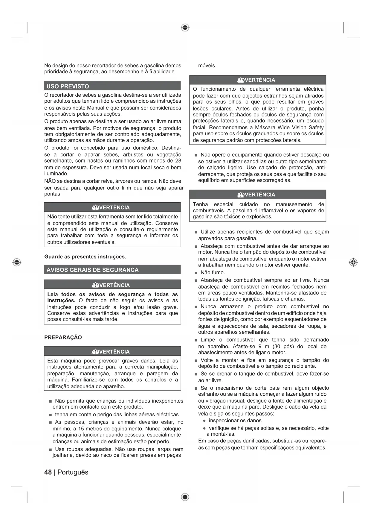 ADVERTÊNCIA Leia todos os avisos de segurança e todas as instruções. O facto de não seguir os avisos e as instruções pode conduzir a fogo e/ou lesão grave. Conserve estas advertências e instruções para que possa consultá-las mais tarde. PREPARAÇÃO ADVERTÊNCIA Esta máquina pode provocar graves danos. Leia as instruções atentamente para a correcta manipulação, preparação, manutenção, arranque e paragem da máquina. Familiarize-se com todos os controlos e a utilização adequada do aparelho. ■ Não permita que crianças ou indivíduos inexperientes entrem em contacto com este produto. ■ tenha em conta o perigo das linhas aéreas eléctricas ■ As pessoas, crianças e animais deverão estar, no mínimo, a 15 metros do equipamento. Nunca coloque a máquina a funcionar quando pessoas, especialmente crianças ou animais de estimação estão por perto. ■ Use roupas adequadas. Não use roupas largas nem joalharia, devido ao risco de ficarem presas em peças móveis. ADVERTÊNCIA O funcionamento de qualquer ferramenta eléctrica pode fazer com que objectos estranhos sejam atirados para os seus olhos, o que pode resultar em graves lesões oculares. Antes de utilizar o produto, ponha sempre óculos fechados ou óculos de segurança com protecções laterais e, quando necessário, um escudo facial. Recomendamos a Máscara Wide Vision Safety para uso sobre os óculos graduados ou sobre os óculos de segurança padrão com protecções laterais. ■ Não opere o equipamento quando estiver descalço ou se estiver a utilizar sandálias ou outro tipo semelhante de calçado ligeiro. Use calçado de protecção, anti- derrapante, que proteja os seus pés e que facilite o seu equilíbrio em superfícies escorregadias. ADVERTÊNCIA Tenha especial cuidado no manuseamento de combustíveis. A gasolina é inflamável e os vapores de gasolina são tóxicos e explosivos. ■ Utilize apenas recipientes de combustível que sejam aprovados para gasolina. ■ Abasteça com combustível antes de dar arranque ao motor. Nunca tire o tampão do depósito de combustível nem abasteça de combustível enquanto o motor estiver a trabalhar nem quando o motor estiver quente. ■ Não fume. ■ Abasteça de combustível sempre ao ar livre. Nunca abasteça de combustível em recintos fechados nem em áreas pouco ventiladas. Mantenha-se afastado de todas as fontes de ignição, faíscas e chamas. ■ Nunca armazene o produto com combustível no depósito de combustível dentro de um edifício onde haja fontes de ignição, como por exemplo esquentadores de água e aquecedores de sala, secadores de roupa, e outros aparelhos semelhantes. ■ Limpe o combustível que tenha sido derramado no aparelho. Afaste-se 9 m (30 pés) do local de abastecimento antes de ligar o motor. ■ Volte a montar e fixe em segurança o tampão do depósito de combustível e o tampão do recipiente. ■ Se se drenar o tanque de combustível, deve fazer-se ao ar livre. ■ Se o mecanismo de corte bate rem algum objecto estranho ou se a máquina começar a fazer algum ruído ou vibração inusual, desligue a fonte de alimentação e deixe que a máquina pare. Desligue o cabo da vela da vela e siga os seguintes passos: ● inspeccionar os danos ● verifique se há peças soltas e, se necessário, volte a montá-las. Em caso de peças danificadas, substitua-as ou repare- as com peças que tenham especificações equivalentes.49 Português |