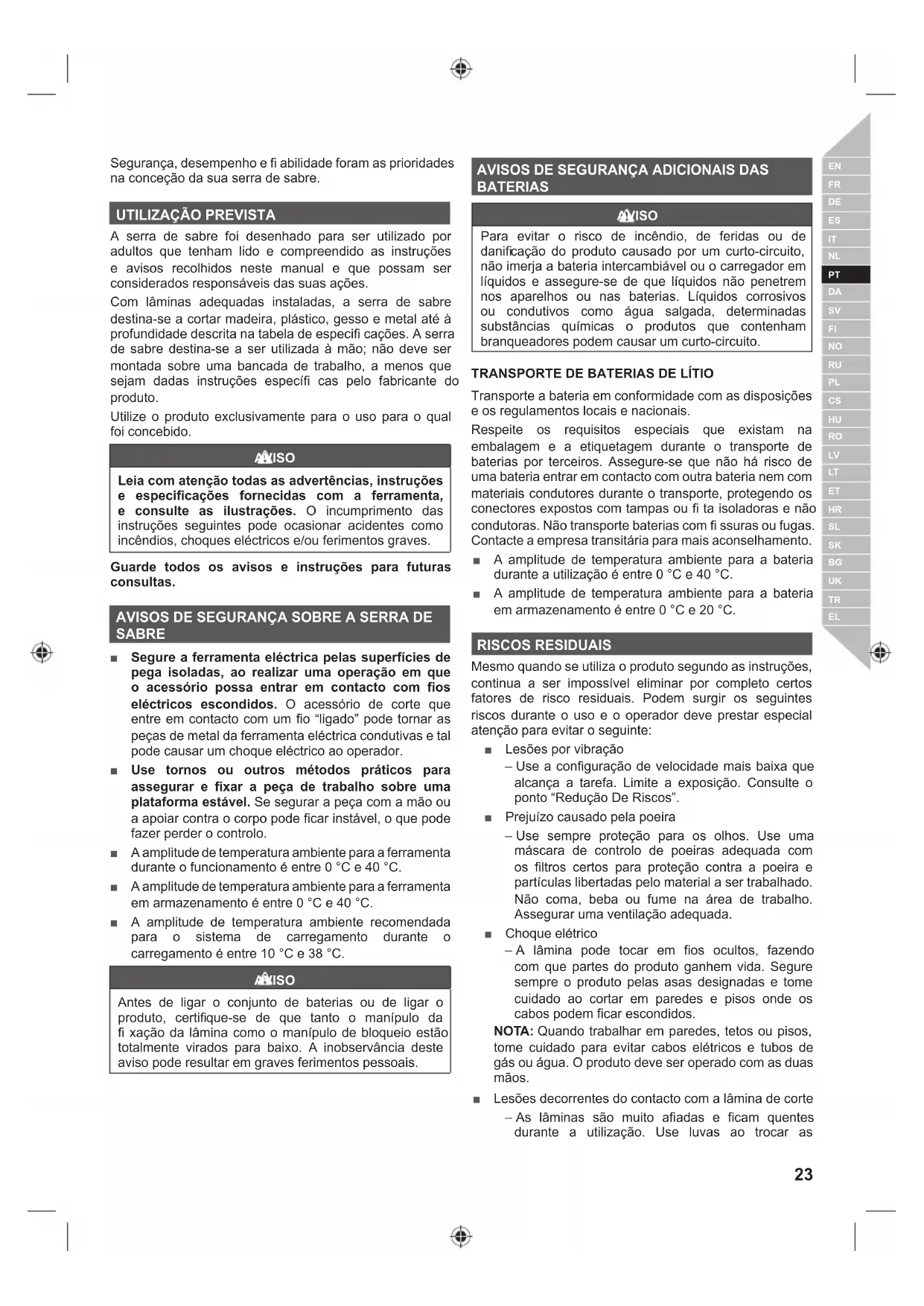 A serra de sabre foi desenhado para ser utilizado por adultos que tenham lido e compreendido as instruções e avisos recolhidos neste manual e que possam ser considerados responsáveis das suas ações. Com lâminas adequadas instaladas, a serra de sabre destina-se a cortar madeira, plástico, gesso e metal até à profundidade descrita na tabela de especifi cações. A serra de sabre destina-se a ser utilizada à mão; não deve ser montada sobre uma bancada de trabalho, a menos que sejam dadas instruções específi cas pelo fabricante do produto. Utilize o produto exclusivamente para o uso para o qual foi concebido. AVISO Leia com atenção todas as advertências, instruções e especificações fornecidas com a ferramenta, e consulte as ilustrações. O incumprimento das instruções seguintes pode ocasionar acidentes como incêndios, choques eléctricos e/ou ferimentos graves. Guarde todos os avisos e instruções para futuras consultas. AVISOS DE SEGURANÇA SOBRE A SERRA DE SABRE ■ Segure a ferramenta eléctrica pelas superfícies de pega isoladas, ao realizar uma operação em que o acessório possa entrar em contacto com fios eléctricos escondidos. O acessório de corte que entre em contacto com um fio “ligado” pode tornar as peças de metal da ferramenta eléctrica condutivas e tal pode causar um choque eléctrico ao operador. ■ Use tornos ou outros métodos práticos para assegurar e fixar a peça de trabalho sobre uma plataforma estável. Se segurar a peça com a mão ou a apoiar contra o corpo pode ficar instável, o que pode fazer perder o controlo. ■ A amplitude de temperatura ambiente para a ferramenta durante o funcionamento é entre 0 °C e 40 °C. ■ A amplitude de temperatura ambiente para a ferramenta em armazenamento é entre 0 °C e 40 °C. ■ A amplitude de temperatura ambiente recomendada para o sistema de carregamento durante o carregamento é entre 10 °C e 38 °C. AVISO Antes de ligar o conjunto de baterias ou de ligar o produto, certifi que-se de que tanto o manípulo da fi xação da lâmina como o manípulo de bloqueio estão totalmente virados para baixo. A inobservância deste aviso pode resultar em graves ferimentos pessoais.