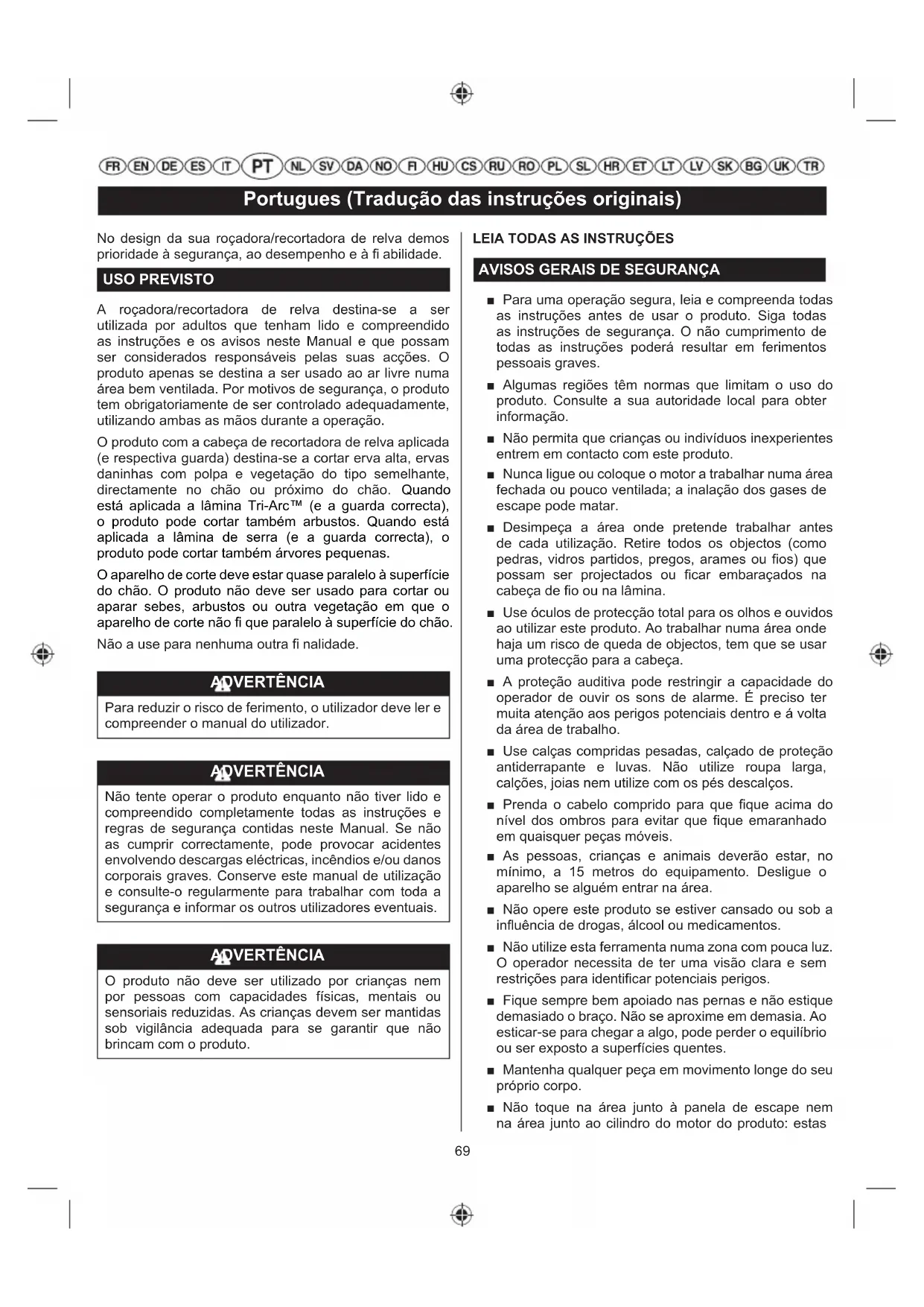 AVVERTENZA Un tappo del carburante che perde può rappresentare un rischio d'incendio e deve essere sostituito immediatamente. Il tappo del carburante contiene un fi ltro non sostituibile e una valvola di controllo. Un fi ltro del carburante intasato68 Italiano (Traduzione dalle istruzioni originali) causerà prestazioni scadenti. Se le prestazioni migliorano quando il tappo viene allentato, controllare che la valvola non sia intasata o difettosa. Sostituire il tappo del carburante se necessario. CANDELA Questo motore usa una candela L8RTF/NHSP LD o L8RTF/BOSCH o equivalente con una distanza dell'elettrodo di 0,5 mm. Utilizzare un cavo di sostituzione. ATTENZIONE Prestare attenzione a non danneggiare il fi letto della candela. Incrociare le fi lettature danneggerà gravemente il motore.69 Portugues (Tradução das instruções originais) No design da sua roçadora/recortadora de relva demos prioridade à segurança, ao desempenho e à fi abilidade. USO PREVISTO A roçadora/recortadora de relva destina-se a ser utilizada por adultos que tenham lido e compreendido as instruções e os avisos neste Manual e que possam ser considerados responsáveis pelas suas acções. O produto apenas se destina a ser usado ao ar livre numa área bem ventilada. Por motivos de segurança, o produto tem obrigatoriamente de ser controlado adequadamente, utilizando ambas as mãos durante a operação. O produto com a cabeça de recortadora de relva aplicada (e respectiva guarda) destina-se a cortar erva alta, ervas daninhas com polpa e vegetação do tipo semelhante, directamente no chão ou próximo do chão. Quando está aplicada a lâmina Tri-Arc™ (e a guarda correcta), o produto pode cortar também arbustos. Quando está aplicada a lâmina de serra (e a guarda correcta), o produto pode cortar também árvores pequenas. O aparelho de corte deve estar quase paralelo à superfície do chão. O produto não deve ser usado para cortar ou aparar sebes, arbustos ou outra vegetação em que o aparelho de corte não fi que paralelo à superfície do chão. Não a use para nenhuma outra fi nalidade. ADVERTÊNCIA Para reduzir o risco de ferimento, o utilizador deve ler e compreender o manual do utilizador. ADVERTÊNCIA Não tente operar o produto enquanto não tiver lido e compreendido completamente todas as instruções e regras de segurança contidas neste Manual. Se não as cumprir correctamente, pode provocar acidentes envolvendo descargas eléctricas, incêndios e/ou danos corporais graves. Conserve este manual de utilização e consulte-o regularmente para trabalhar com toda a segurança e informar os outros utilizadores eventuais. ADVERTÊNCIA O produto não deve ser utilizado por crianças nem por pessoas com capacidades físicas, mentais ou sensoriais reduzidas. As crianças devem ser mantidas sob vigilância adequada para se garantir que não brincam com o produto.