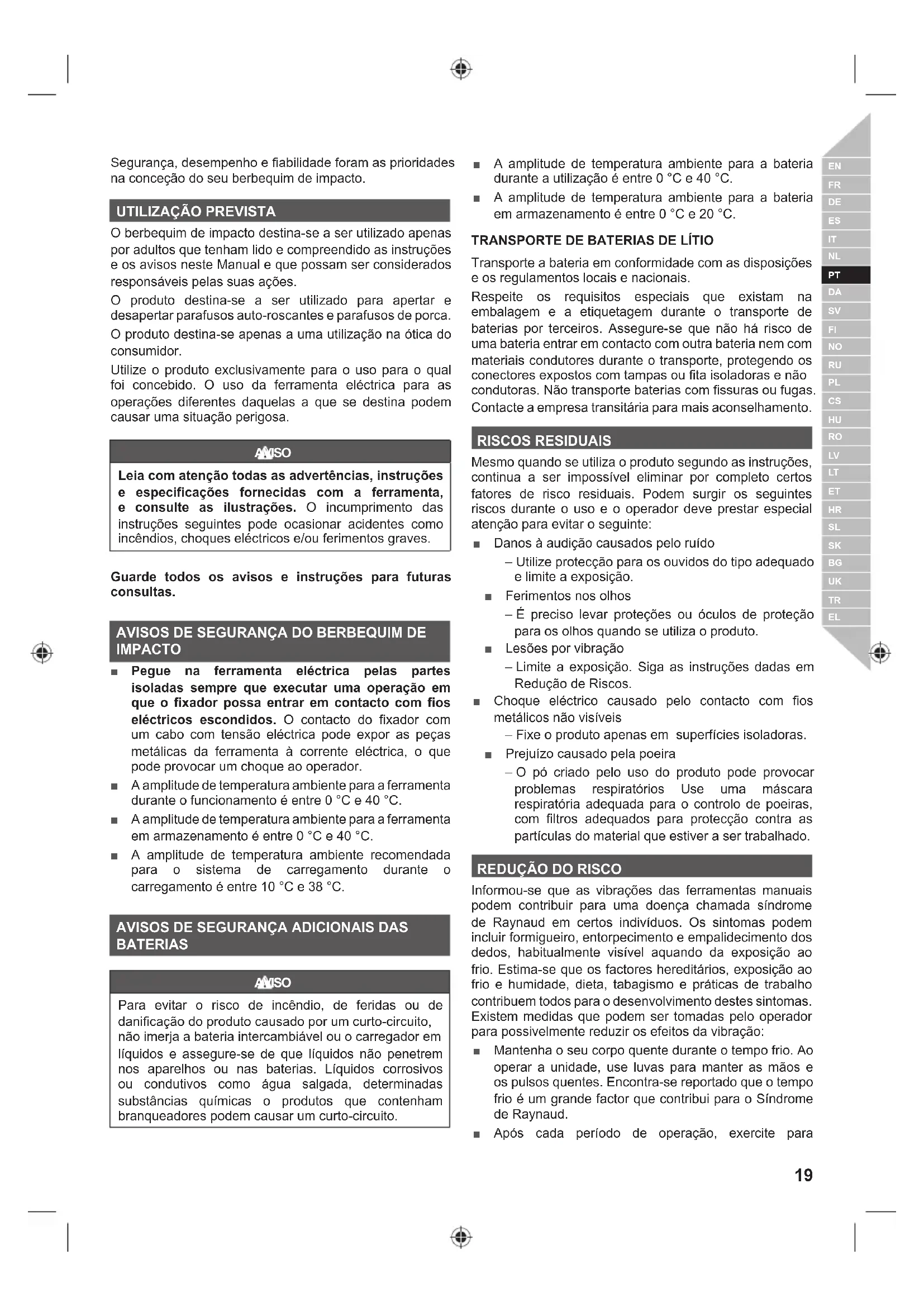O berbequim de impacto destina-se a ser utilizado apenas por adultos que tenham lido e compreendido as instruções e os avisos neste Manual e que possam ser considerados responsáveis pelas suas ações. O produto destina-se a ser utilizado para apertar e desapertar parafusos auto-roscantes e parafusos de porca. O produto destina-se apenas a uma utilização na ótica do consumidor. Utilize o produto exclusivamente para o uso para o qual foi concebido. O uso da ferramenta eléctrica para as operações diferentes daquelas a que se destina podem causar uma situação perigosa. AVISO Leia com atenção todas as advertências, instruções e especificações fornecidas com a ferramenta, e consulte as ilustrações. O incumprimento das instruções seguintes pode ocasionar acidentes como LQFrQGLRVFKRTXHVHOpFWULFRVHRXIHULPHQWRVJUDYHV Guarde todos os avisos e instruções para futuras consultas. AVISOS DE SEGURANÇA DO BERBEQUIM DE IMPACTO Ŷ Pegue na ferramenta eléctrica pelas partes isoladas sempre que executar uma operação em que o fixador possa entrar em contacto com fios eléctricos escondidos. O contacto do fixador com um cabo com tensão eléctrica pode expor as peças metálicas da ferramenta à corrente eléctrica, o que pode provocar um choque ao operador. Ŷ A amplitude de temperatura ambiente para a ferramenta durante o funcionamento é entre 0 °C e 40 °C. Ŷ A amplitude de temperatura ambiente para a ferramenta em armazenamento é entre 0 °C e 40 °C. Ŷ A amplitude de temperatura ambiente recomendada para o sistema de carregamento durante o carregamento é entre 10 °C e 38 °C.