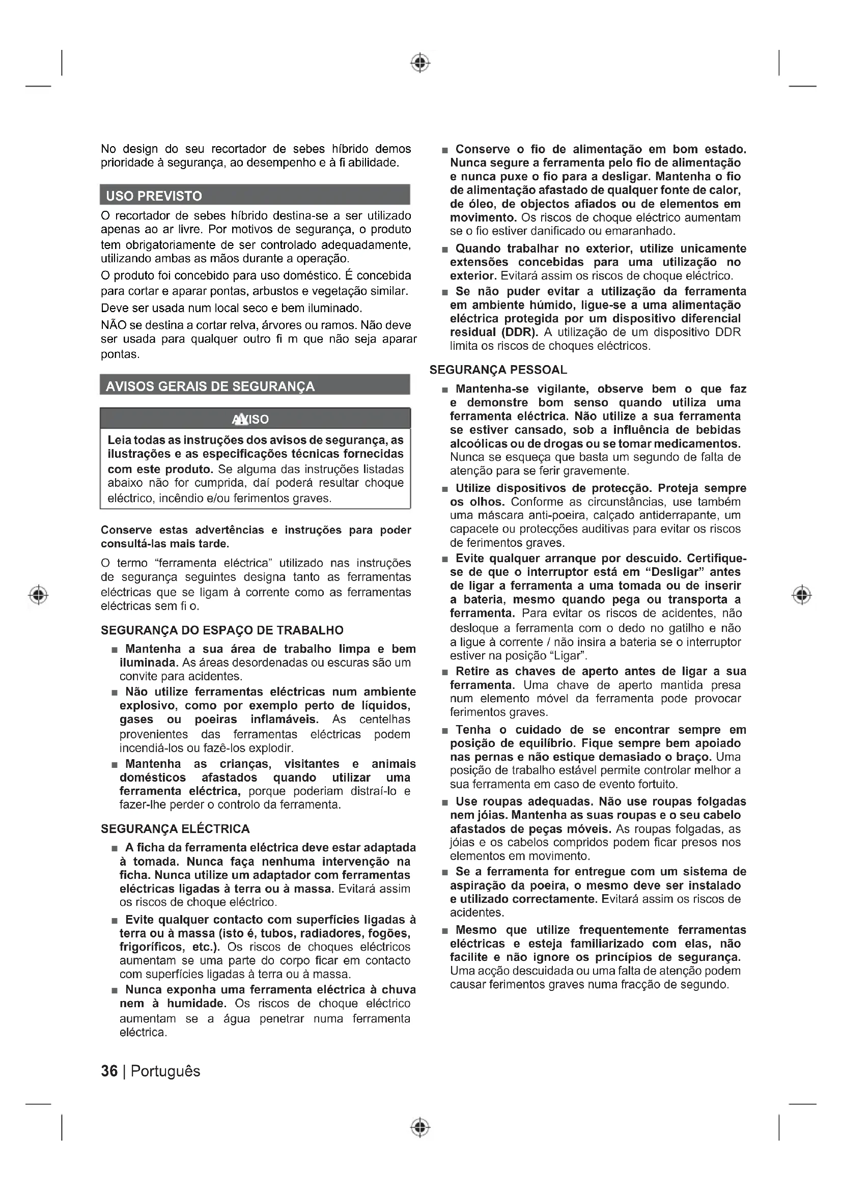 ■ Carregue a bateria somente com o carregador recomendado pelo fabricante. Um carregador adaptado a um certo tipo de bateria pode desencadear um incêndio se for utilizado com outro tipo de bateria. ■ Só se deve utilizar um tipo de bateria específica com uma ferramenta sem fio. O uso de qualquer outra bateria pode provocar um incêndio. ■ Quando a bateria não for utilizada, mantenha-a afastada de objectos metálicos como clipes, moedas, chaves, parafusos, pregos ou qualquer outro objecto que possa ligar os contactos entre si. O curto-circuito dos contactos da bateria pode provocar queimaduras ou incêndios. ■ Evite qualquer contacto com o líquido da bateria em caso de fuga da bateria devido a uma utilização abusiva. Se isso ocorrer, lave a zona afectada com água limpa abundante. Se os olhos forem atingidos, consulte também um médico. O líquido projectado de uma bateria pode provocar irritações ou queimaduras. ■ Não utilize conjuntos de baterias nem ferramentas que estejam danificadas ou que tenham sido modificadas. Baterias danificadas ou modificadas podem ter um comportamento imprevisível e causar um incêndio, uma explosão ou ferimentos. ■ Não exponha conjuntos de baterias nem ferramentas ao fogo nem a temperaturas excessivas. A exposição ao fogo ou a temperaturas acima de 130°C pode causar uma explosão. ■ Siga todas as instruções referentes ao carregamento e não carregue conjuntos de baterias nem ferramentas em temperaturas que excedam os valores especificados nas instruções. Se o carregamento for feito de forma incorrecta ou em temperaturas que excedam os valores especificados, isso poderá danificar a bateria e aumentar o risco de incêndio. MANUTENÇÃO ■ As reparações devem ser efectuadas por um técnico qualificado, utilizando unicamente peças sobresselentes de origem. Desse modo poderá utilizar a sua ferramenta eléctrica com toda a segurança. ■ Nunca tente fazer reparações a conjuntos de baterias que estejam danificados. Os conjuntos de baterias apenas podem ser reparados pelo fabricante ou por um concessionário de assistência técnica autorizado. AVISOS DE SEGURANÇA DO RECORTADOR DE
