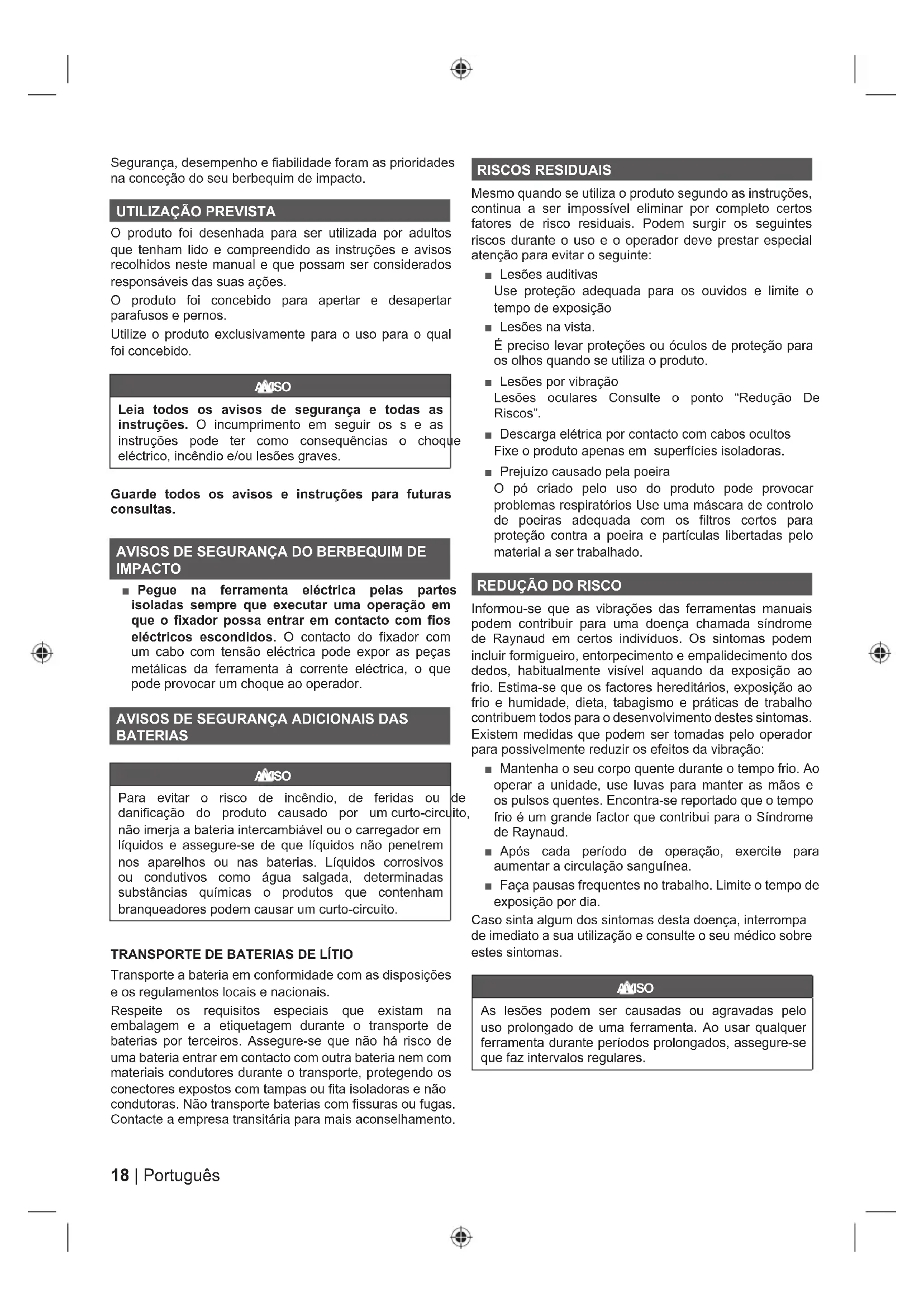 Transporte a bateria em conformidade com as disposições e os regulamentos locais e nacionais. Respeite os requisitos especiais que existam na embalagem e a etiquetagem durante o transporte de baterias por terceiros. Assegure-se que não há risco de uma bateria entrar em contacto com outra bateria nem com materiais condutores durante o transporte, protegendo os FRQHFWRUHVH[SRVWRVFRPWDPSDVRX¿WDLVRODGRUDVHQmR FRQGXWRUDV1mRWUDQVSRUWHEDWHULDVFRP¿VVXUDVRXIXJDV &RQWDFWHDHPSUHVDWUDQVLWiULDSDUDPDLVDFRQVHOKDPHQWR RISCOS RESIDUAIS Mesmo quando se utiliza o produto segundo as instruções, continua a ser impossível eliminar por completo certos fatores de risco residuais. Podem surgir os seguintes riscos durante o uso e o operador deve prestar especial atenção para evitar o seguinte: Ŷ Lesões auditivas Use proteção adequada para os ouvidos e limite o tempo de exposição Ŷ Lesões na vista. É preciso levar proteções ou óculos de proteção para os olhos quando se utiliza o produto. Ŷ Lesões por vibração /HV}HV RFXODUHV &RQVXOWH R SRQWR ³5HGXomR 'H Riscos”. Ŷ Descarga elétrica por contacto com cabos ocultos Fixe o produto apenas em superfícies isoladoras. Ŷ 3UHMXt]RFDXVDGRSHODSRHLUD O pó criado pelo uso do produto pode provocar problemas respiratórios Use uma máscara de controlo de poeiras adequada com os filtros certos para proteção contra a poeira e partículas libertadas pelo material a ser trabalhado.