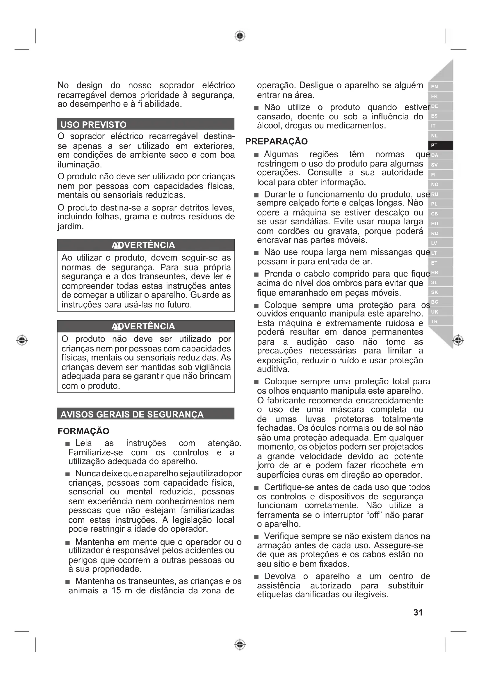 No design do nosso soprador eléctrico recarregável demos prioridade à segurança, ao desempenho e à fi abilidade. USO PREVISTO O soprador eléctrico recarregável destina- se apenas a ser utilizado em exteriores, em condições de ambiente seco e com boa iluminação. O produto não deve ser utilizado por crianças nem por pessoas com capacidades físicas, mentais ou sensoriais reduzidas. O produto destina-se a soprar detritos leves, incluindo folhas, grama e outros resíduos de jardim. ADVERTÊNCIA Ao utilizar o produto, devem seguir-se as normas de segurança. Para sua própria segurança e a dos transeuntes, deve ler e compreender todas estas instruções antes de começar a utilizar o aparelho. Guarde as instruções para usá-las no futuro. ADVERTÊNCIA O produto não deve ser utilizado por crianças nem por pessoas com capacidades físicas, mentais ou sensoriais reduzidas. As crianças devem ser mantidas sob vigilância adequada para se garantir que não brincam com o produto.