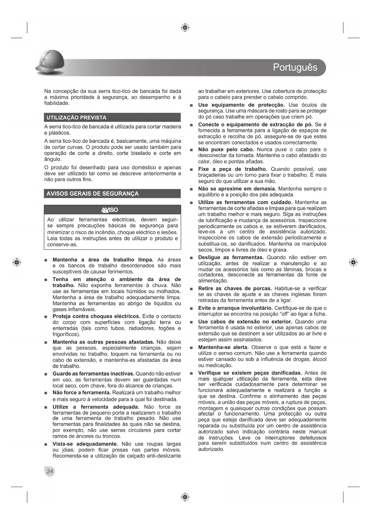 AVISO Ao utilizar ferramentas eléctricas, devem seguir- se sempre precauções básicas de segurança para minimizar o risco de incêndio, choque eléctrico e lesões. Leia todas as instruções antes de utilizar o produto e conserve-as. Ŷ Mantenha a área de trabalho limpa. As áreas e os bancos de trabalho desordenados são mais susceptíveis de causar ferimentos. Ŷ Tenha em atenção o ambiente da área de trabalho. Não exponha ferramentas à chuva. Não use as ferramentas em locais húmidos ou molhados. Mantenha a área de trabalho adequadamente limpa. Mantenha as ferramentas ao abrigo de líquidos ou gases inflamáveis. Ŷ Proteja contra choques eléctricos. Evite o contacto do corpo com superfícies com ligação terra ou enterradas (tais como tubos, radiadores, fogões e frigoríficos). Ŷ Mantenha as outras pessoas afastadas. Não deixe que as pessoas, especialmente crianças, sejam envolvidas no trabalho, toquem na ferramenta ou no cabo de extensão, e mantenha-as afastadas da área de trabalho. Ŷ Guarde as ferramentas inactivas. Quando não estiver em uso, as ferramentas devem ser guardadas num local seco, com chave, fora do alcance de crianças. Ŷ Não force a ferramenta. Realizará um trabalho melhor e mais seguro à velocidade para a qual foi destinada. Ŷ Utilize a ferramenta adequada. Não force as ferramentas de pequeno porte a realizarem o trabalho de uma ferramenta de trabalho pesado. Não use ferramentas para finalidades às quais não se destina, por exemplo, não use serras circulares para cortar ramos de árvores ou troncos. Ŷ Vista-se adequadamente. Não use roupas largas ou jóias; podem ficar presas nas partes móveis. Recomenda-se a utilização de calçado anti-deslizante ao trabalhar em exteriores. Use cobertura de protecção para o cabelo para prender o cabelo comprido. Ŷ Use equipamento de protecção. Use óculos de segurança. Use uma máscara de rosto para se proteger do pó caso trabalhe em operações que criem pó. Ŷ Conecte o equipamento de extracção de pó. Se é fornecida a ferramenta para a ligação de espaços de extracção e recolha de pó, assegure-se de que estes se encontram conectados e usados correctamente. Ŷ Não puxe pelo cabo. Nunca puxe o cabo para o desconectar da tomada. Mantenha o cabo afastado do calor, óleo e pontas afiadas. Ŷ Fixe a peça de trabalho. Quando possível, use braçadeiras ou um torno para fixar o trabalho. É mais seguro do que utilizar a sua mão. Ŷ Não se aproxime em demasia. Mantenha sempre o equilíbrio e a posição dos pés adequada. Ŷ Utilize as ferramentas com cuidado. Mantenha as ferramentas de corte afiadas e limpas para que realizem um trabalho melhor e mais seguro. Siga as instruções de lubrificação e mudança de acessórios. Inspeccione periodicamente os cabos e, se estiverem danificados, leve-os a um centro de assistência autorizado. Inspeccione os cabos de extensão periodicamente e substitua-os, se danificados. Mantenha os manípulos secos, limpos e livres de óleo e graxa. Ŷ Desligue as ferramentas. Quando não estiver em utilização, antes de realizar a manutenção e ao mudar os acessórios tais como as lâminas, brocas e cortadores, desconecte as ferramentas da fonte de alimentação. Ŷ Retire as chaves de porcas. Habitue-se a verificar se as chaves de ajuste e as chaves inglesas foram retiradas da ferramenta antes de a ligar. Ŷ Evite o arranque involuntário. Certifique-se de que o interruptor se encontra na posição “off” ao ligar a ficha. Ŷ Use cabos de extensão no exterior. Quando uma ferramenta é usada no exterior, use apenas cabos de extensão que se destinem a ser utilizados ao ar livre e estejam assim assinalados. Ŷ Mantenha-se alerta. Observe o que está a fazer e utilize o senso comum. Não use a ferramenta quando estiver cansado ou sob a influência de drogas, álcool ou medicação. Ŷ Verifique se existem peças danificadas. Antes de mais qualquer utilização da ferramenta, esta deve ser verificada cuidadosamente para determinar se funcionará adequadamente e realizará a função a que se destina. Confirme o alinhamento das peças móveis, a união das peças móveis, a ruptura de peças, montagem e quaisquer outras condições que possam afectar o funcionamento. Uma protecção ou outra peça que esteja danificada deve ser adequadamente reparada ou substituída por um centro de assistência autorizado salvo indicação contrária neste manual de instruções. Leve os interruptores defeituosos para serem substituídos num centro de assistência autorizado. Português 24Ŷ Não use a ferramenta caso o interruptor não a ligue ou desligue. Ŷ Aviso. O uso de qualquer acessório ou extra para além dos recomendados neste manual de instruções pode implicar um risco de lesão pessoal. Ŷ Leve a sua ferramenta para ser reparado por uma pessoa qualificada. Esta ferramenta eléctrica cumpre com as normas de segurança relevantes. As reparações só devem ser realizadas por pessoas qualificadas utilizando peças de substituição originais, caso contrário poderá resultar em perigo considerável para o utilizador. AVISOS DE SEGURANÇA DA SERRA TICO-TICO DE BANCADA Ŷ Não opere o produto enquanto não estiver completamente montado e instalado de acordo com as instruções. Ŷ A serra tico-tico de bancada tem de estar fixada em segurança a uma bancada de trabalho. Se houver alguma tendência para a bancada de trabalho se mover durante a operação, então a bancada de trabalho tem de ser fixada ao chão. Ŷ Quando montar ou desmontar as lâminas, desligue a serra tico-tico de bancada da rede eléctrica. Ŷ Os dentes da lâmina devem ficar a apontar para baixo. Ŷ Antes de operar a serra tico-tico de bancada certifique- se de que a tensão da lâmina é correcta, porque a tensão excessiva pode causar avarias. Ŷ Não corte peças de trabalho que sejam demasiado pequenas para poderem ser apoiadas em segurança. Ŷ Mantenha as mãos afastadas da lâmina