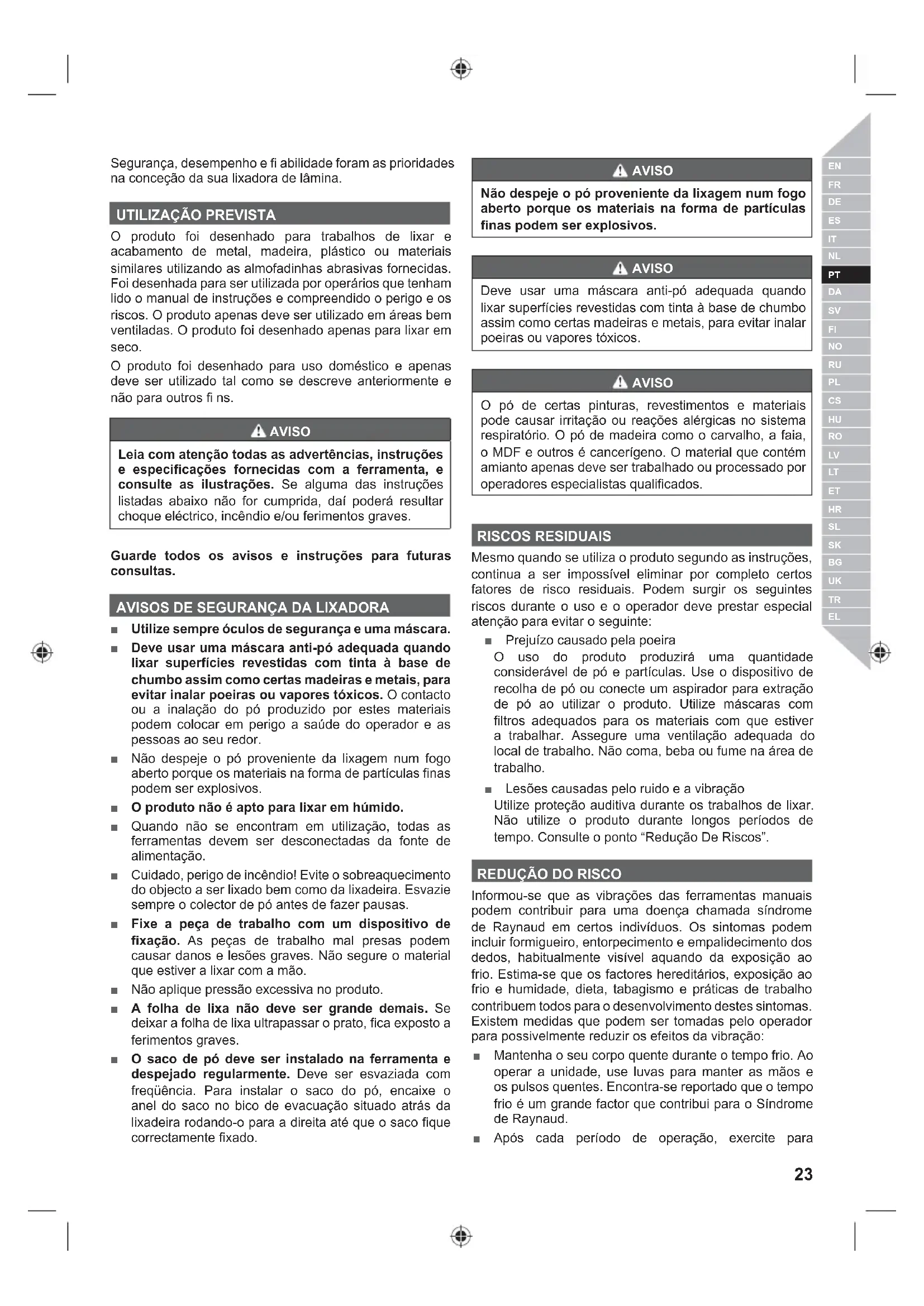 ■ Utilize sempre óculos de segurança e uma máscara. ■ Deve usar uma máscara anti-pó adequada quando lixar superfícies revestidas com tinta à base de chumbo assim como certas madeiras e metais, para evitar inalar poeiras ou vapores tóxicos. O contacto ou a inalação do pó produzido por estes materiais podem colocar em perigo a saúde do operador e as pessoas ao seu redor. ■ Não despeje o pó proveniente da lixagem num fogo aberto porque os materiais na forma de partículas finas podem ser explosivos. ■ O produto não é apto para lixar em húmido. ■ Quando não se encontram em utilização, todas as ferramentas devem ser desconectadas da fonte de alimentação. ■ Cuidado, perigo de incêndio! Evite o sobreaquecimento do objecto a ser lixado bem como da lixadeira. Esvazie sempre o colector de pó antes de fazer pausas. ■ Fixe a peça de trabalho com um dispositivo de fixação. As peças de trabalho mal presas podem causar danos e lesões graves. Não segure o material que estiver a lixar com a mão. ■ Não aplique pressão excessiva no produto. ■ A folha de lixa não deve ser grande demais. Se deixar a folha de lixa ultrapassar o prato, fica exposto a ferimentos graves. ■ O saco de pó deve ser instalado na ferramenta e despejado regularmente. Deve ser esvaziada com freqüência. Para instalar o saco do pó, encaixe o anel do saco no bico de evacuação situado atrás da lixadeira rodando-o para a direita até que o saco fique correctamente fixado. AVISO Não despeje o pó proveniente da lixagem num fogo aberto porque os materiais na forma de partículas finas podem ser explosivos. AVISO Deve usar uma máscara anti-pó adequada quando lixar superfícies revestidas com tinta à base de chumbo assim como certas madeiras e metais, para evitar inalar poeiras ou vapores tóxicos. AVISO O pó de certas pinturas, revestimentos e materiais pode causar irritação ou reações alérgicas no sistema respiratório. O pó de madeira como o carvalho, a faia, o MDF e outros é cancerígeno. O material que contém amianto apenas deve ser trabalhado ou processado por operadores especialistas qualificados. RISCOS RESIDUAIS Mesmo quando se utiliza o produto segundo as instruções, continua a ser impossível eliminar por completo certos fatores de risco residuais. Podem surgir os seguintes riscos durante o uso e o operador deve prestar especial atenção para evitar o seguinte: ■ Prejuízo causado pela poeira O uso do produto produzirá uma quantidade considerável de pó e partículas. Use o dispositivo de recolha de pó ou conecte um aspirador para extração de pó ao utilizar o produto. Utilize máscaras com filtros adequados para os materiais com que estiver a trabalhar. Assegure uma ventilação adequada do local de trabalho. Não coma, beba ou fume na área de trabalho. ■ Lesões causadas pelo ruido e a vibração Utilize proteção auditiva durante os trabalhos de lixar. Não utilize o produto durante longos períodos de tempo. Consulte o ponto “Redução De Riscos”.