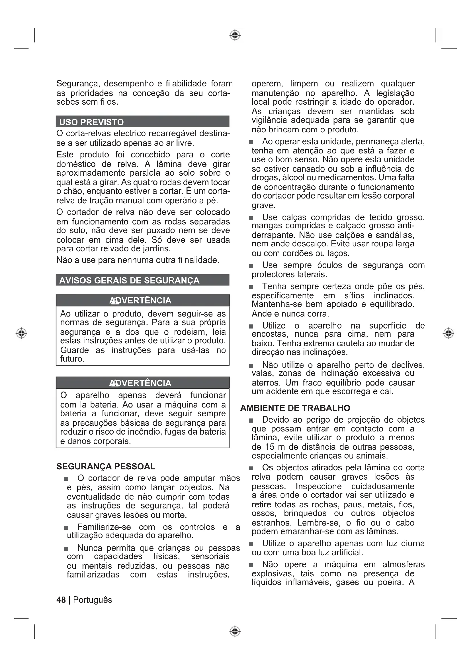 TRSegurança, desempenho e ¿ abilidade foram as prioridades na conceção da seu corta- sebes sem ¿ os. USO PREVISTO O corta-relvas eléctrico recarregável destina- se a ser utilizado apenas ao ar livre. Este produto foi concebido para o corte doméstico de relva. A lâmina deve girar aproximadamente paralela ao solo sobre o qual está a girar. As quatro rodas devem tocar o chão, enquanto estiver a cortar. É um corta- relva de tração manual com operário a pé. O cortador de relva não deve ser colocado em funcionamento com as rodas separadas do solo, não deve ser puxado nem se deve colocar em cima dele. Só deve ser usada para cortar relvado de jardins. Não a use para nenhuma outra ¿ nalidade.