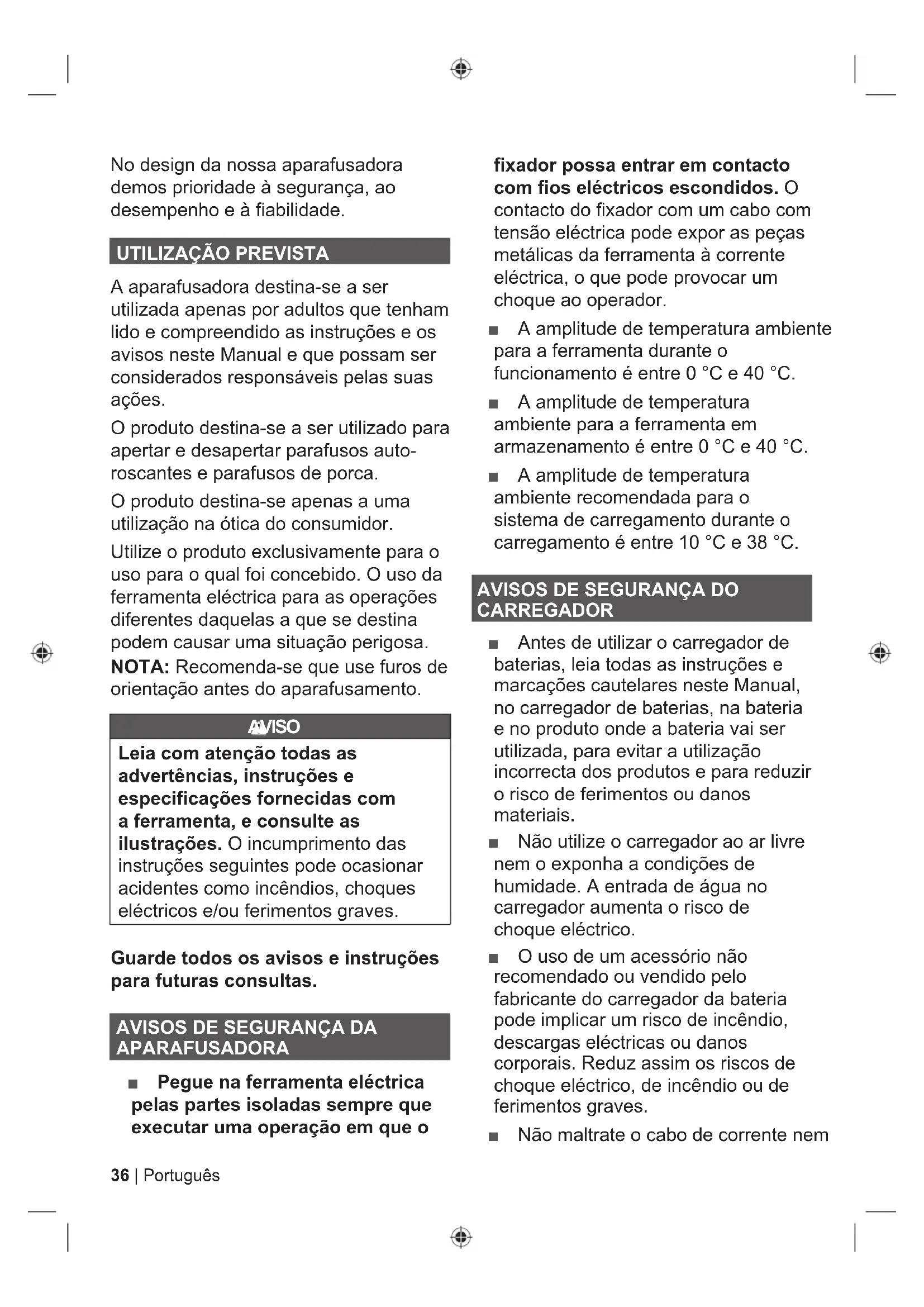 A aparafusadora destina-se a ser utilizada apenas por adultos que tenham lido e compreendido as instruções e os avisos neste Manual e que possam ser considerados responsáveis pelas suas ações. O produto destina-se a ser utilizado para apertar e desapertar parafusos auto- roscantes e parafusos de porca. O produto destina-se apenas a uma utilização na ótica do consumidor. Utilize o produto exclusivamente para o uso para o qual foi concebido. O uso da ferramenta eléctrica para as operações diferentes daquelas a que se destina podem causar uma situação perigosa. NOTA: Recomenda-se que use furos de orientação antes do aparafusamento. AVISO Leia com atenção todas as advertências, instruções e especificações fornecidas com a ferramenta, e consulte as ilustrações. O incumprimento das instruções seguintes pode ocasionar acidentes como incêndios, choques eléctricos e/ou ferimentos graves. Guarde todos os avisos e instruções para futuras consultas.
