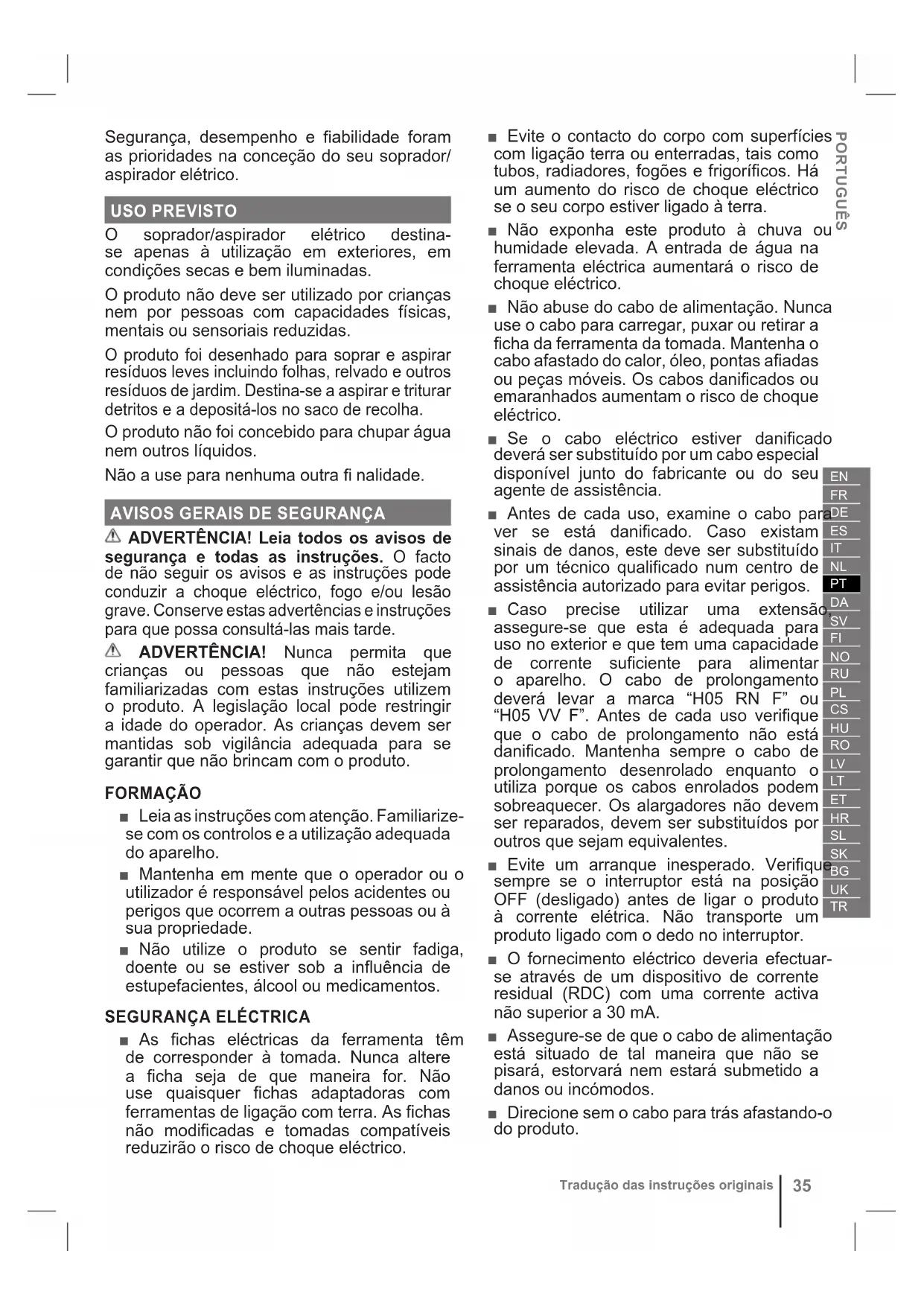 Vertaling van de originele instructiesSegurança, desempenho e fi abilidade foram as prioridades na conceção do seu soprador/ aspirador elétrico. USO PREVISTO O soprador/aspirador elétrico destina- se apenas à utilização em exteriores, em condições secas e bem iluminadas. O produto não deve ser utilizado por crianças nem por pessoas com capacidades físicas, mentais ou sensoriais reduzidas. O produto foi desenhado para soprar e aspirar resíduos leves incluindo folhas, relvado e outros resíduos de jardim. Destina-se a aspirar e triturar detritos e a depositá-los no saco de recolha. O produto não foi concebido para chupar água nem outros líquidos. Não a use para nenhuma outra fi nalidade.