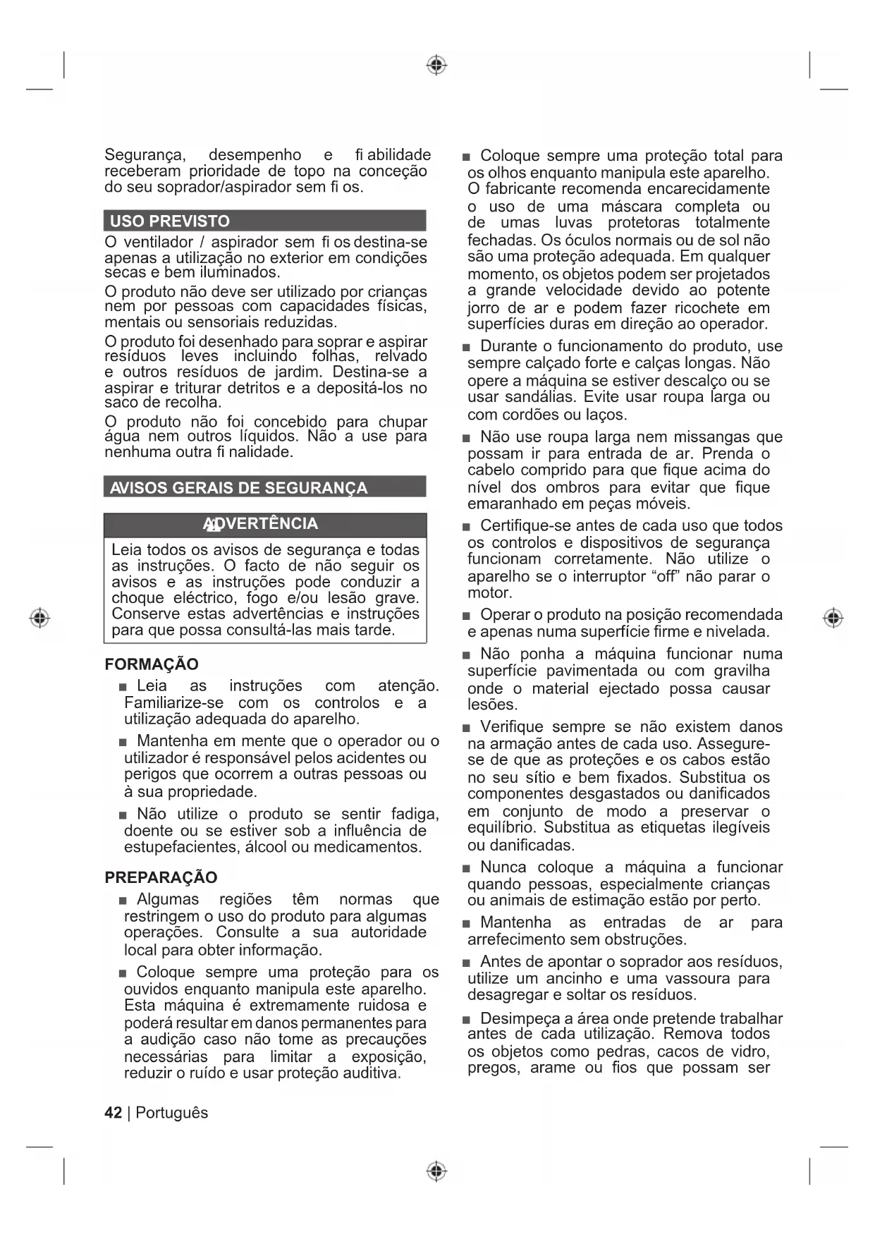 ADVERTÊNCIA Leia todos os avisos de segurança e todas as instruções. O facto de não seguir os avisos e as instruções pode conduzir a choque eléctrico, fogo e/ou lesão grave. Conserve estas advertências e instruções para que possa consultá-las mais tarde. FORMAÇÃO ■ Leia as instruções com atenção. Familiarize-se com os controlos e a utilização adequada do aparelho. ■ Mantenha em mente que o operador ou o utilizador é responsável pelos acidentes ou perigos que ocorrem a outras pessoas ou à sua propriedade. ■ Não utilize o produto se sentir fadiga, doente ou se estiver sob a influência de estupefacientes, álcool ou medicamentos. PREP ARAÇÃO ■ Algumas regiões têm normas que restringem o uso do produto para algumas operações. Consulte a sua autoridade local para obter informação. ■ Coloque sempre uma proteção para os ouvidos enquanto manipula este aparelho. Esta máquina é extremamente ruidosa e poderá resultar em danos permanentes para a audição caso não tome as precauções necessárias para limitar a exposição, reduzir o ruído e usar proteção auditiva. ■ Coloque sempre uma proteção total para os olhos enquanto manipula este aparelho. O fabricante recomenda encarecidamente o uso de uma máscara completa ou de umas luvas protetoras totalmente fechadas. Os óculos normais ou de sol não são uma proteção adequada. Em qualquer momento, os objetos podem ser projetados a grande velocidade devido ao potente jorro de ar e podem fazer ricochete em superfícies duras em direção ao operador. ■ Durante o funcionamento do produto, use sempre calçado forte e calças longas. Não opere a máquina se estiver descalço ou se usar sandálias. Evite usar roupa larga ou com cordões ou laços. ■ Não use roupa larga nem missangas que possam ir para entrada de ar. Prenda o cabelo comprido para que fique acima do nível dos ombros para evitar que fique emaranhado em peças móveis. ■ Certifique-se antes de cada uso que todos os controlos e dispositivos de segurança funcionam corretamente. Não utilize o aparelho se o interruptor “off” não parar o motor. ■ Operar o produto na posição recomendada e apenas numa superfície firme e nivelada. ■ Não ponha a máquina funcionar numa superfície pavimentada ou com gravilha onde o material ejectado possa causar lesões. ■ Verifique sempre se não existem danos na armação antes de cada uso. Assegure- se de que as proteções e os cabos estão no seu sítio e bem fixados. Substitua os componentes desgastados ou danificados em conjunto de modo a preservar o equilíbrio. Substitua as etiquetas ilegíveis ou danificadas. ■ Nunca coloque a máquina a funcionar quando pessoas, especialmente crianças ou animais de estimação estão por perto. ■ Mantenha as entradas de ar para arrefecimento sem obstruções. ■ Antes de apontar o soprador aos resíduos, utilize um ancinho e uma vassoura para desagregar e soltar os resíduos. ■ Desimpeça a área onde pretende trabalhar antes de cada utilização. Remova todos os objetos como pedras, cacos de vidro, pregos, arame ou fios que possam ser43 Português |