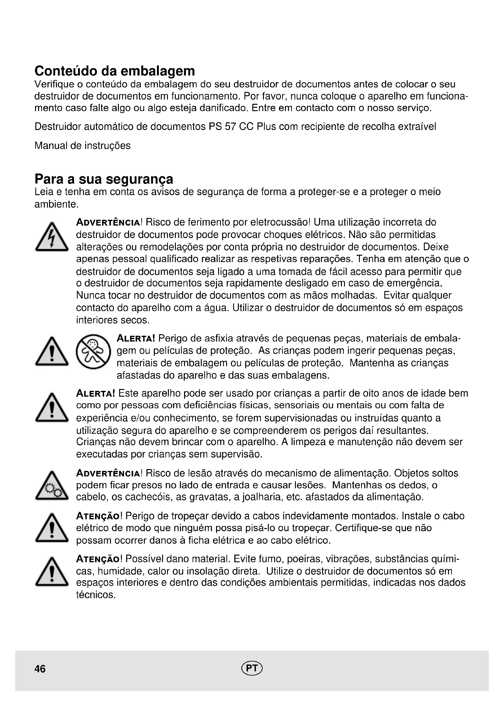 Declaración de conformidad El marcado CE en el aparato conrma la conformidad. Encontrará la declaración de conformidad en www.go-europe.com. Declaración de conformidad del nivel de seguridad según norma DIN 66399-2 Mediante la presente declaramos que, durante la destrucción de documentos, este aparato cumple los requisitos del nivel de seguridad P-2 según norma DIN 66399-2. Garantía Estimado cliente, nos alegramos de que Usted se haya decidido por este aparato. En caso de un defecto devuelva el aparato junto con el justicante de compra y el embalaje original al lugar donde lo ha adquirido.46 Conteúdo da embalagem Verique o conteúdo da embalagem do seu destruidor de documentos antes de colocar o seu destruidor de documentos em funcionamento. Por favor, nunca coloque o aparelho em funciona- mento caso falte algo ou algo esteja danicado. Entre em contacto com o nosso serviço. Destruidor automático de documentos PS 57 CC Plus com recipiente de recolha extraível Manual de instruções Para a sua segurança Leia e tenha em conta os avisos de segurança de forma a proteger-se e a proteger o meio ambiente. Advertência! Risco de ferimento por eletrocussão! Uma utilização incorreta do destruidor de documentos pode provocar choques elétricos. Não são permitidas alterações ou remodelações por conta própria no destruidor de documentos. Deixe apenas pessoal qualicado realizar as respetivas reparações. Tenha em atenção que o destruidor de documentos seja ligado a uma tomada de fácil acesso para permitir que o destruidor de documentos seja rapidamente desligado em caso de emergência. Nunca tocar no destruidor de documentos com as mãos molhadas. Evitar qualquer contacto do aparelho com a água. Utilizar o destruidor de documentos só em espaços interiores secos. Alerta! Perigo de asxia através de pequenas peças, materiais de embala- gem ou películas de proteção. As crianças podem ingerir pequenas peças, materiais de embalagem ou películas de proteção. Mantenha as crianças afastadas do aparelho e das suas embalagens. Alerta! Este aparelho pode ser usado por crianças a partir de oito anos de idade bem como por pessoas com deciências físicas, sensoriais ou mentais ou com falta de experiência e/ou conhecimento, se forem supervisionadas ou instruídas quanto a utilização segura do aparelho e se compreenderem os perigos daí resultantes. Crianças não devem brincar com o aparelho. A limpeza e manutenção não devem ser executadas por crianças sem supervisão. Advertência! Risco de lesão através do mecanismo de alimentação. Objetos soltos podem car presos no lado de entrada e causar lesões. Mantenhas os dedos, o cabelo, os cachecóis, as gravatas, a joalharia, etc. afastados da alimentação. Atenção! Perigo de tropeçar devido a cabos indevidamente montados. Instale o cabo elétrico de modo que ninguém possa pisá-lo ou tropeçar. Certique-se que não possam ocorrer danos à cha elétrica e ao cabo elétrico. Atenção! Possível dano material. Evite fumo, poeiras, vibrações, substâncias quími- cas, humidade, calor ou insolação direta. Utilize o destruidor de documentos só em espaços interiores e dentro das condições ambientais permitidas, indicadas nos dados técnicos. P47 Vista geral As seguintes ilustrações mostram detalhadamente o seu destruidor de documentos.