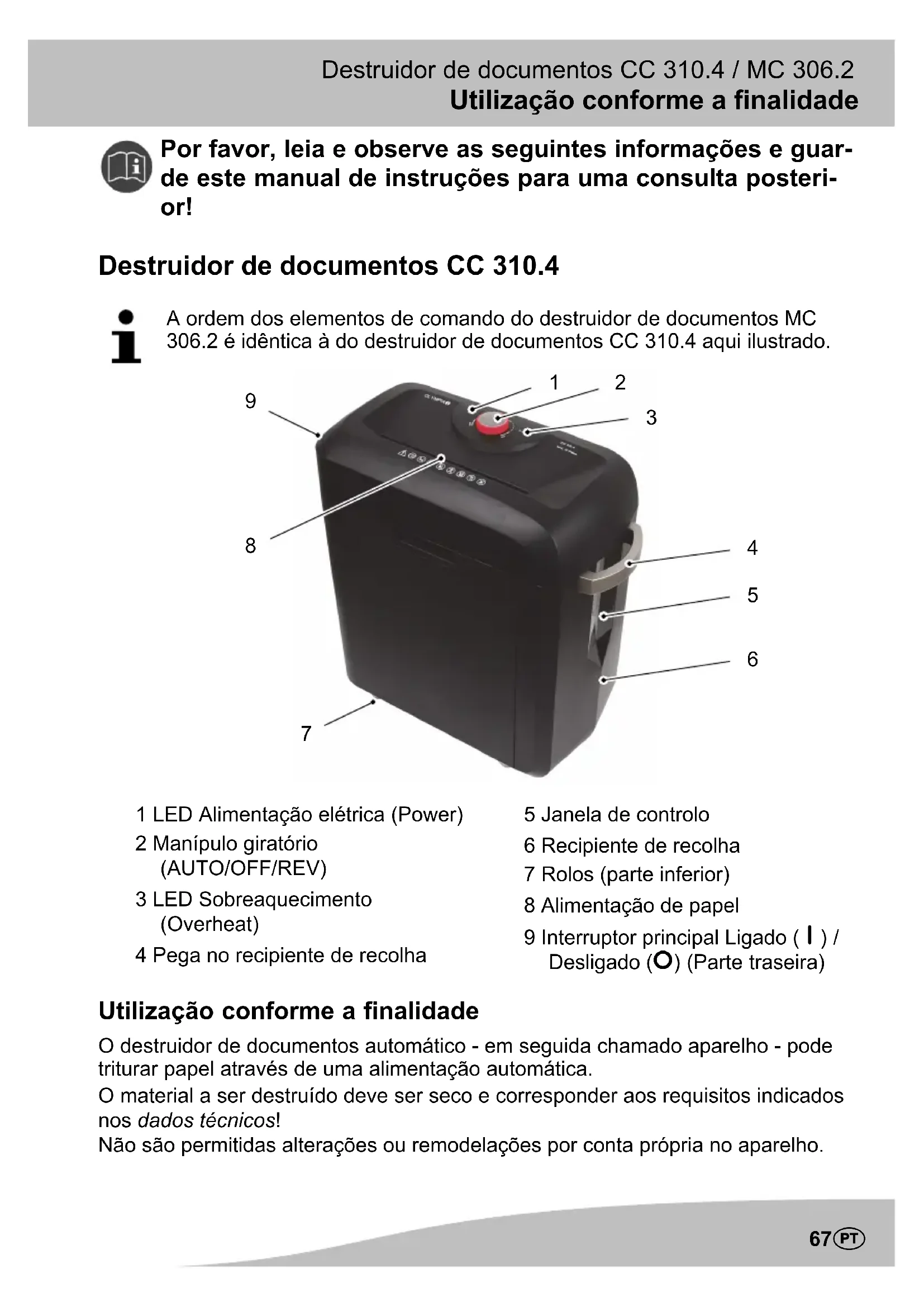1 LED Alimentação elétrica (Power) 2 Manípulo giratório (AUTO/OFF/REV) 3 LED Sobreaquecimento (Overheat) 4 Pega no recipiente de recolha 5 Janela de controlo 6 Recipiente de recolha 7 Rolos (parte inferior) 8 Alimentação de papel 9 Interruptor principal Ligado (⏽) / Desligado (⭘) (Parte traseira) Utilização conforme a finalidade O destruidor de documentos automático - em seguida chamado aparelho - pode triturar papel através de uma alimentação automática. O material a ser destruído deve ser seco e corresponder aos requisitos indicados nos dados técnicos! Não são permitidas alterações ou remodelações por conta própria no aparelho.Avisos Destruidor de documentos CC 310.4 / MC 306.2 68 P Em caso algum abra o aparelho e nunca realize tentativas de reparação por sua conta. Utilização não conforme à finalidade O destruidor de documentos automático não serve para destruir material, que não corresponde aos requisitos indicados nos dados técnicos (p.ex. papelão). Qualquer utilização diferente das descritas em Utilização prevista conta como não prevista. Avisos As seguintes avisos de segurança têm validade para a totalidade do documento. Leia e tenha em conta os avisos de segurança de form a proteger-se e a proteger o meio ambiente.
