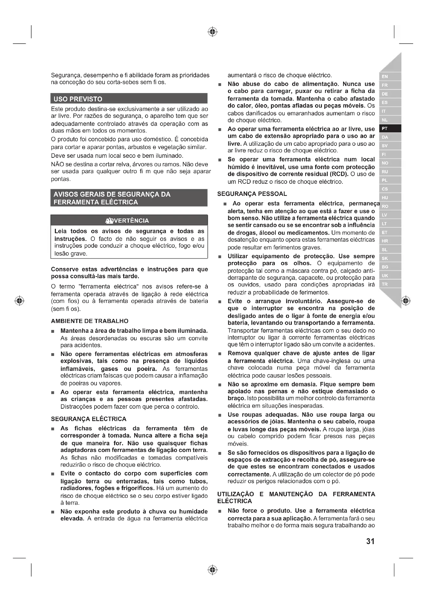 Segurança, desempenho e fi abilidade foram as prioridades na conceção do seu corta-sebes sem fi os. USO PREVISTO Este produto destina-se exclusivamente a ser utilizado ao ar livre. Por razões de segurança, o aparelho tem que ser adequadamente controlado através da operação com as duas mãos em todos os momentos. O produto foi concebido para uso doméstico. É concebida para cortar e aparar pontas, arbustos e vegetação similar. Deve ser usada num local seco e bem iluminado. NÃO se destina a cortar relva, árvores ou ramos. Não deve ser usada para qualquer outro fi m que não seja aparar pontas.
