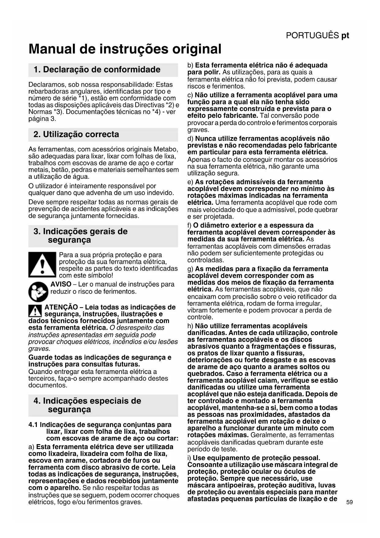 Manual de instruções original Declaramos, sob nossa responsabilidade: Estas rebarbadoras angulares, identificadas por tipo e número de série *1), estão em conformidade com todas as disposições aplicáveis das Directivas *2) e Normas *3). Documentações técnicas no *4) - ver página 3. As ferramentas, com acessórios originais Metabo, são adequadas para lixar, lixar com folhas de lixa, trabalhos com escovas de arame de aço e cortar metais, betão, pedras e materiais semelhantes sem a utilização de água. O utilizador é inteiramente responsável por qualquer dano que advenha de um uso indevido. Deve sempre respeitar todas as normas gerais de prevenção de acidentes aplicáveis e as indicações de segurança juntamente fornecidas. Para a sua própria proteção e para proteção da sua ferramenta elétrica, respeite as partes do texto identificadas com este símbolo! AVISO – Ler o manual de instruções para reduzir o risco de ferimentos. ATENÇÃO – Leia todas as indicações de segurança, instruções, ilustrações e dados técnicos fornecidos juntamente com esta ferramenta elétrica. O desrespeito das instruções apresentadas em seguida pode provocar choques elétricos, incêndios e/ou lesões graves. Guarde todas as indicações de segurança e instruções para consultas futuras. Quando entregar esta ferramenta elétrica a terceiros, faça-o sempre acompanhado destes documentos.