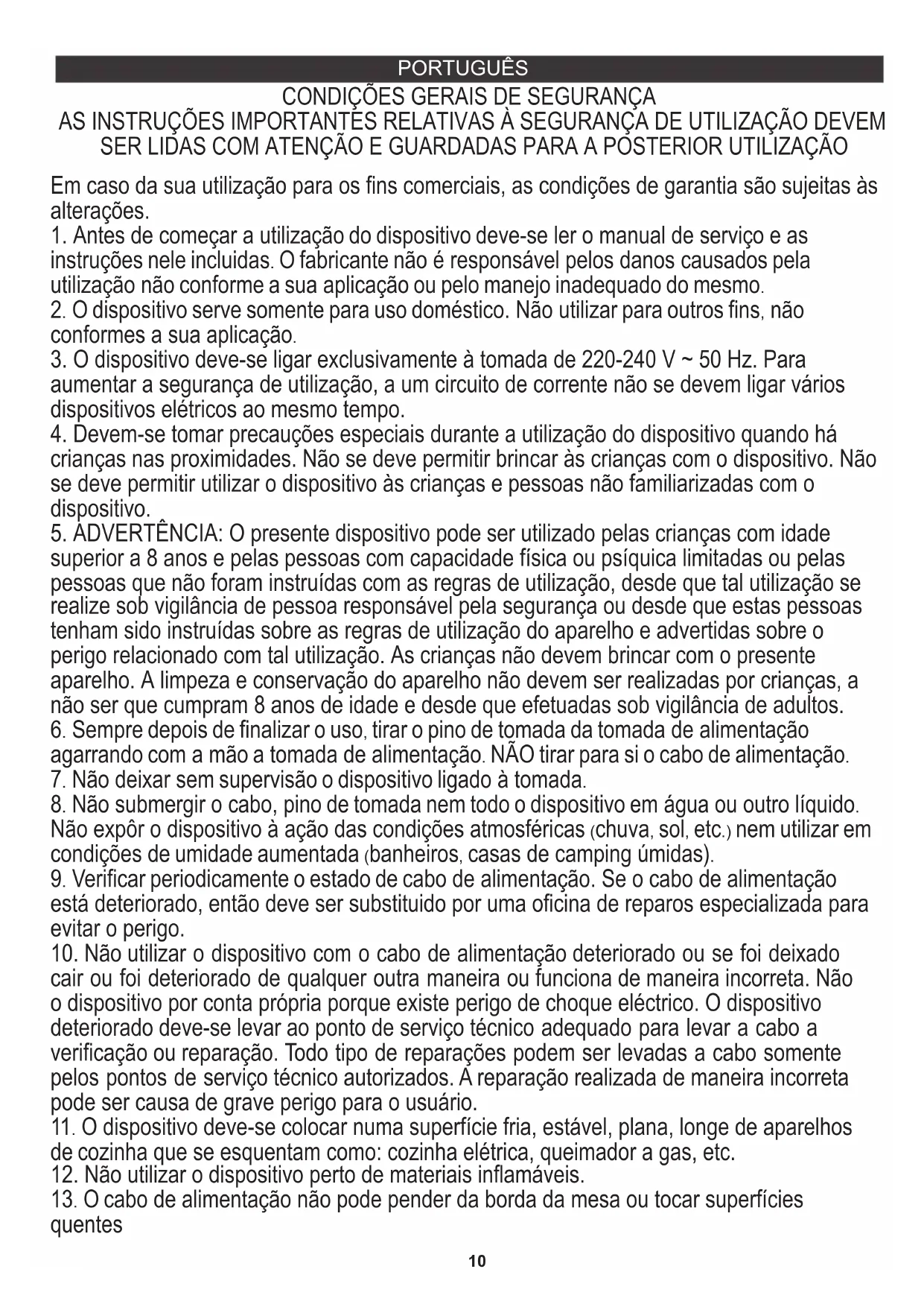 10. Não utilizar o dispositivo com o cabo de alimentação deteriorado ou se foi deixado