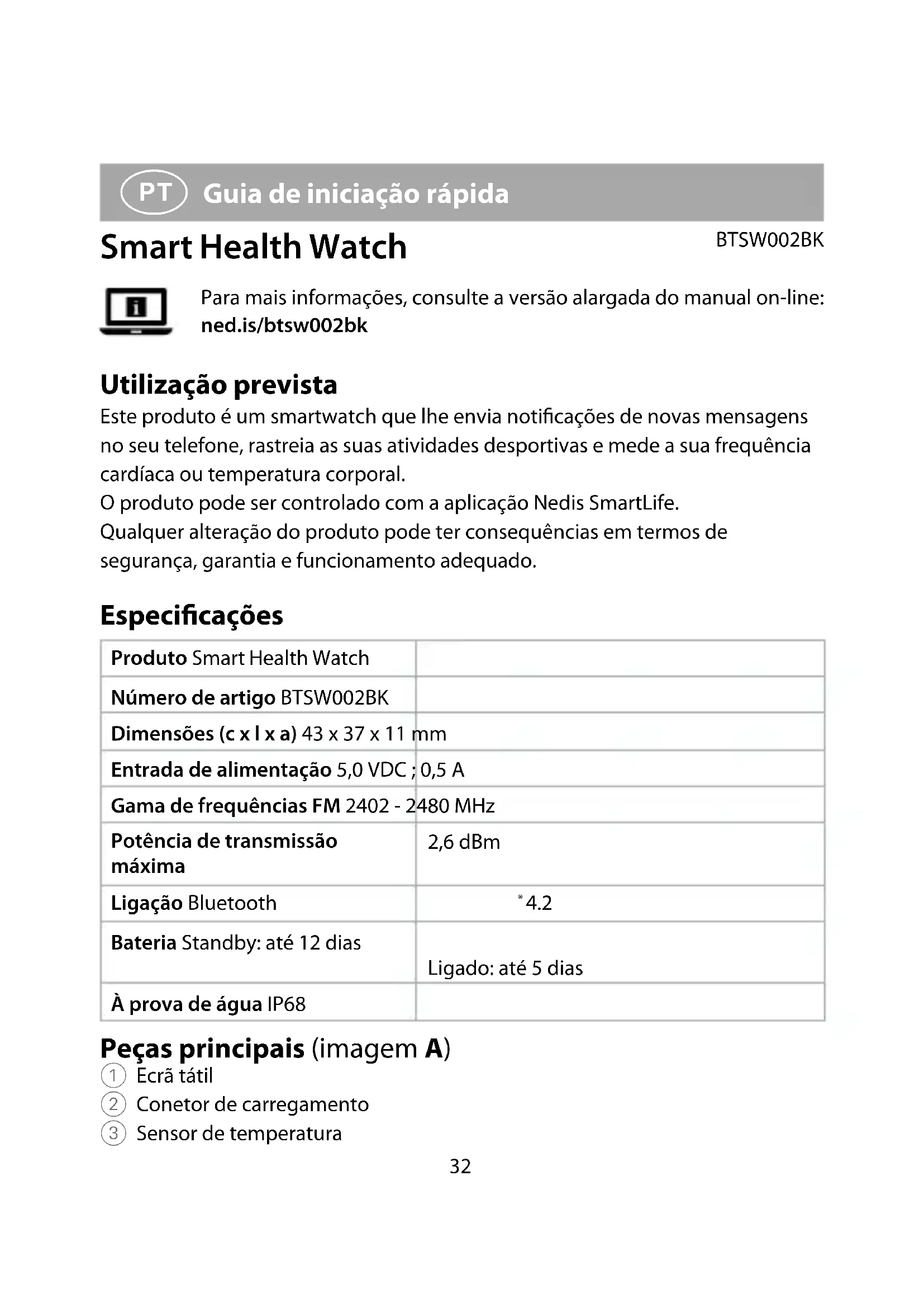 Guia de iniciação rápida Smart Health Watch BTSW002BK Para mais informações, consulte a versão alargada do manual on-line: ned.is/btsw002bk Utilização prevista Este produto é um smartwatch que lhe envia noticações de novas mensagens no seu telefone, rastreia as suas atividades desportivas e mede a sua frequência cardíaca ou temperatura corporal. O produto pode ser controlado com a aplicação Nedis SmartLife. Qualquer alteração do produto pode ter consequências em termos de segurança, garantia e funcionamento adequado. Especicações Produto Smart Health Watch Número de artigo BTSW002BK Dimensões (c x l x a) 43 x 37 x 11 mm Entrada de alimentação 5,0 VDC ; 0,5 A Gama de frequências FM 2402 - 2480 MHz Potência de transmissão máxima 2,6 dBm Ligação Bluetooth